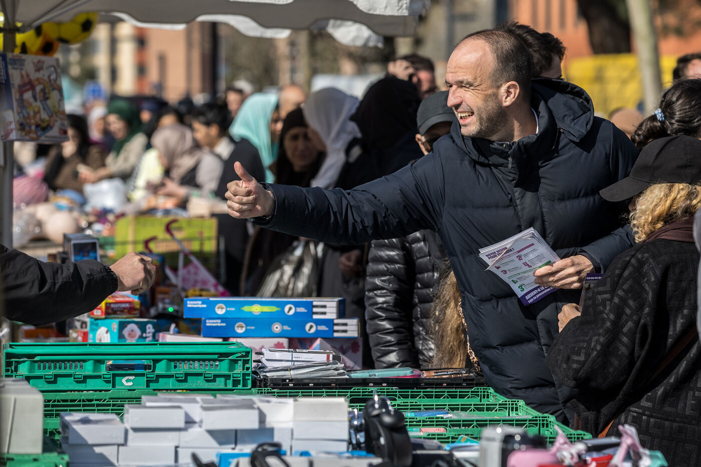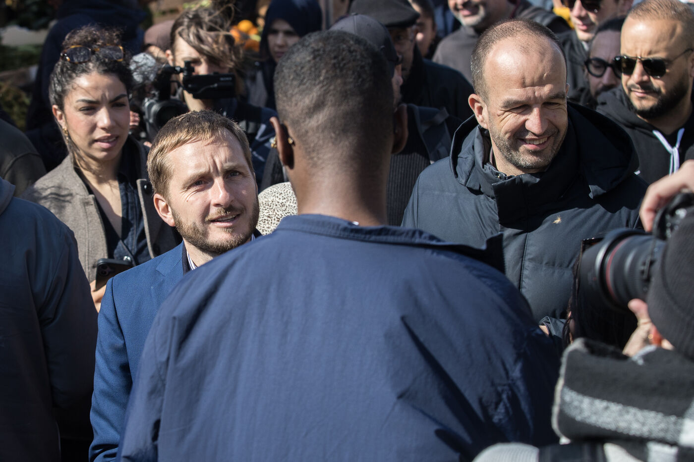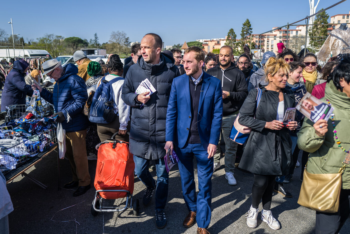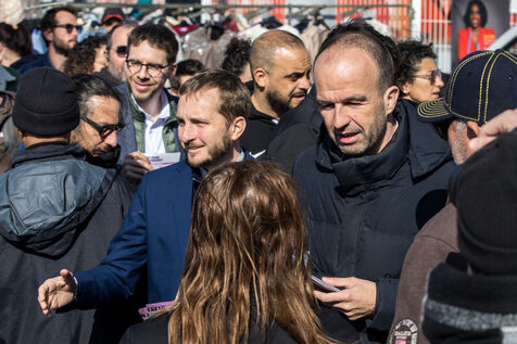 Francois Piquemal candidat a l election municipale de Toulouse et Manuel Bompard Coordinateur de l equipe operationnelle et depute de La France Insoumise, LFI, lors d un deplacement Place Abbal dans le quartier populaire de la Reynerie au Mirail pour tracter sur un marche avant le second tour des elections municipales prevues le 22 mars prochain face a Jean Luc Moudenc, l actuel Maire de Toulouse.