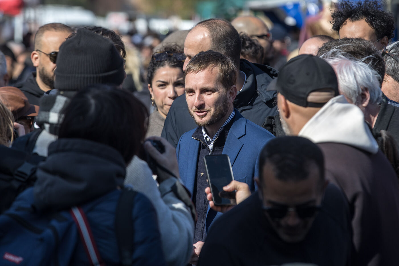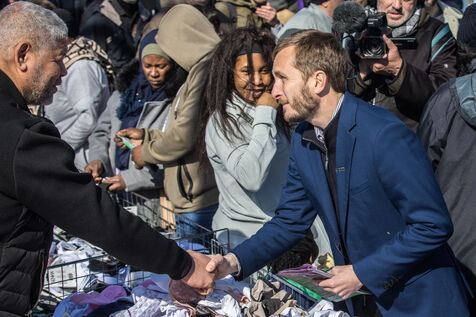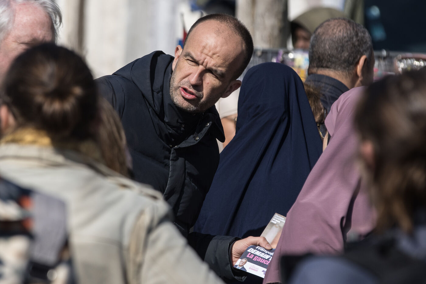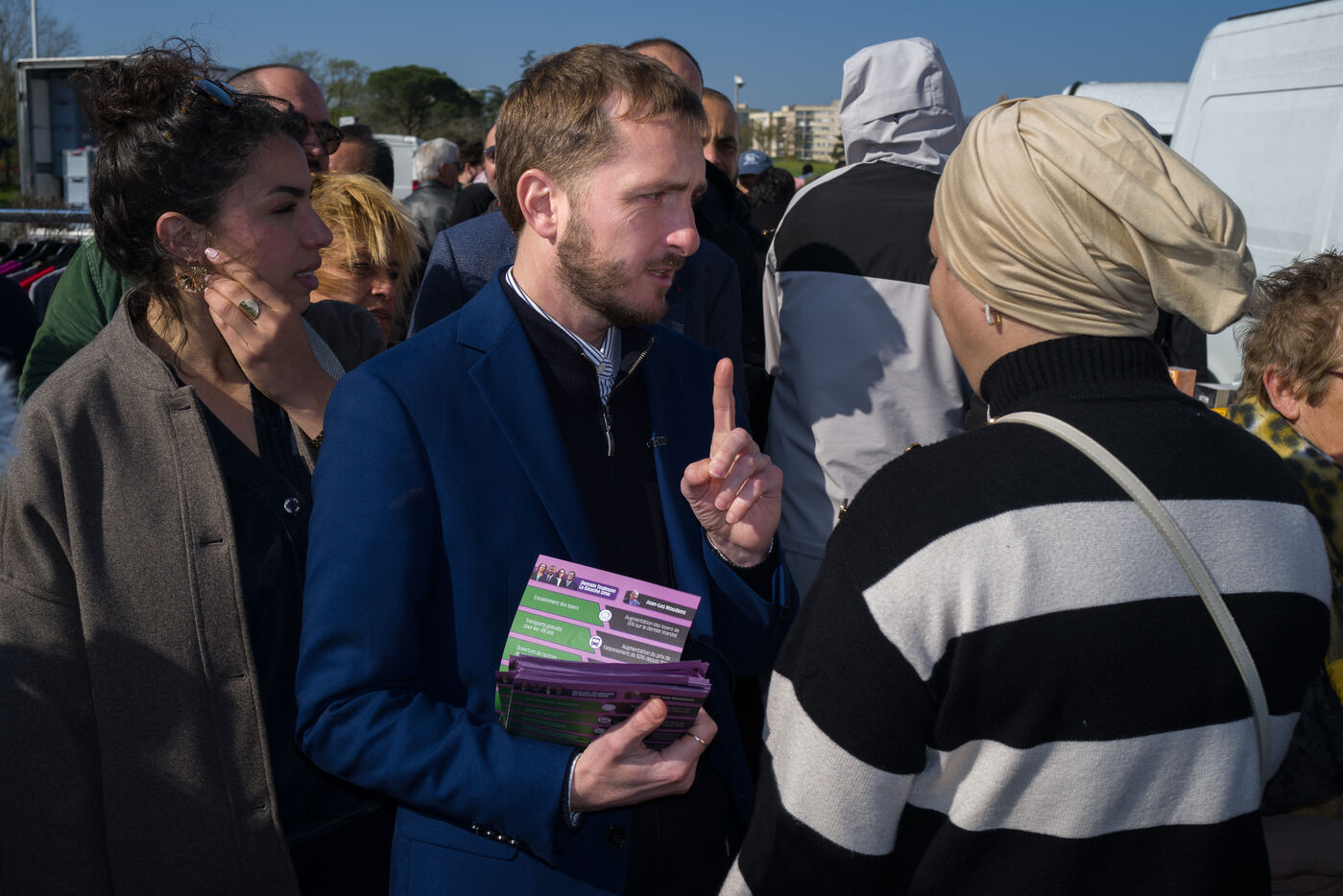 Francois Piquemal candidat a l election municipale de Toulouse et Manuel Bompard Coordinateur de l equipe operationnelle et depute de La France Insoumise, LFI, lors d un deplacement Place Abbal dans le quartier populaire de la Reynerie au Mirail pour tracter sur un marche avant le second tour des elections municipales prevues le 22 mars prochain face a Jean Luc Moudenc, l actuel Maire de Toulouse.