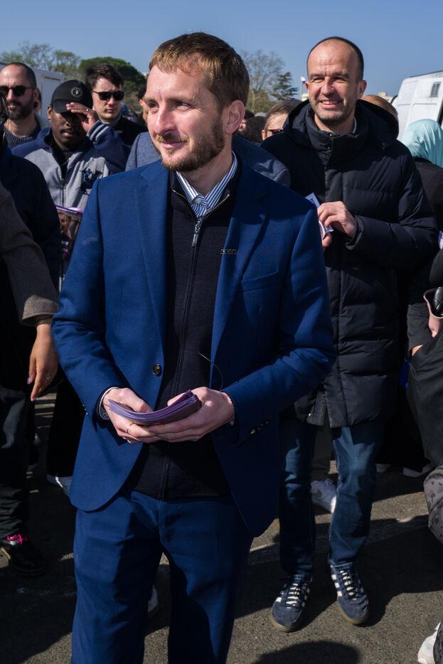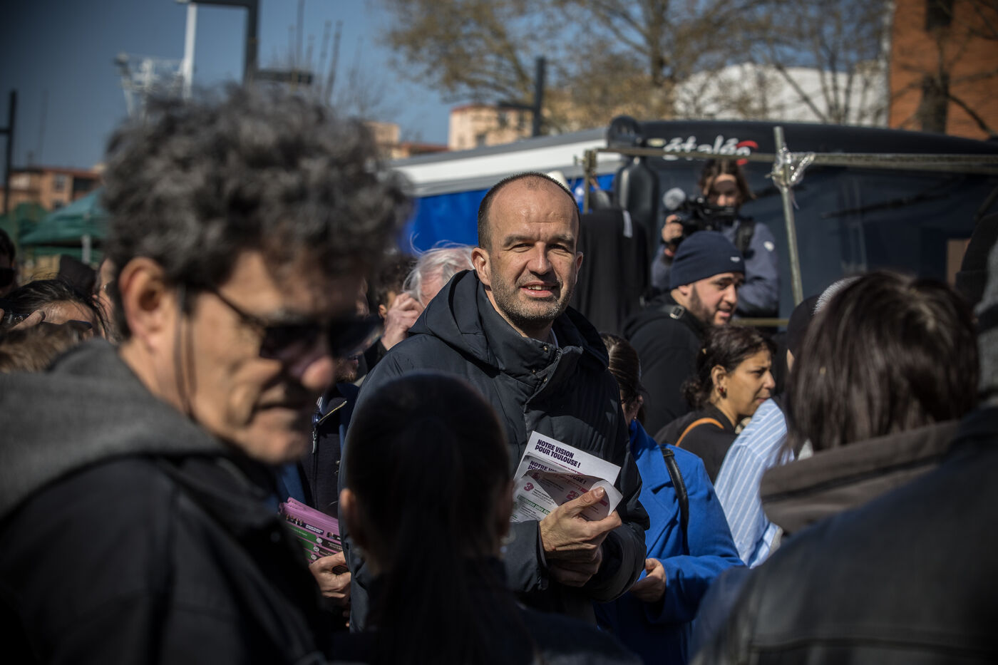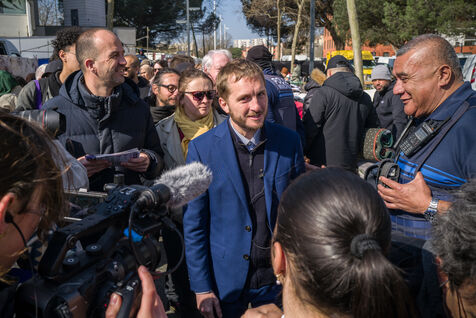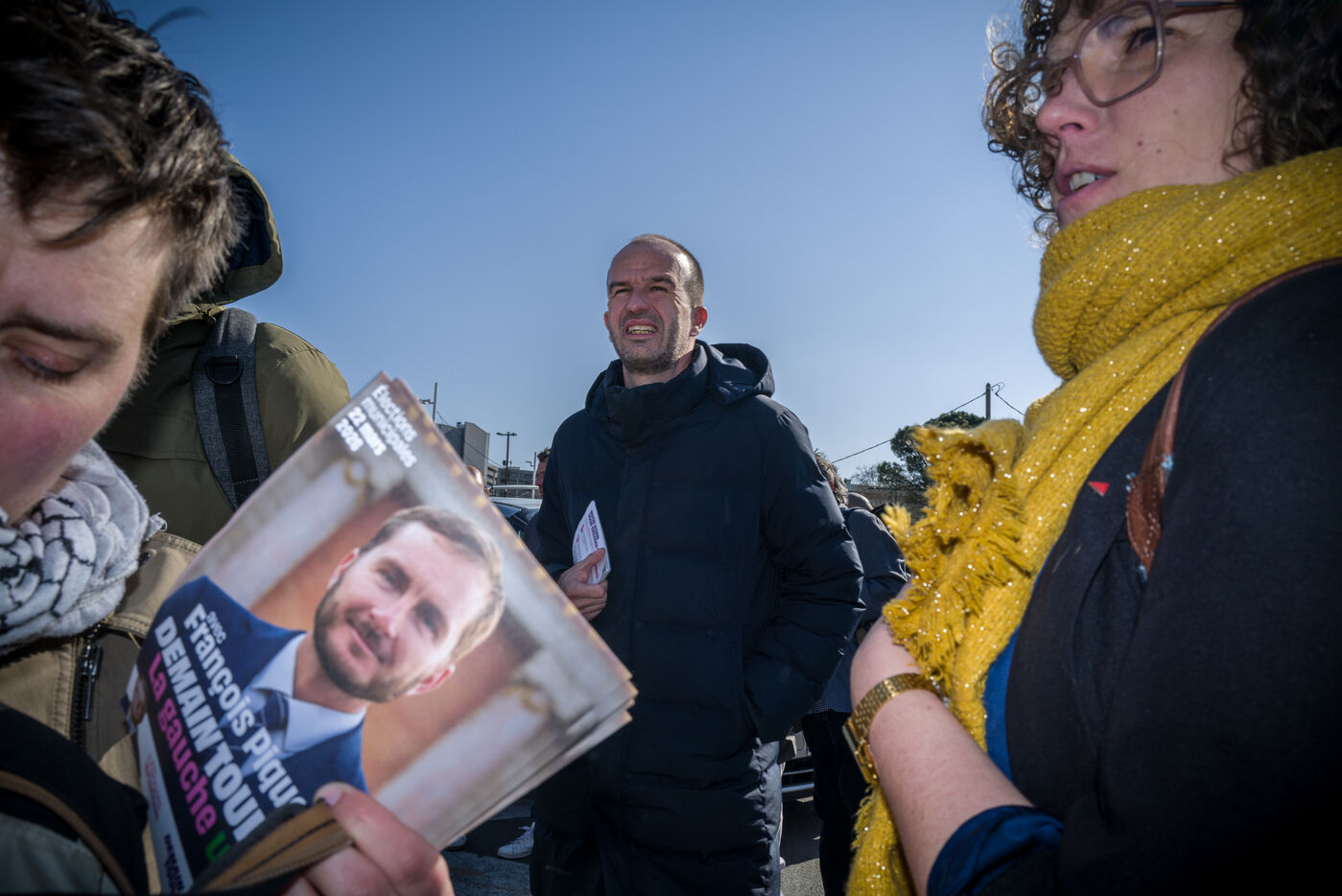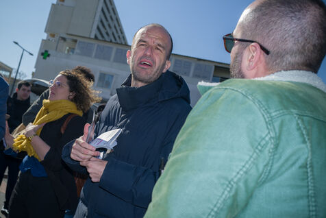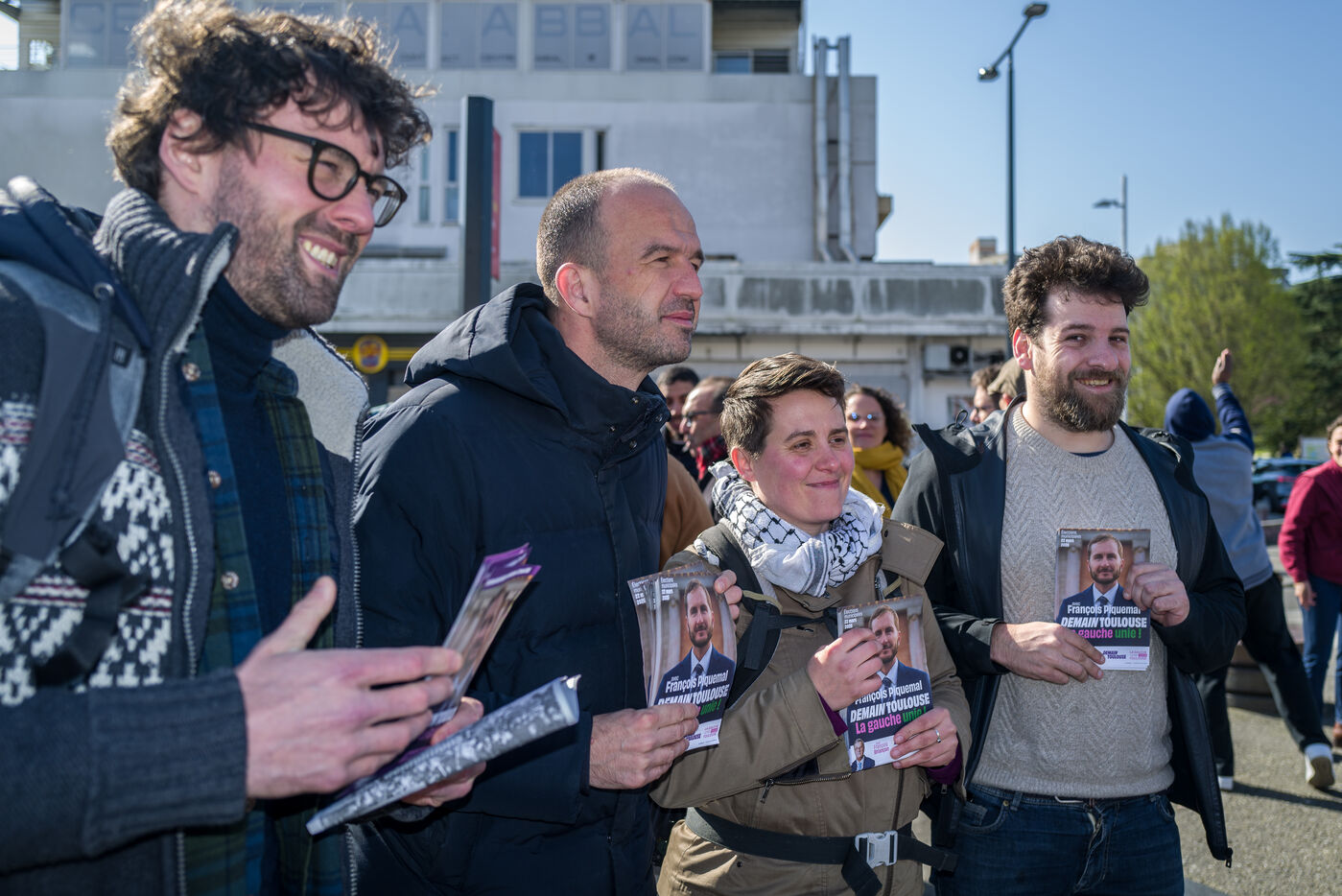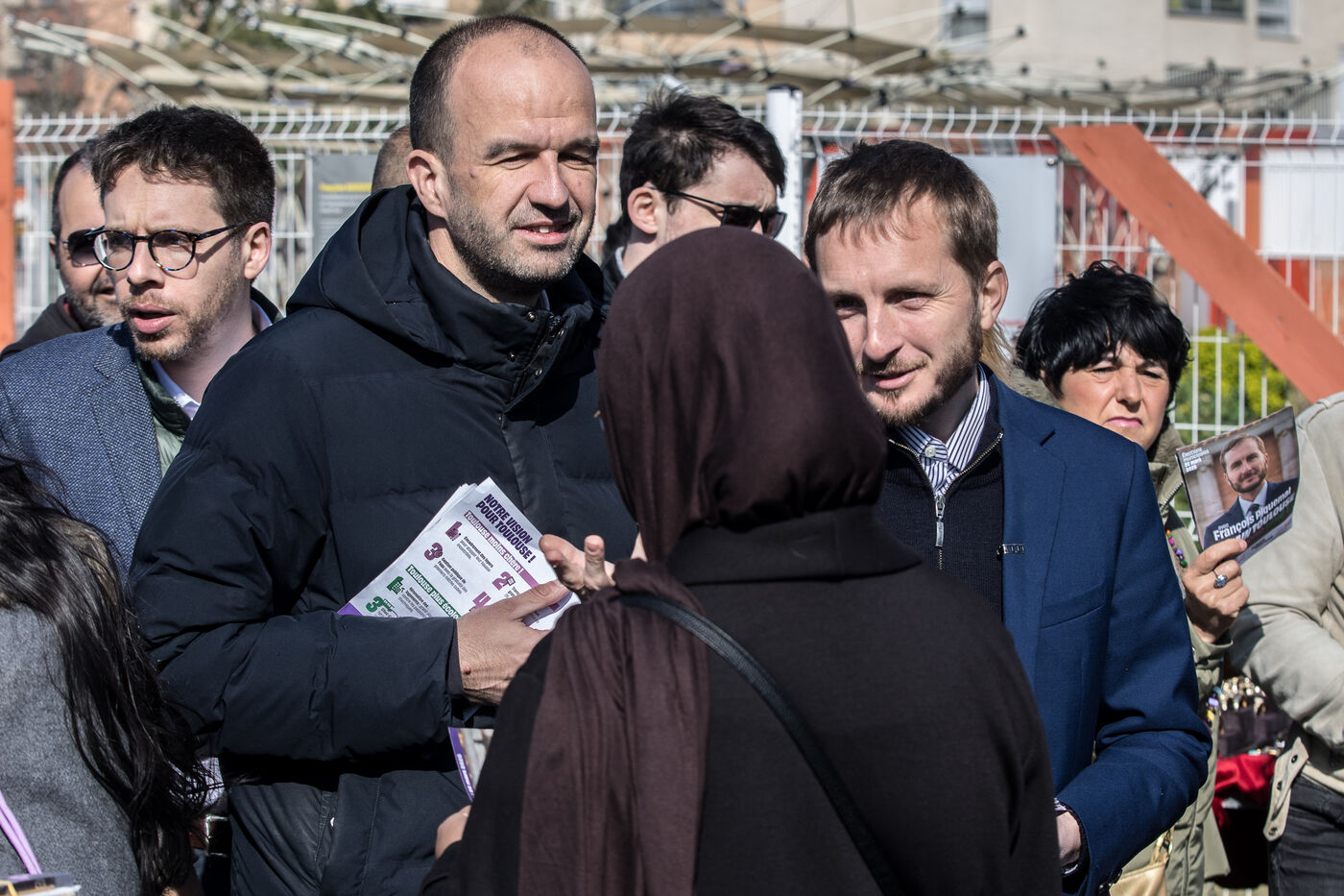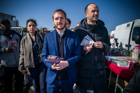 Francois Piquemal , candidate for the Toulouse municipal election, and Manuel Bompard, coordinator of the operational team and member of parliament for La France Insoumise (LFI), during a campaign visit to Place Abbal in the working-class Reynerie district of Mirail, where they were handing out leaflets before the second round of the municipal elections scheduled for March 22nd against Jean-Luc Moudenc, the current Mayor of Toulouse.