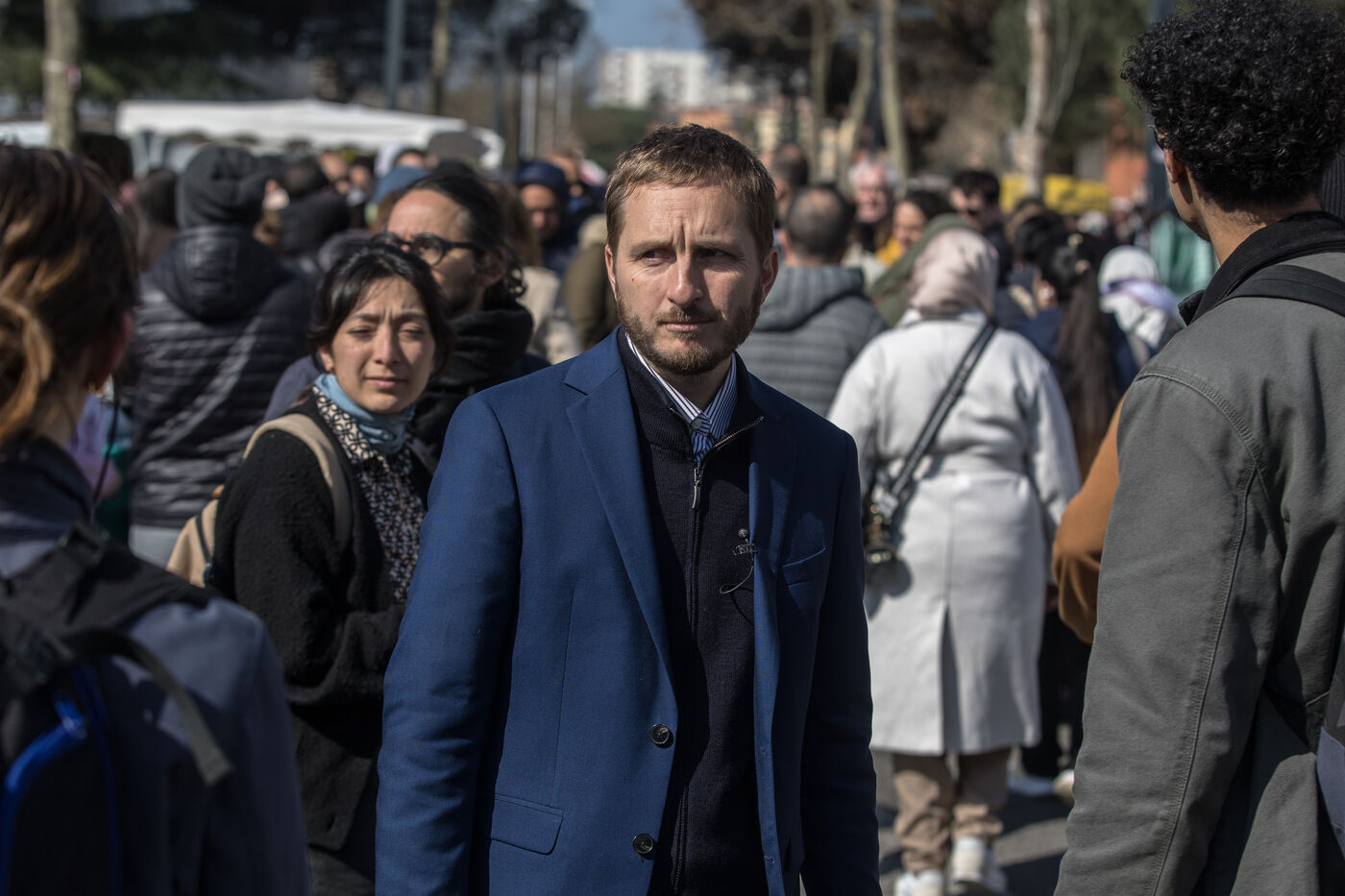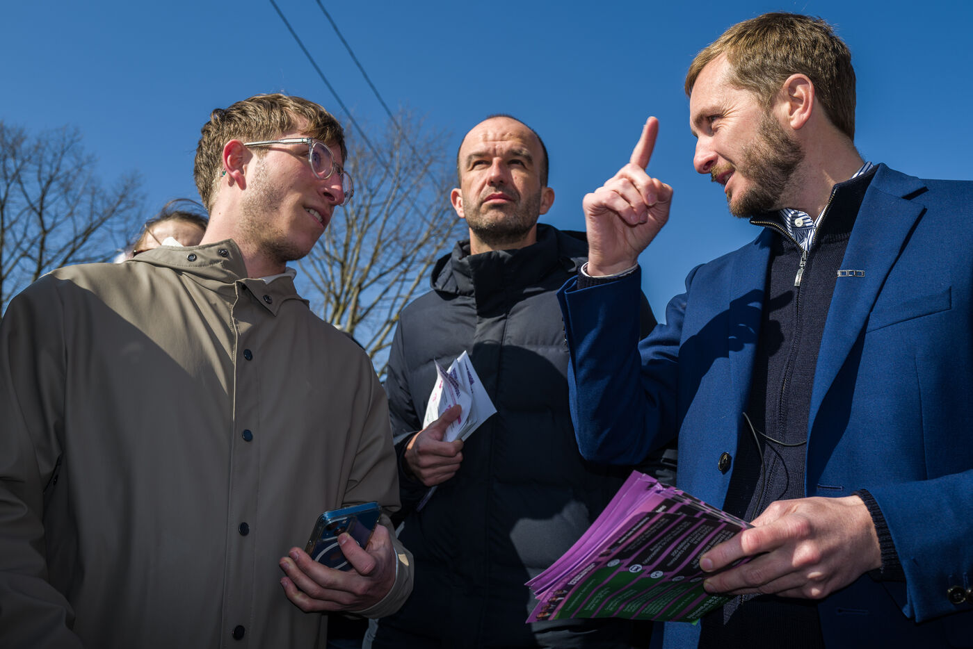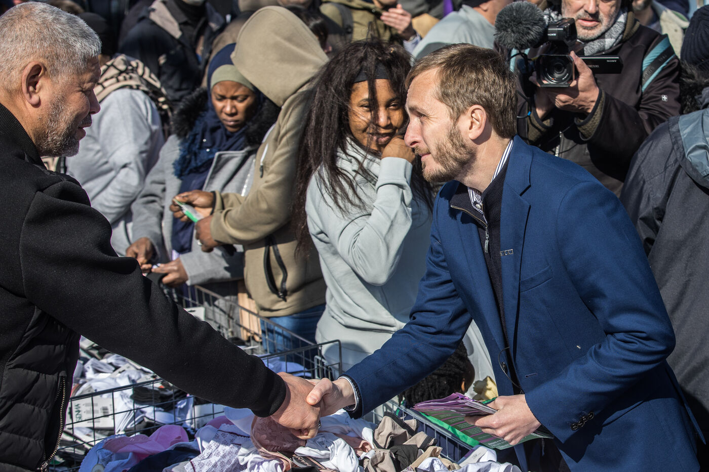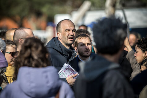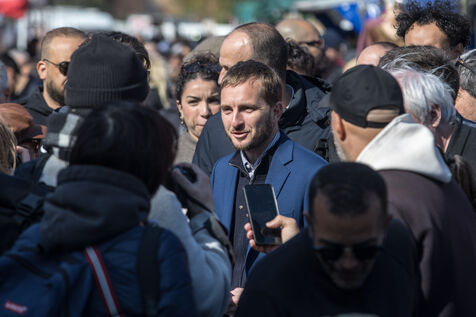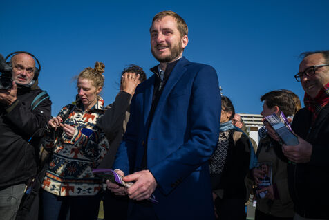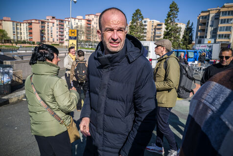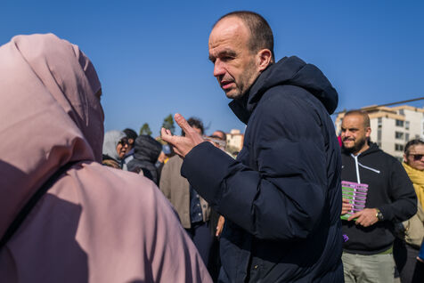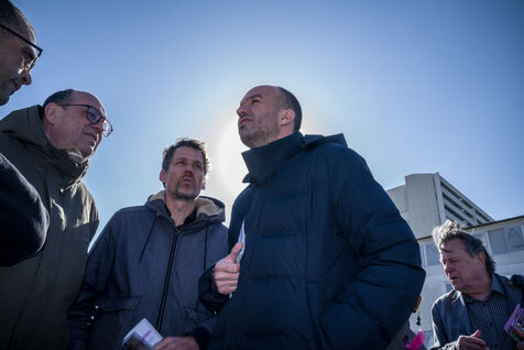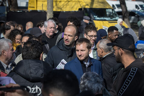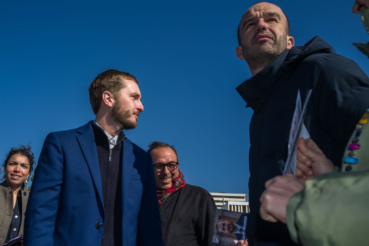 Francois Piquemal , candidate for the Toulouse municipal election, and Manuel Bompard, coordinator of the operational team and member of parliament for La France Insoumise (LFI), during a campaign visit to Place Abbal in the working-class Reynerie district of Mirail, where they were handing out leaflets before the second round of the municipal elections scheduled for March 22nd against Jean-Luc Moudenc, the current Mayor of Toulouse.