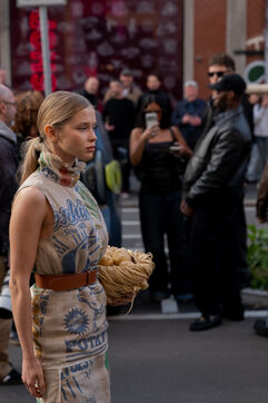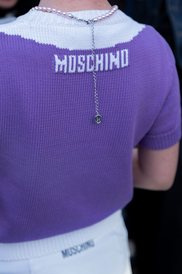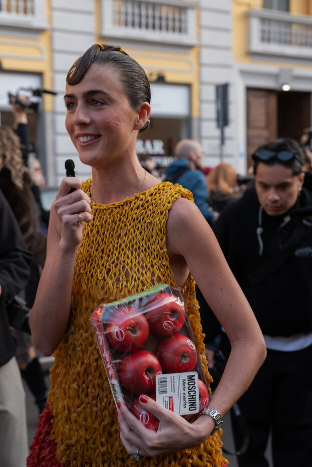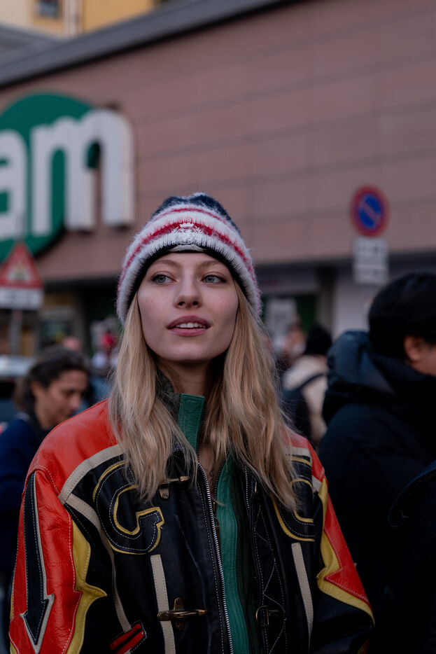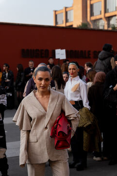 Photographies de street style réalisées à la sortie du défilé Moschino lors de la Fashion Week de Milan, le 27 février 2026.