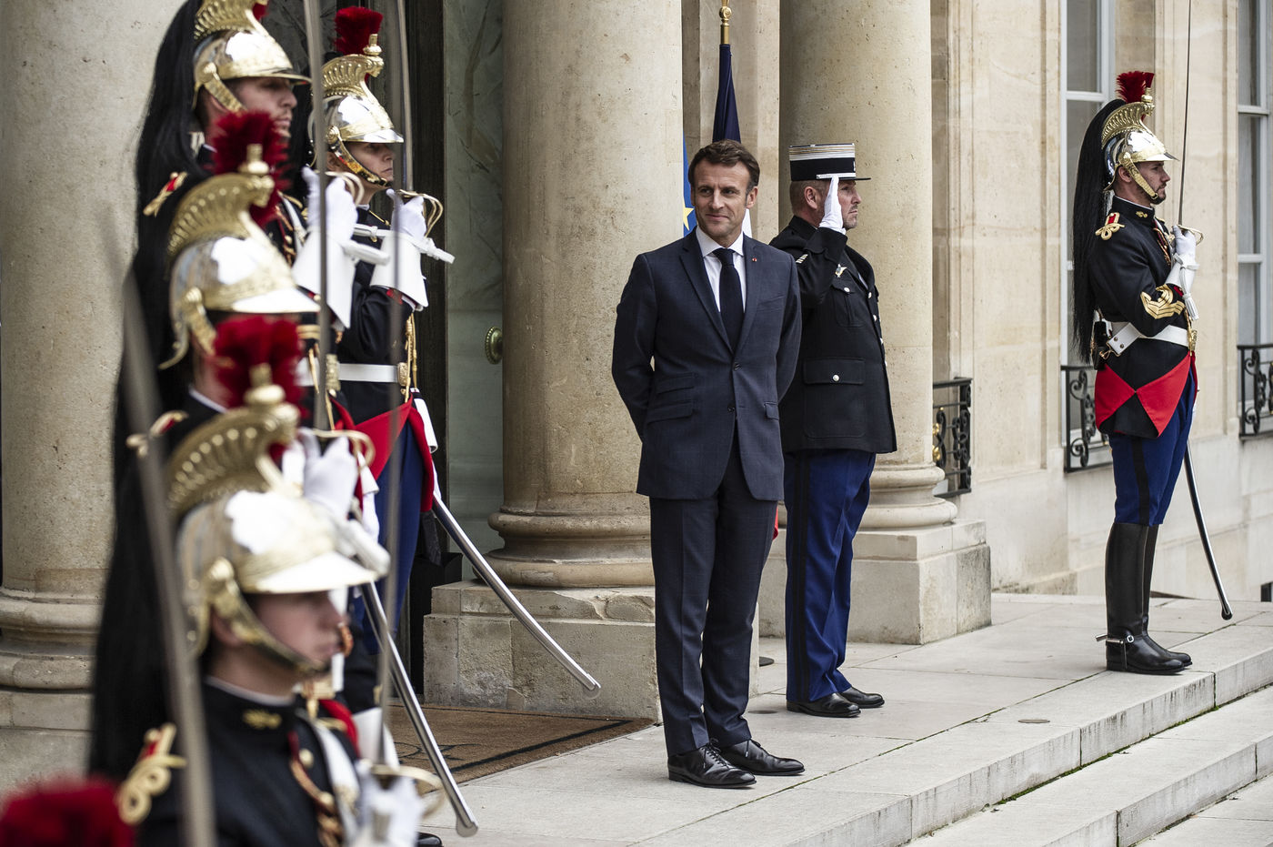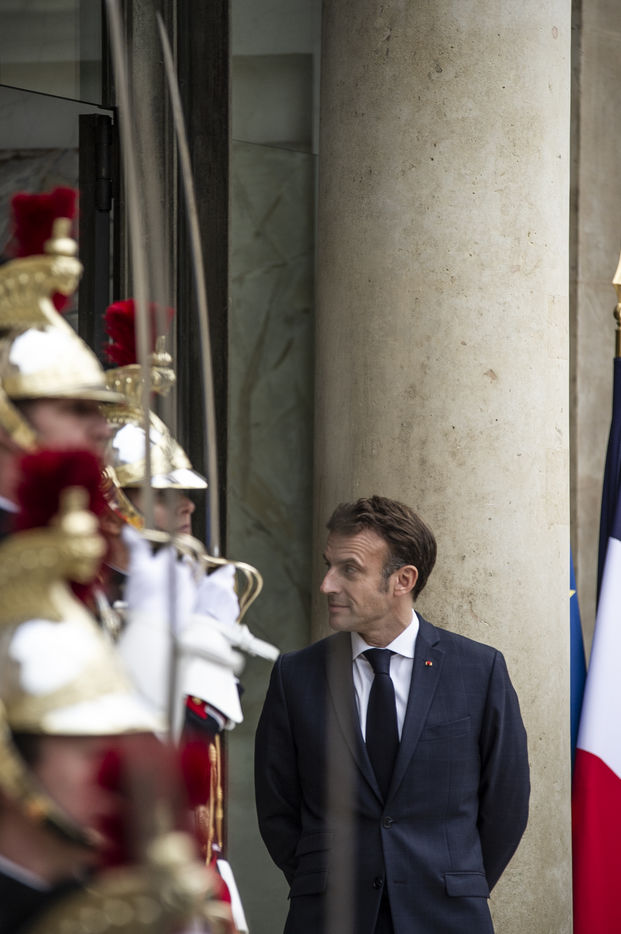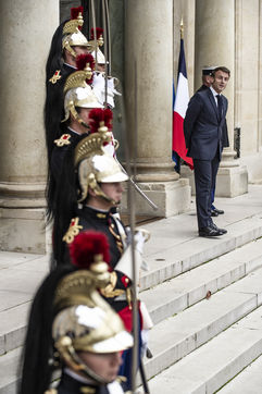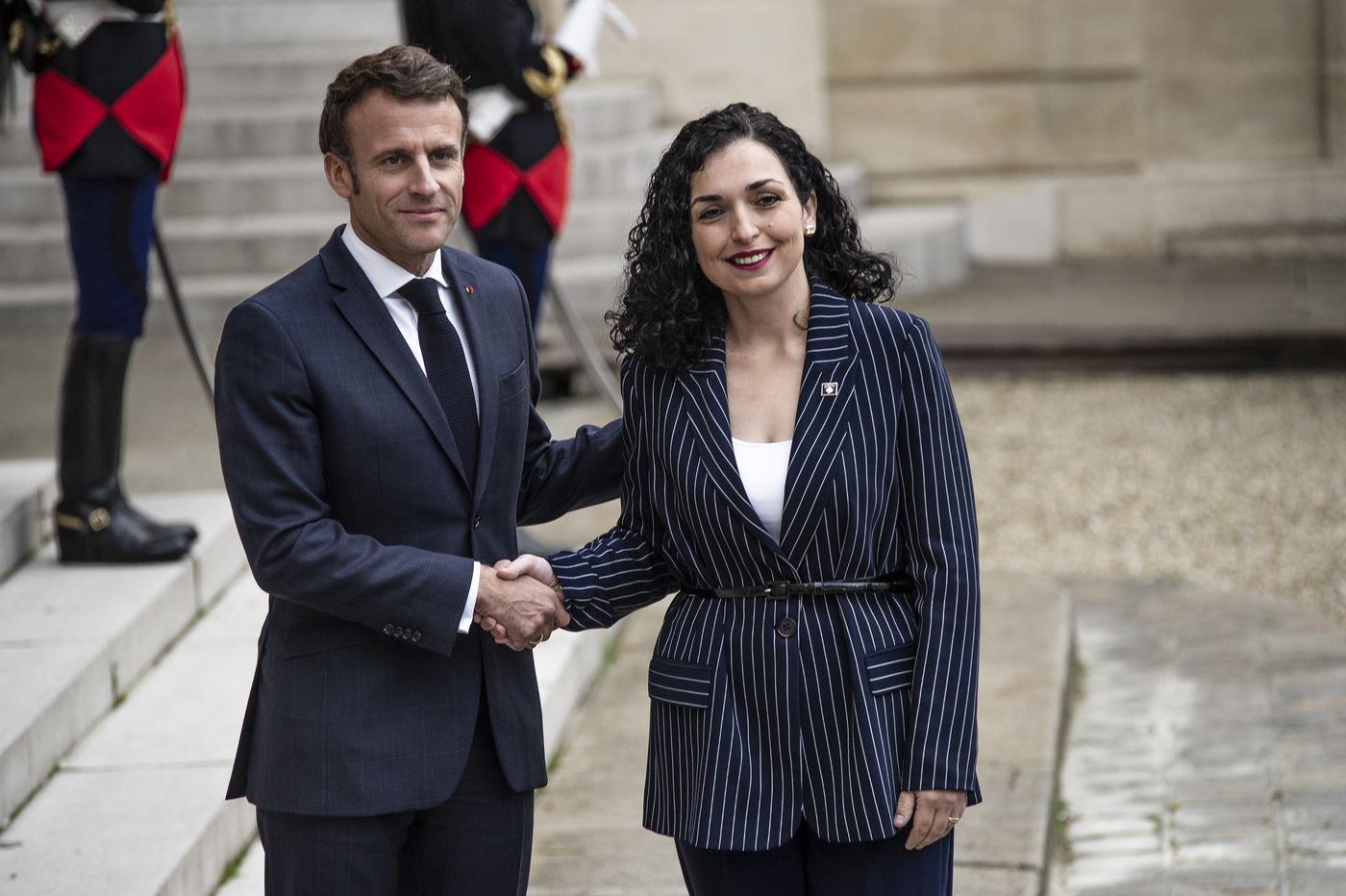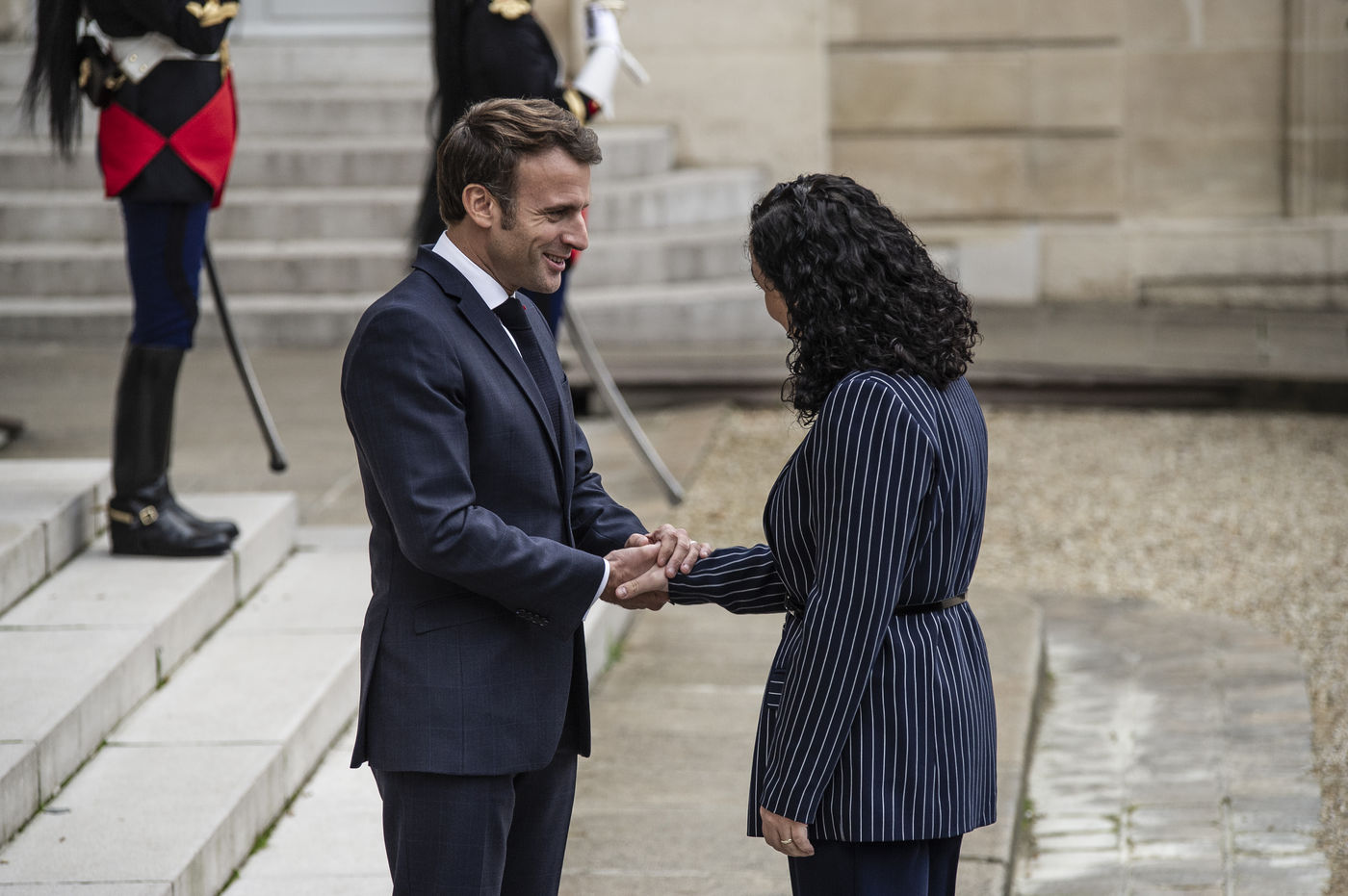 Vjosa Osmani présidente de la République du Kosovo au forum de la paix, accueili par Emanuel Macron, président de la République française. dans la cours du palais de l'Elysée.