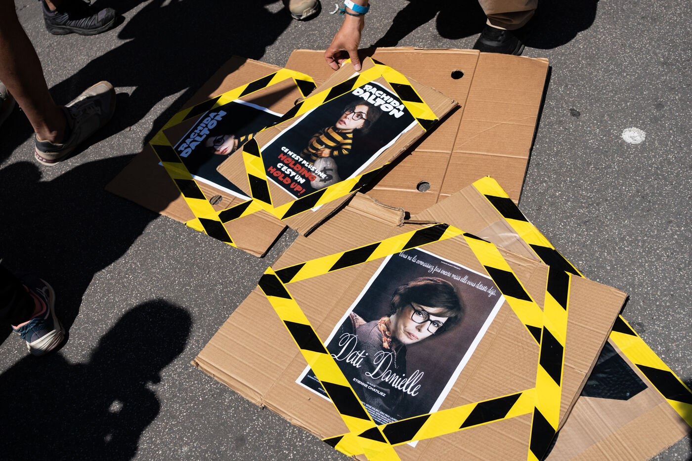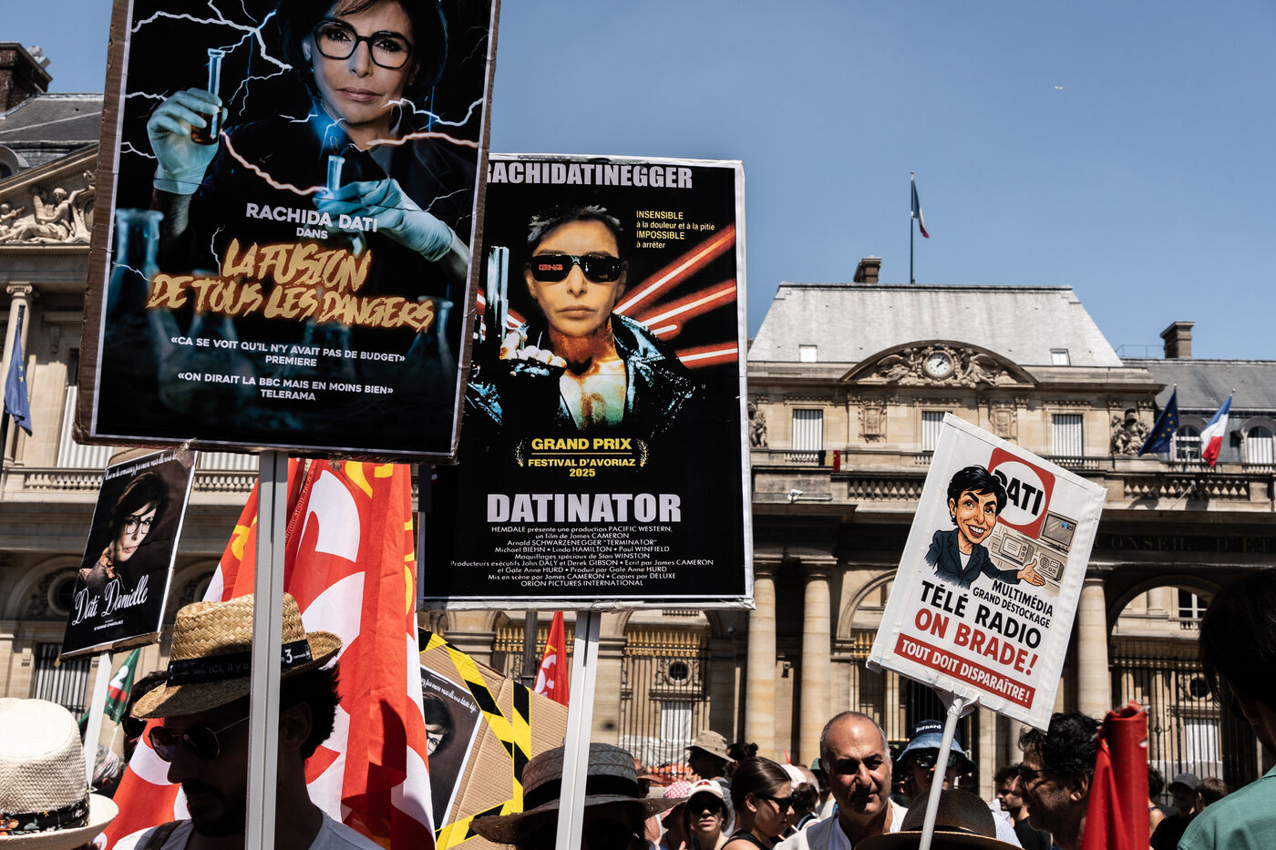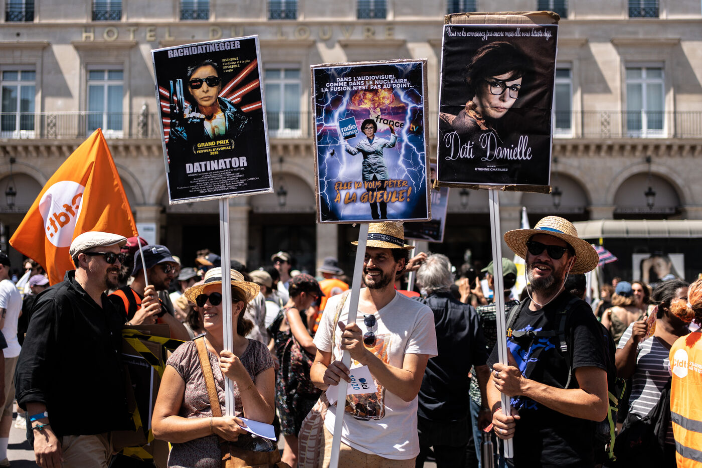 Manifestation contre la réforme de l’audiovisuel public appelée par la CGT, les salariés en grève de Radio France, France Télévisions, l’INA et France Médias Monde. Ce texte de loi défendu par la ministre de la Culture Rachida Dati est examiné à l’Assemblée Nationale ce lundi 30 juin.