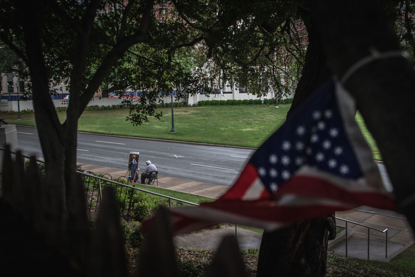 Through this series of photographs taken on April 30, 2019, the atmosphere of this memory-laden site is captured with precision. From the heights of Reunion Tower, the view embraces the city and the place where everything unfolded. The Texas School Book Depository, now transformed into a museum, recalls the presumed position of the shooter, Lee Harvey Oswald. A few meters away, a simple white cross on the asphalt marks the exact spot where Kennedy was fatally shot, while an American flag fluttering on a fence seems to stand guard over this past, frozen in history.