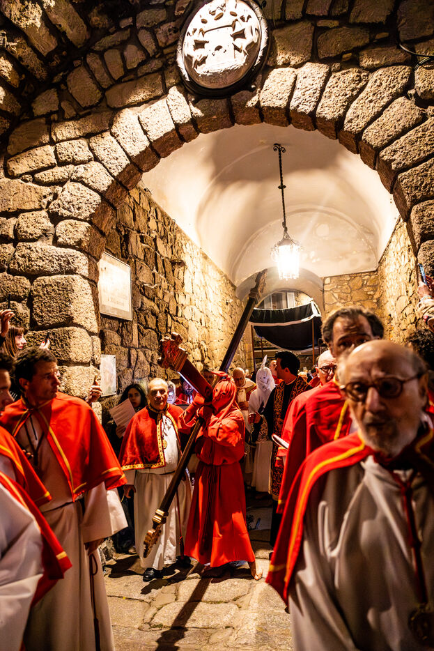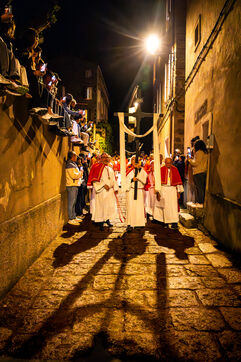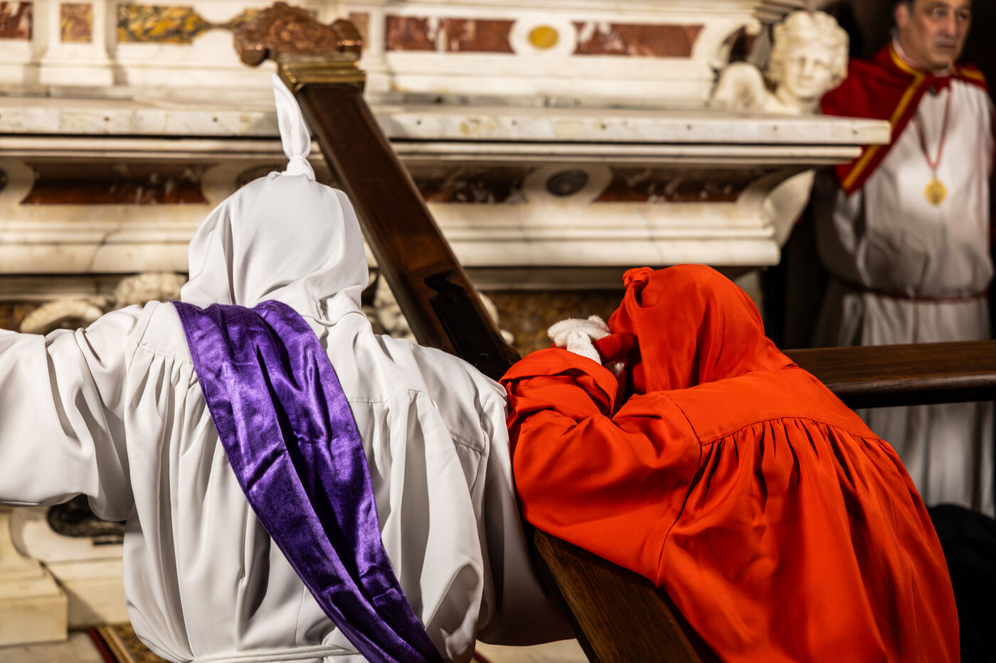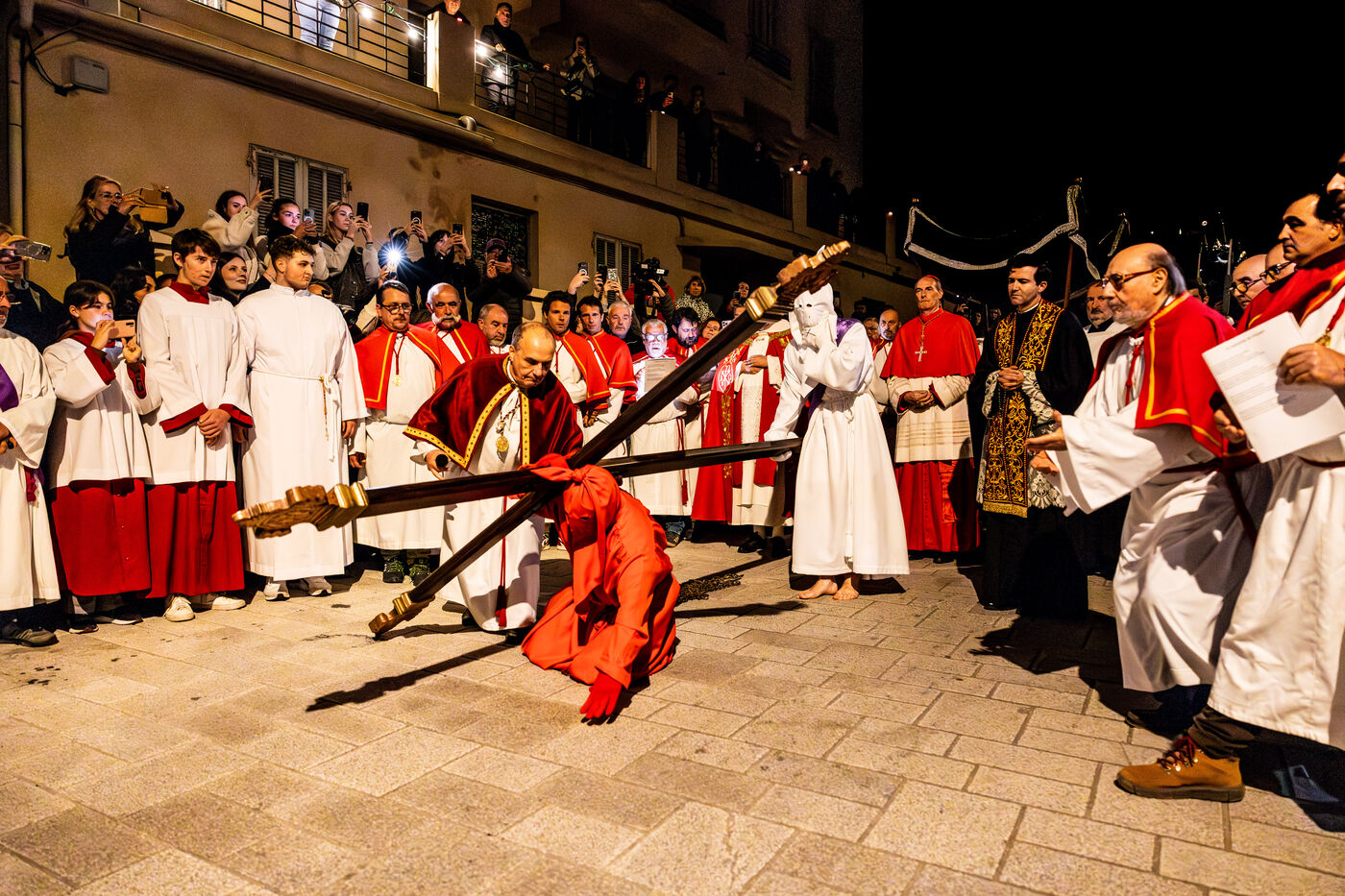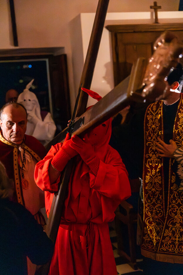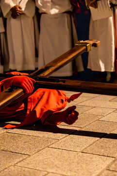 The anonymous red penitent carries the cross and chains. He falls, rises again, supported by the white penitent. Together, they embody the weight of guilt, the effort of redemption, and silent faith. Beside them, the brothers in red capes form a dense procession, paced by chants, silence, and the gravity in their eyes.