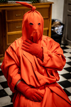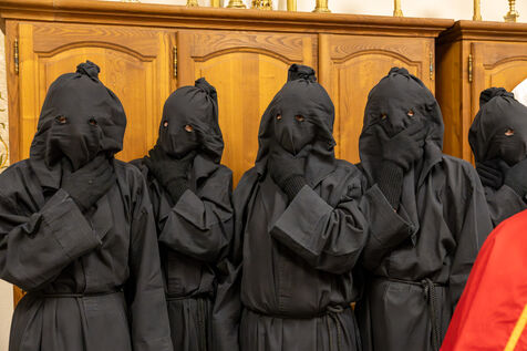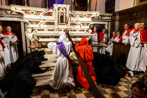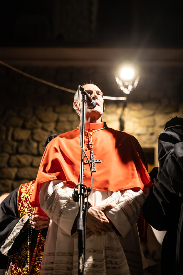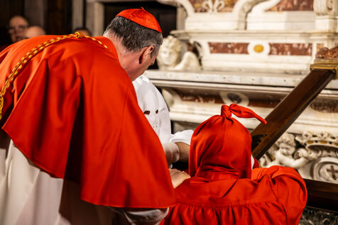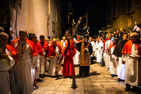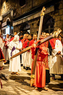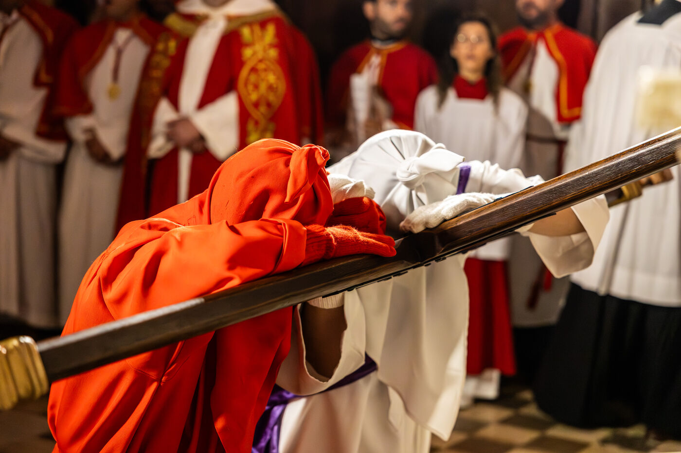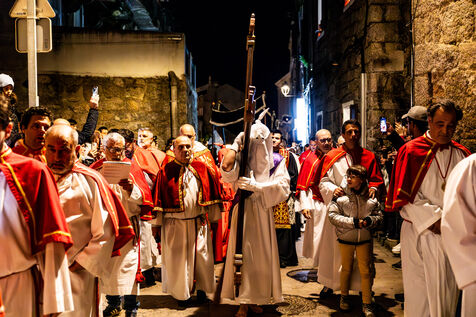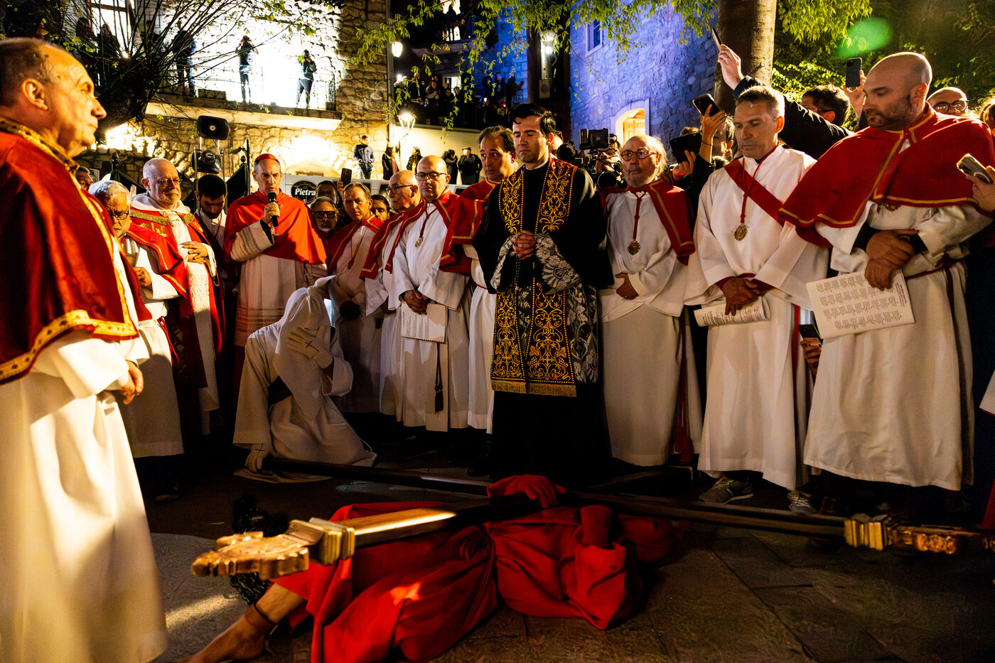The anonymous red penitent carries the cross and chains. He falls, rises again, supported by the white penitent. Together, they embody the weight of guilt, the effort of redemption, and silent faith. Beside them, the brothers in red capes form a dense procession, paced by chants, silence, and the gravity in their eyes.