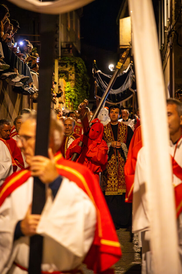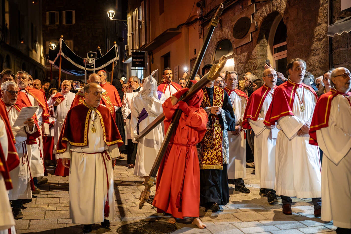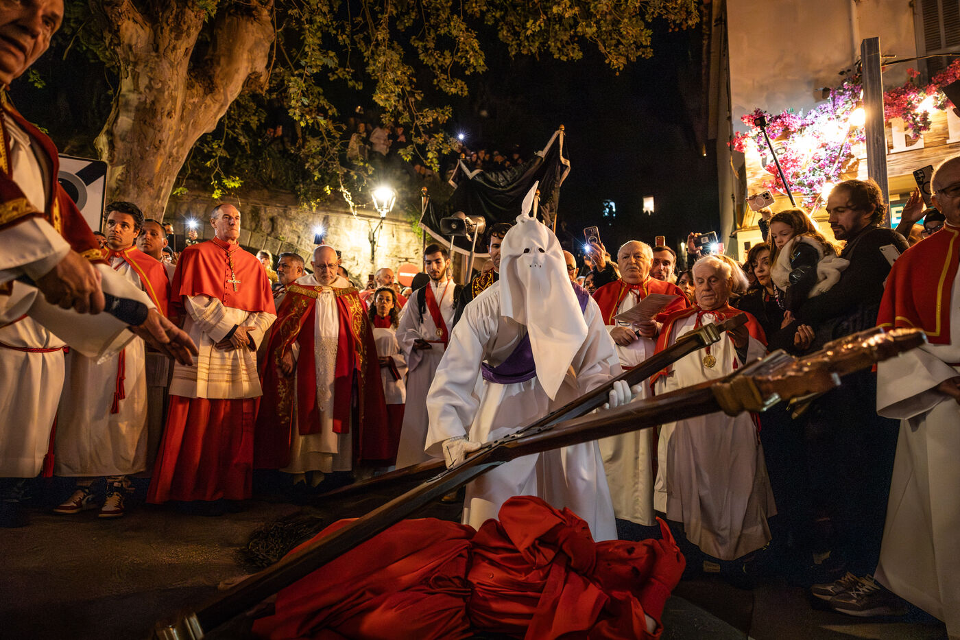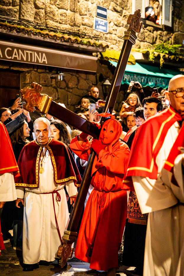 Le pénitent rouge, anonyme, porte la croix et les chaînes. Il chute, se relève, soutenu par le pénitent blanc. Ensemble, ils incarnent le poids de la faute, l’effort de la rédemption et la foi silencieuse. À leurs côtés, les confrères en cape rouge forment une procession dense, rythmée par les chants, le silence, et la gravité des regards.