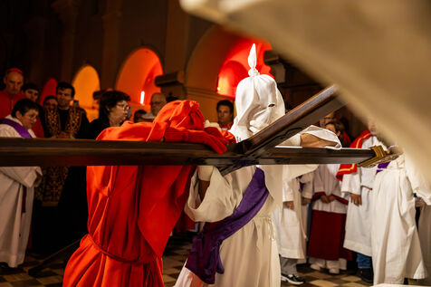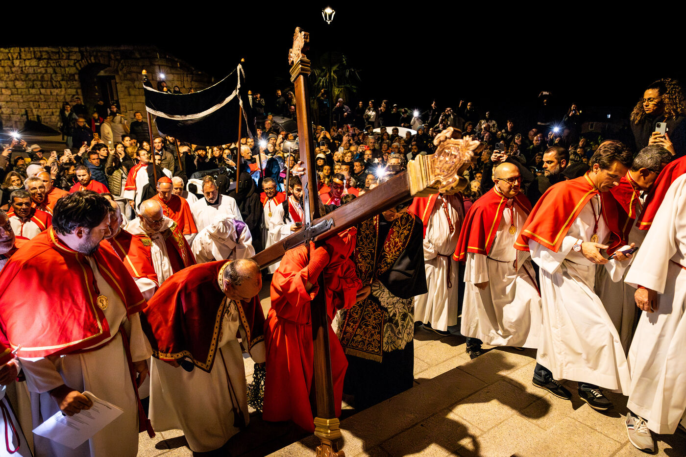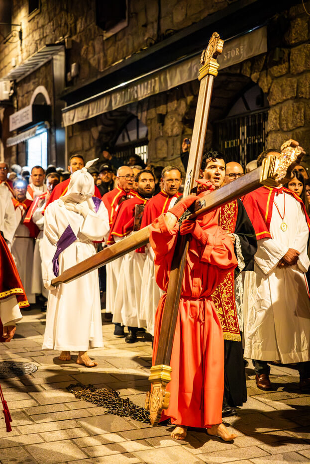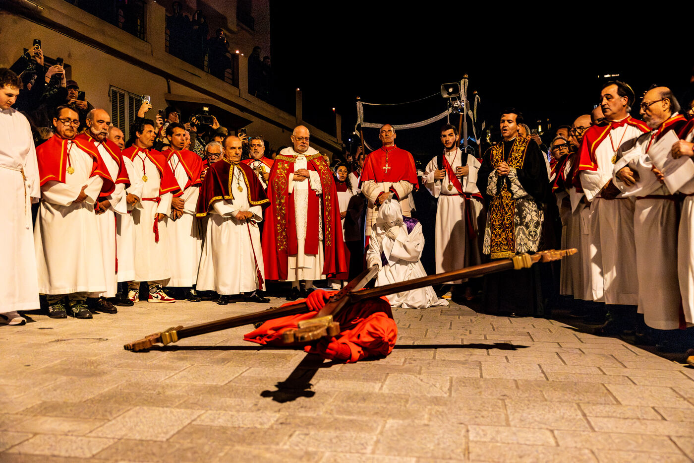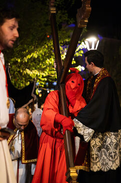 Le pénitent rouge, anonyme, porte la croix et les chaînes. Il chute, se relève, soutenu par le pénitent blanc. Ensemble, ils incarnent le poids de la faute, l’effort de la rédemption et la foi silencieuse. À leurs côtés, les confrères en cape rouge forment une procession dense, rythmée par les chants, le silence, et la gravité des regards.