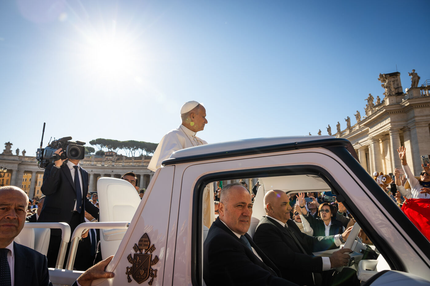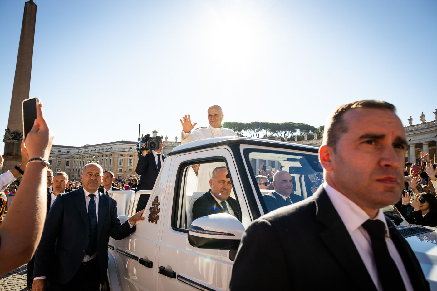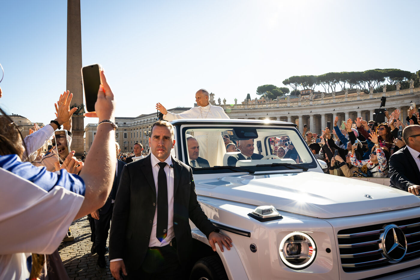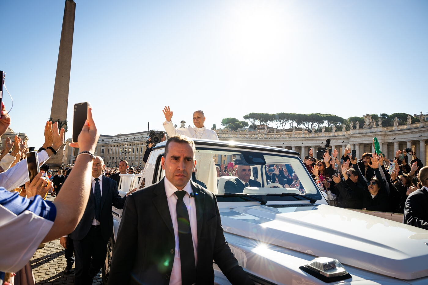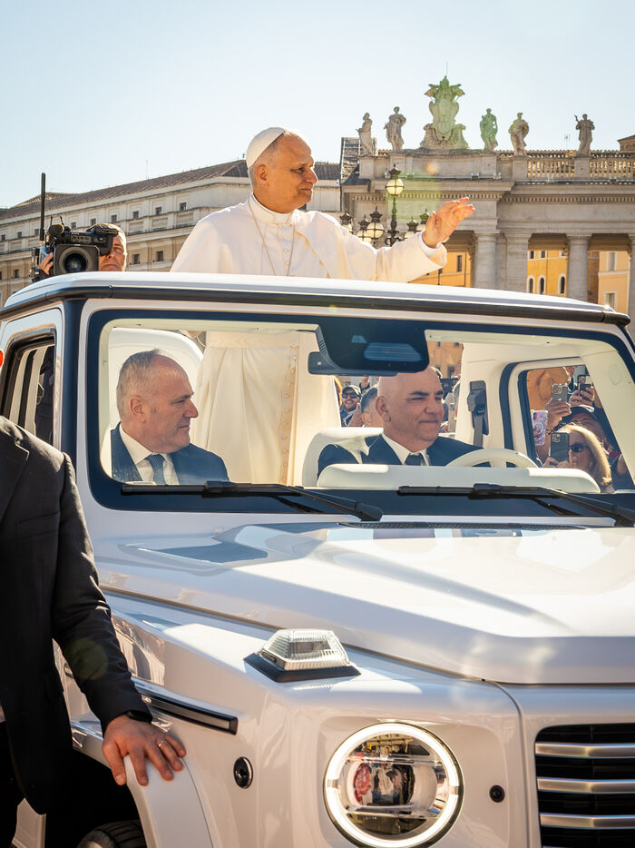 Under the radiant Roman light, Pope Leon XIV crosses St. Peter’s Square aboard the popemobile, greeted by thousands of pilgrims from around the world.