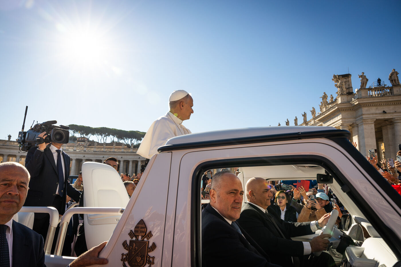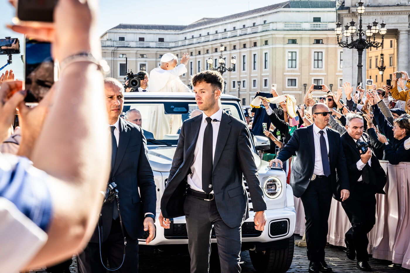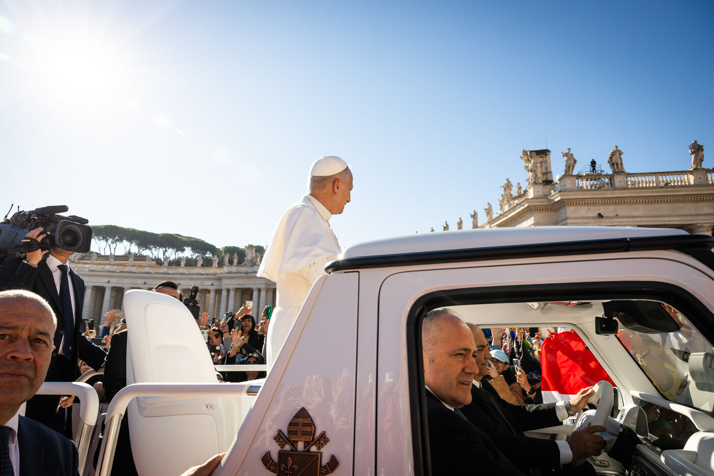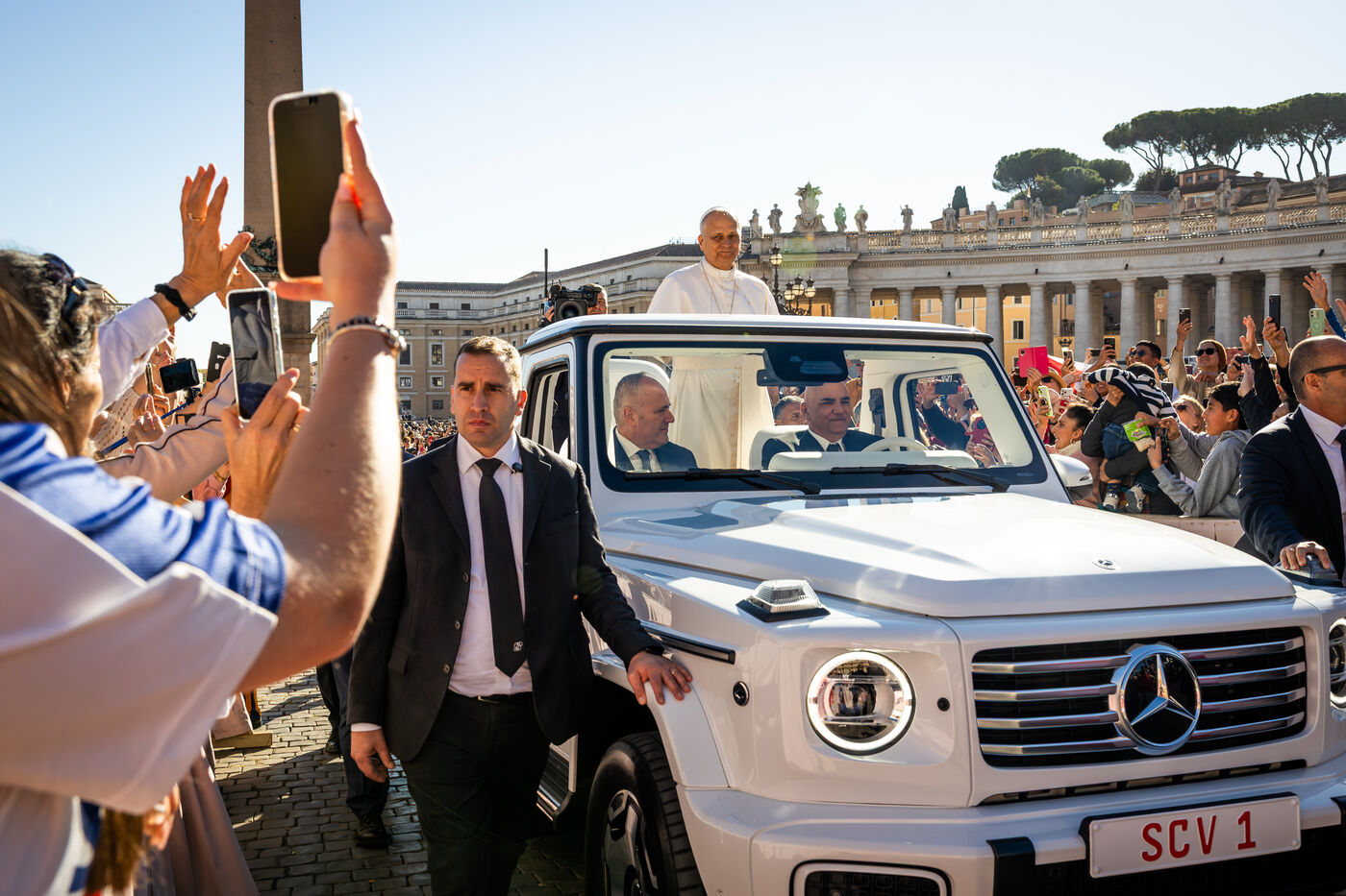 Under the radiant Roman light, Pope Leon XIV crosses St. Peter’s Square aboard the popemobile, greeted by thousands of pilgrims from around the world.