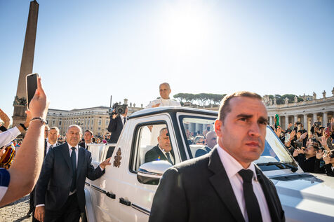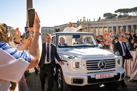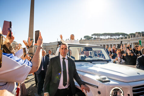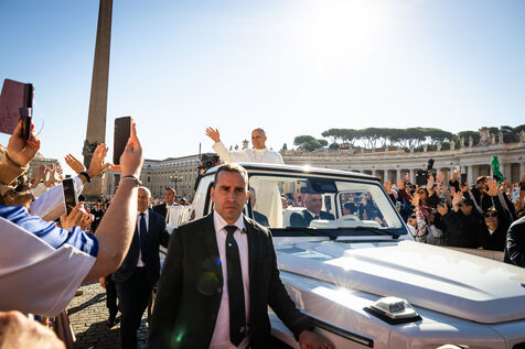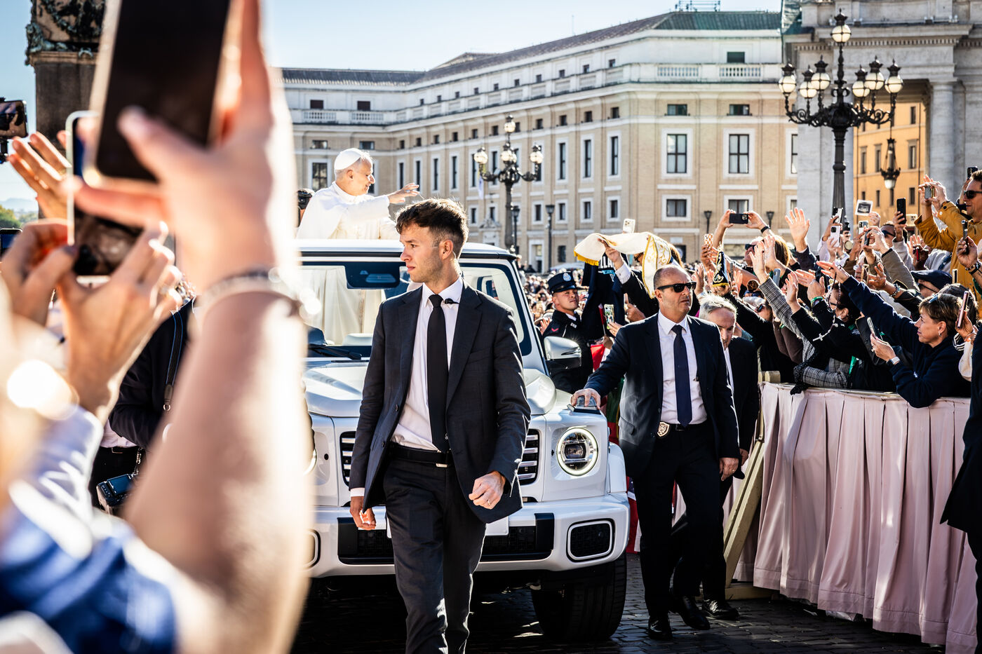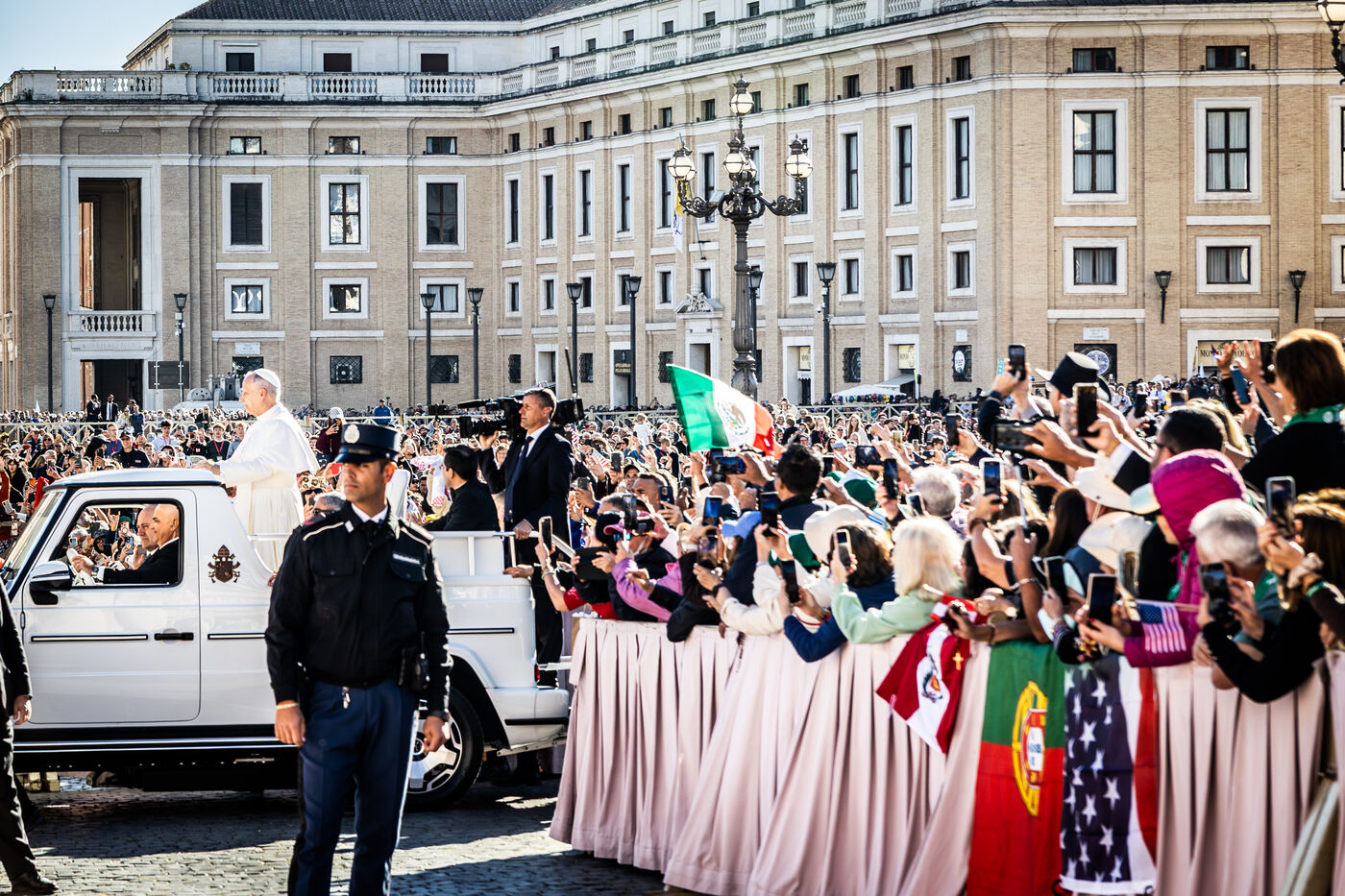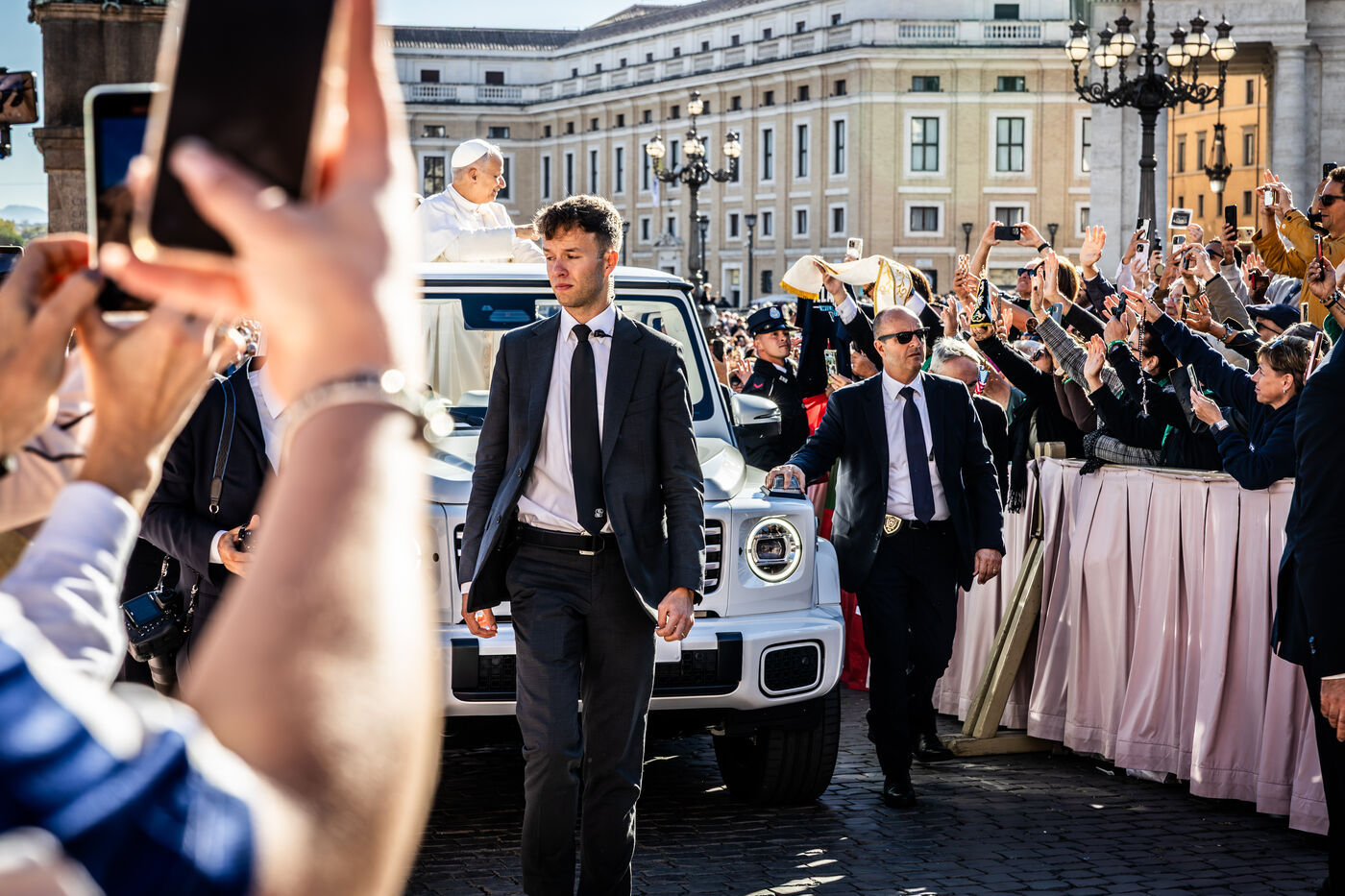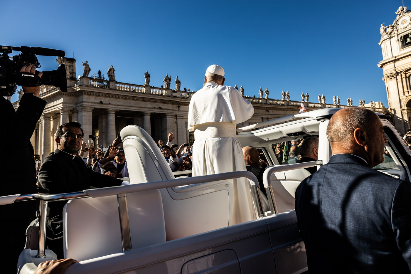 Under the radiant Roman light, Pope Leon XIV crosses St. Peter’s Square aboard the popemobile, greeted by thousands of pilgrims from around the world.