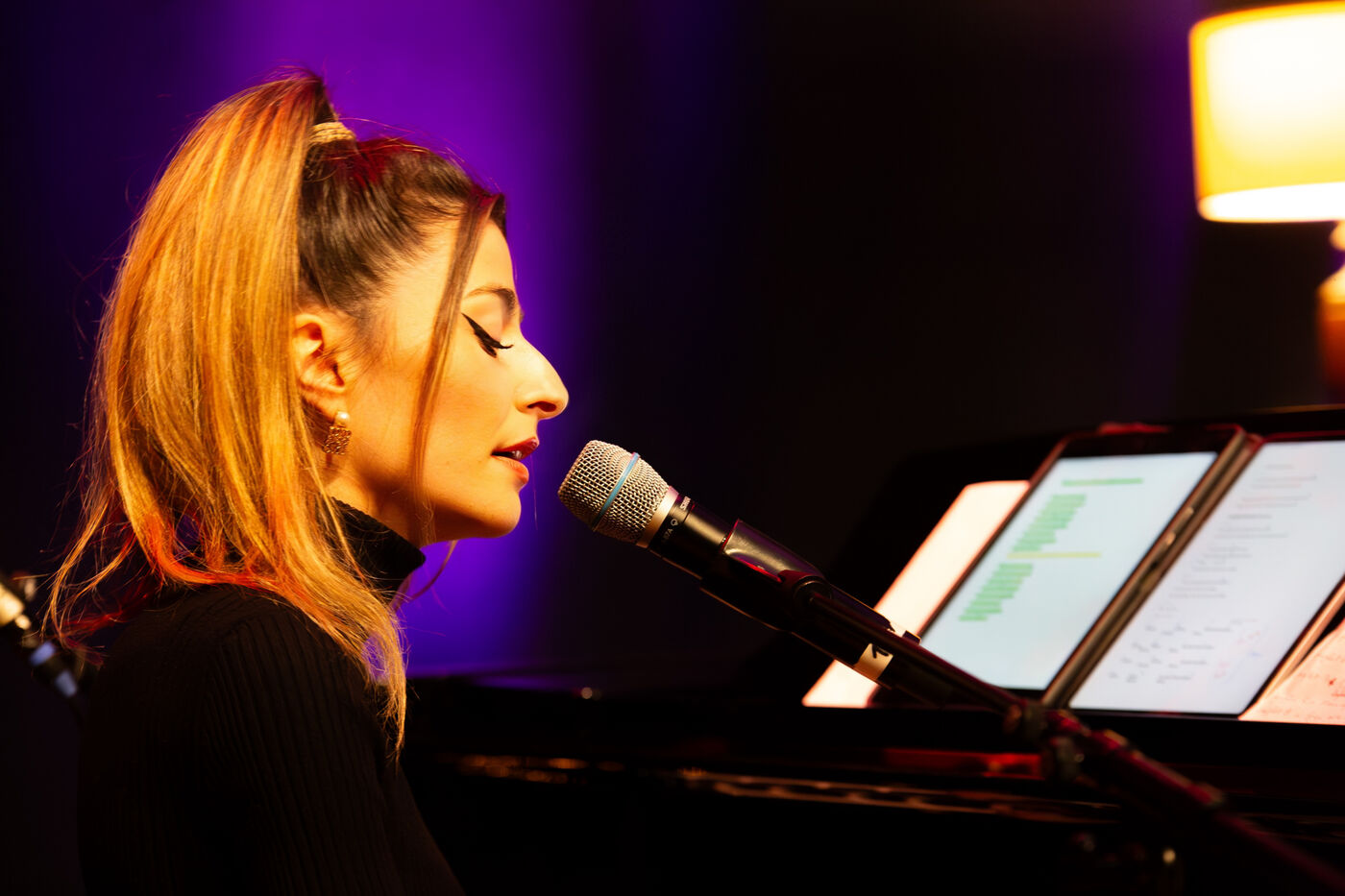 Les photographies capturent ces moments suspendus où le temps se resserre autour de l’artiste : un regard, un souffle, un éclat de couleur sur la peau, la vibration d’une voix portée par le clavier.