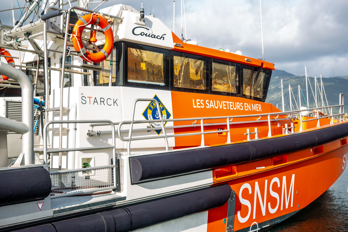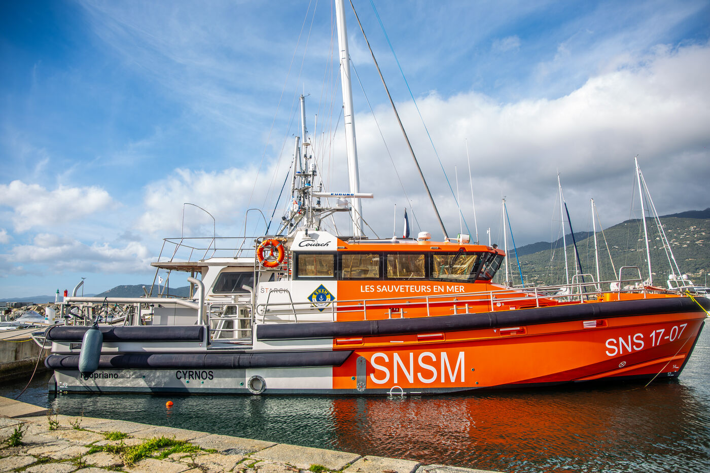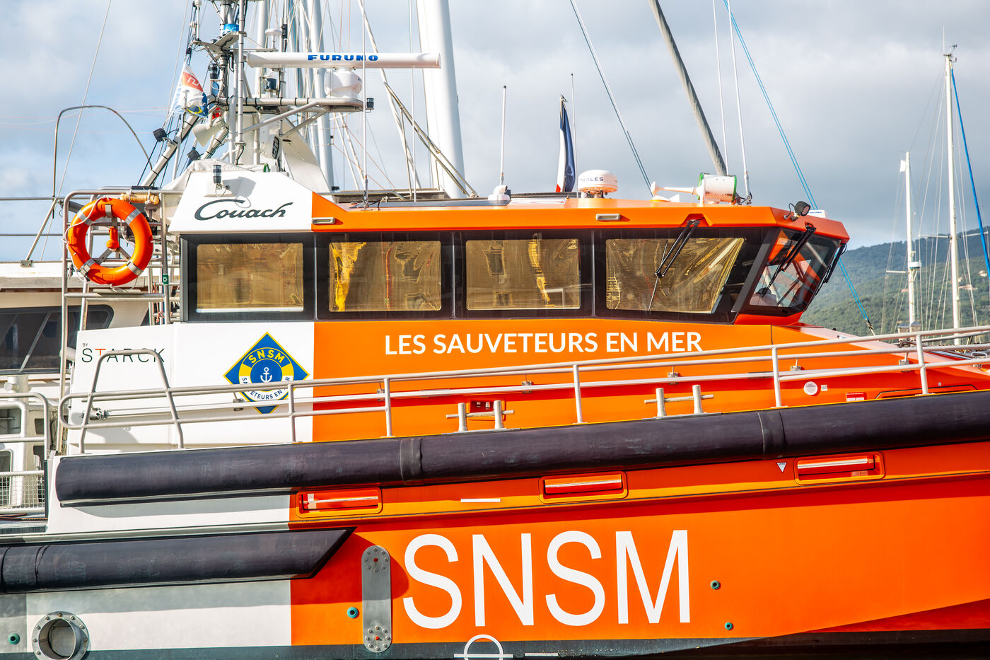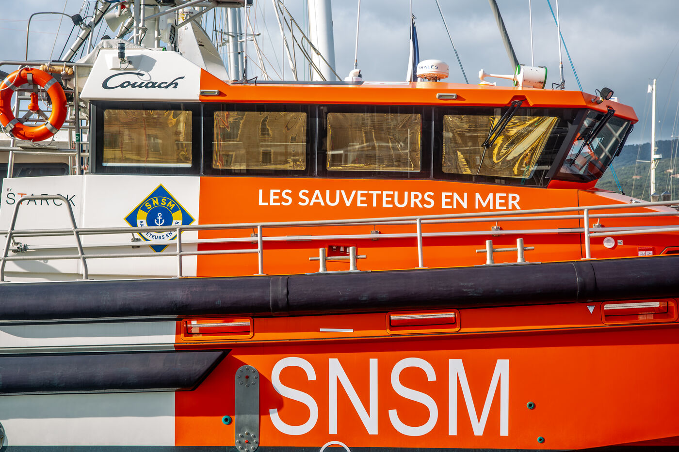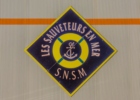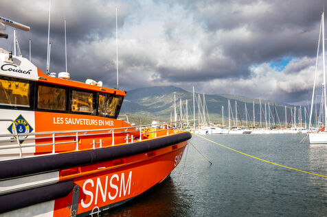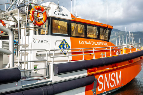 These images show an SNSM rescue boat moored in a port as well as the facade of a rescue station. They illustrate the maritime safety system deployed to assist people in distress at sea and to ensure surveillance of coastal areas.