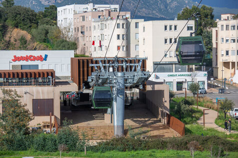 Commissioned in October 2025, the Angelo urban cable car is the first cable transport system in Corsica. About 3 kilometres long, it connects several districts of Ajaccio including Mezzavia, Saint-Joseph and the seafront, with intermediate stations along the route. Designed as an alternative to private cars in a city affected by heavy road congestion, it can carry around 1,500 passengers per hour in each direction with a travel time of about 12 minutes.