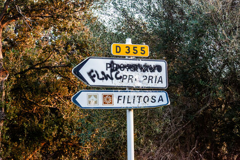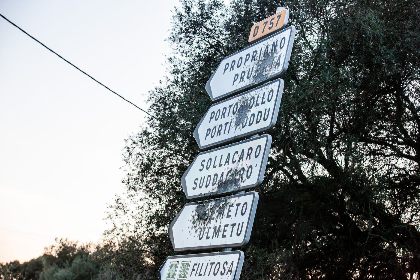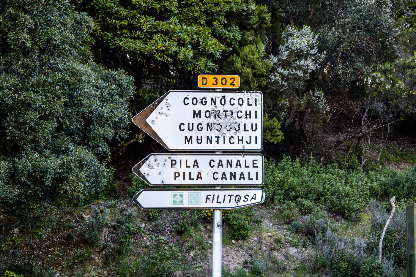 These images show road signs bearing numerous bullet impacts along roads across the island. Common in certain rural areas, these marks reflect both the passage of time and a practice familiar to locals and travelers alike, as road signs sometimes become improvised targets. Intentionally documentary and not linked to a specific event, these photographs capture a peculiar detail of the Corsican roadside landscape, somewhere between local anecdote and visual curiosity.