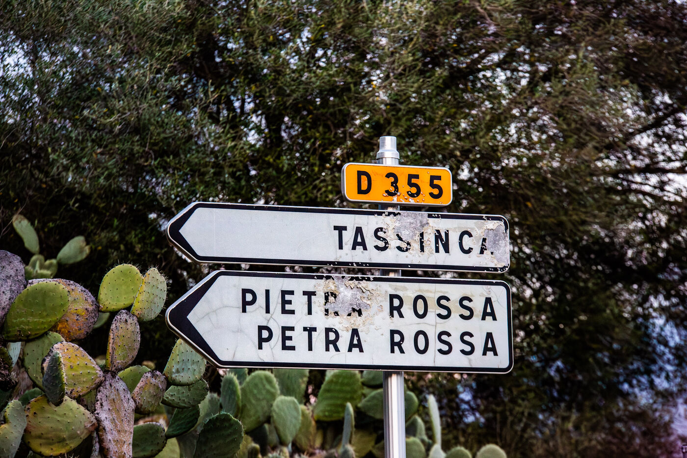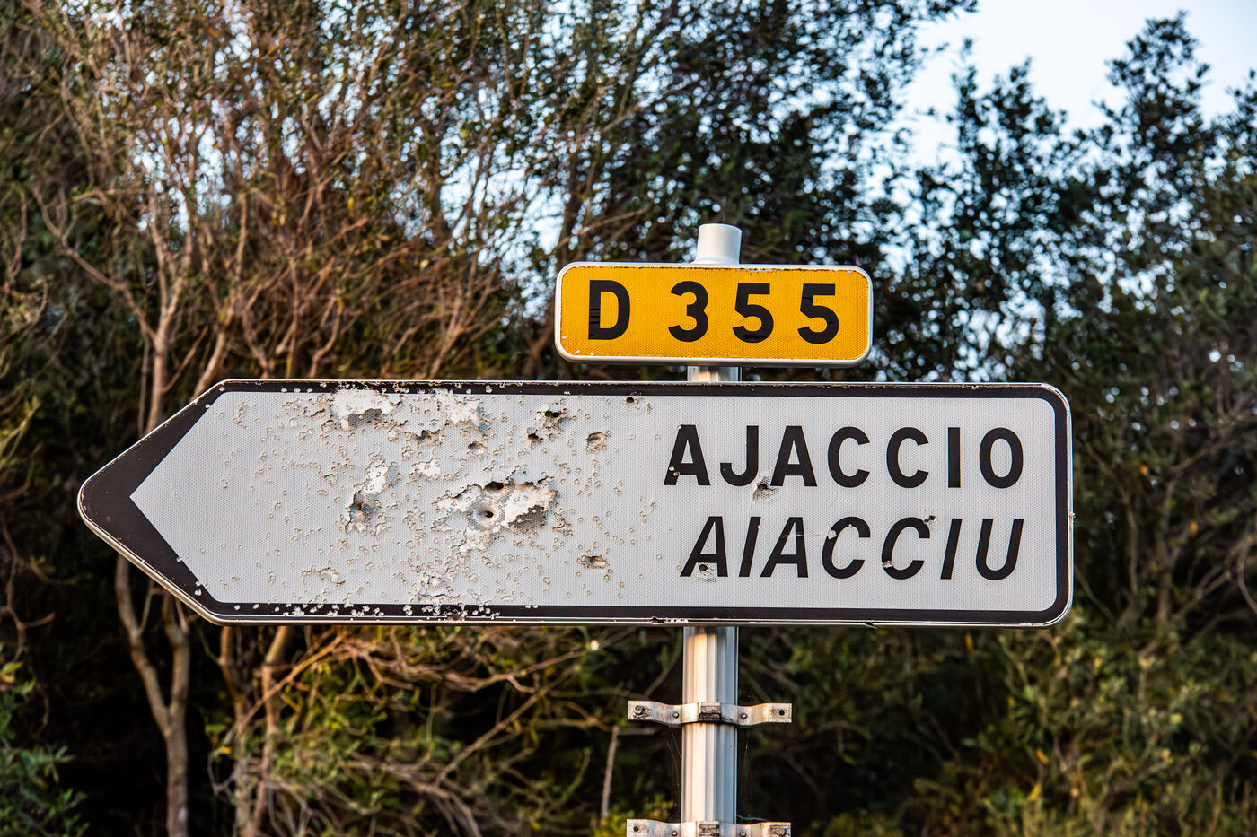 Bullet-marked road signs along Corsican roads