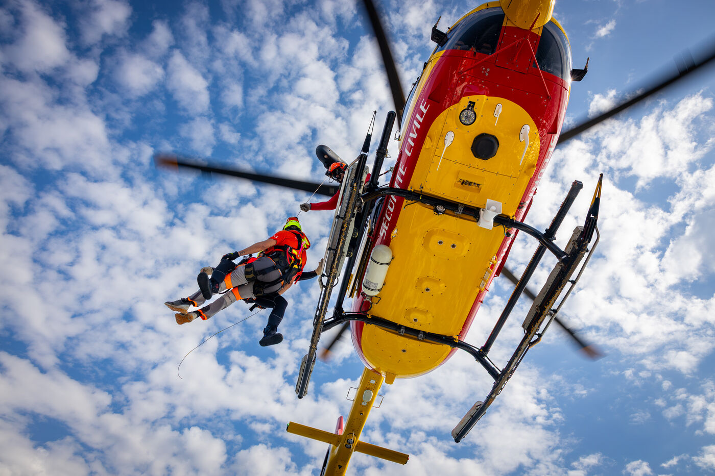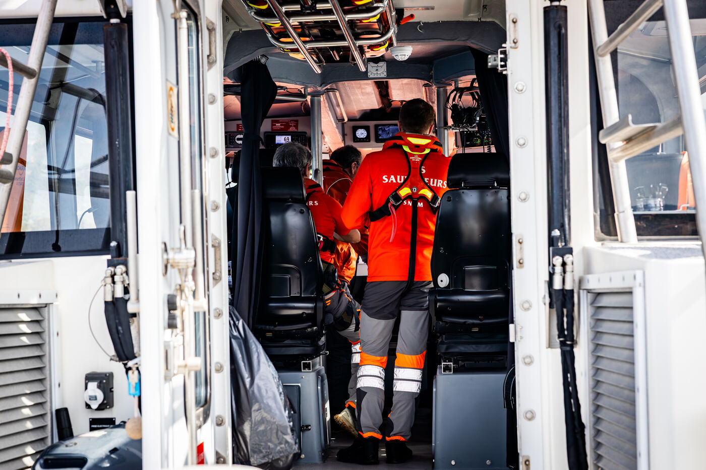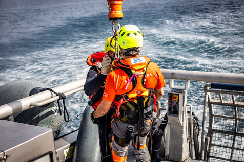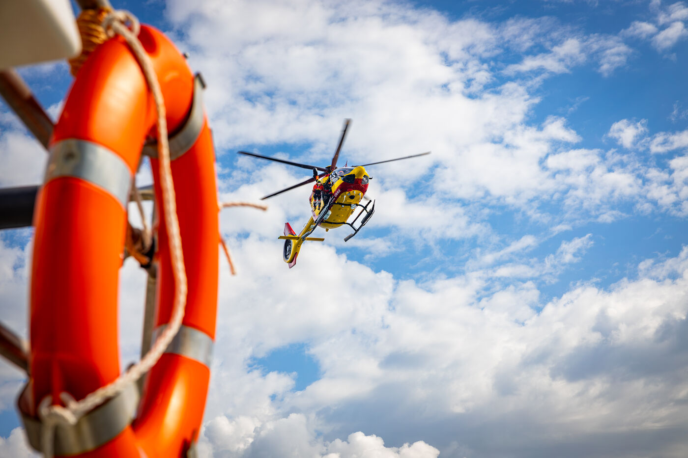 L’opération simulait une manœuvre de treuillage entre l’équipage de l’hélicoptère et le bateau de sauvetage, illustrant la précision technique et la communication nécessaires lors d’interventions maritimes d’urgence. Des sauveteurs ont été descendus et hissés entre l’appareil et le navire, tandis que les équipes à bord sécurisaient le pont et coordonnaient les mouvements sous le souffle des rotors et les conditions maritimes.