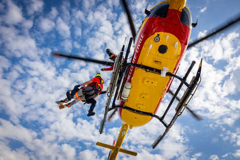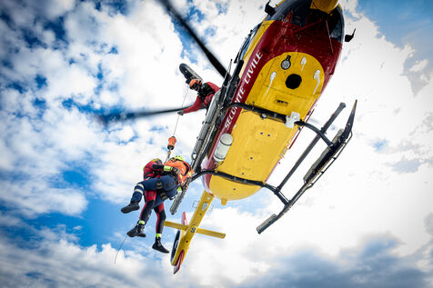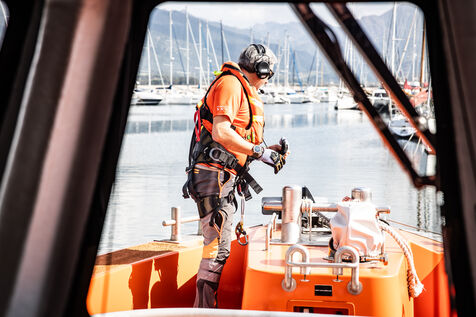 The operation simulated a hoisting procedure between the helicopter crew and the rescue boat, demonstrating the technical precision and communication required for maritime emergency interventions. Rescuers were lowered and hoisted from the helicopter onto the vessel, while crew members secured the deck and coordinated movements under rotor wash and sea conditions.