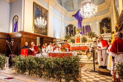 À l’issue de la cérémonie, la procession est revenue vers l’église Santa Maria Assunta, où les fidèles ont poursuivi la liturgie. À l’intérieur, les rameaux ornaient l’autel tandis que les membres de la confrérie participaient à l’office, lisant des textes religieux et assistant le prêtre lors de la communion.