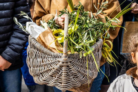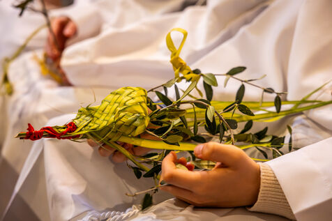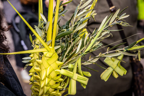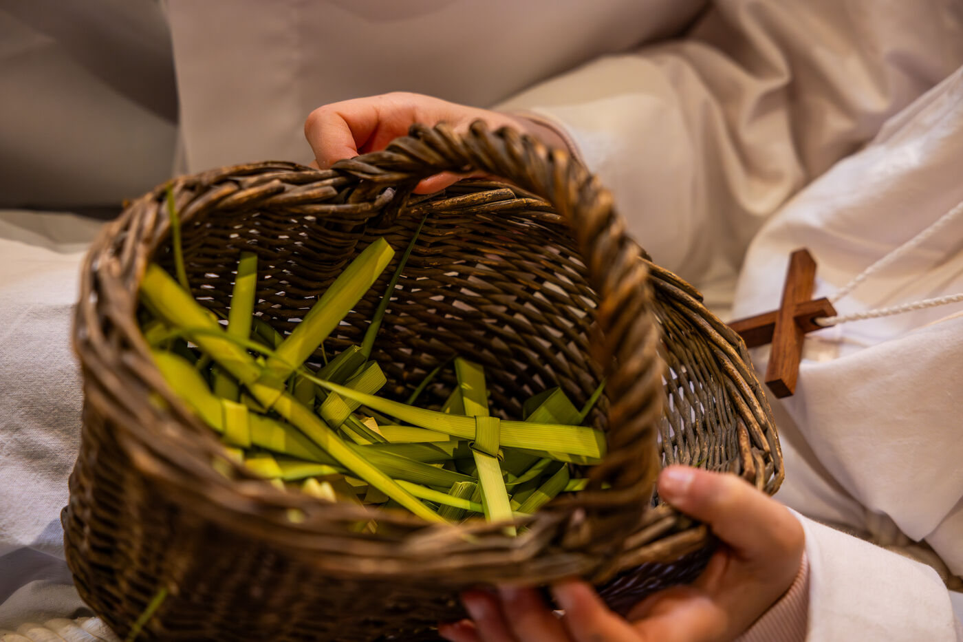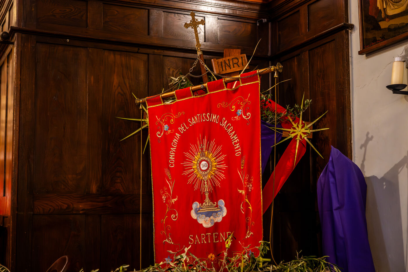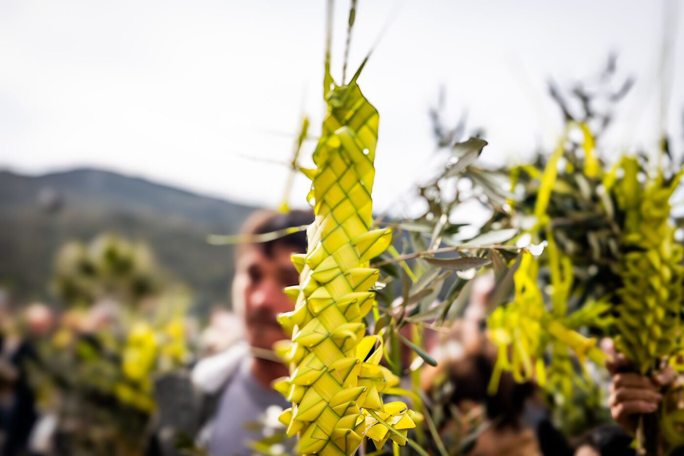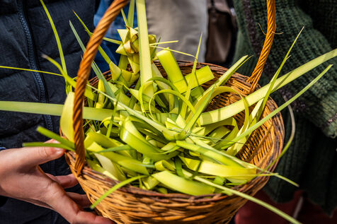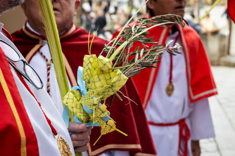The ceremony began at Santa Maria Assunta church, where members of the confraternity Compagnia del Santissimo Sacramento prepared to depart in procession, carrying banners, crosses and intricately braided palm fronds. The procession then made its way through the town towards the Saint Sebastian chapel, accompanied by children and faithful holding olive branches and palms.