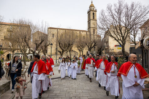 La cérémonie a débuté à l’église Santa Maria Assunta, d’où les membres de la confrérie Compagnia del Santissimo Sacramento sont partis en procession, portant bannières, croix et palmes tressées. Le cortège a ensuite traversé la ville jusqu’à la chapelle Saint-Sébastien, accompagné d’enfants et de fidèles tenant rameaux d’olivier et palmes.