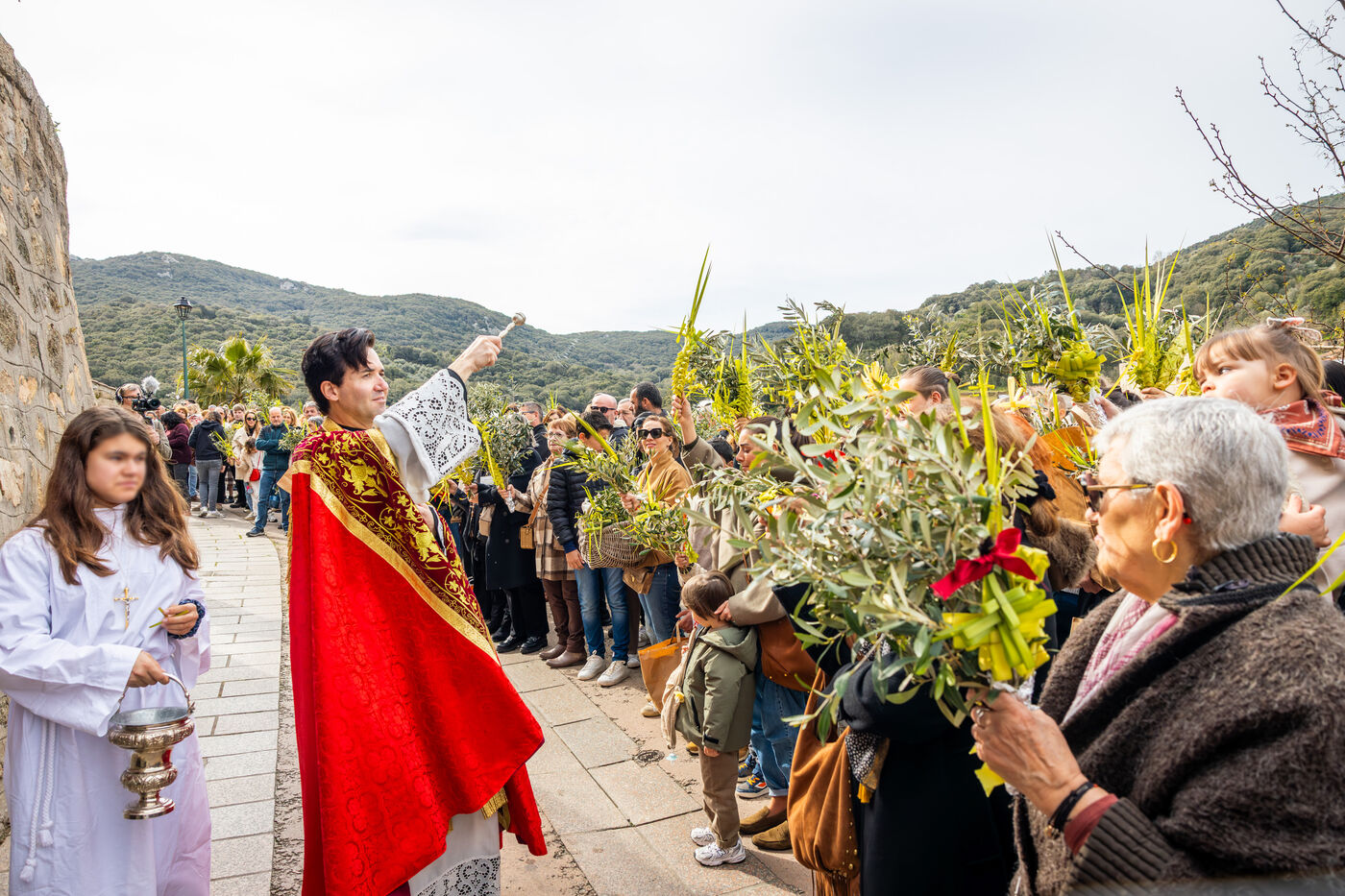 Sur le parvis de la chapelle, une foule importante s’est rassemblée tandis que l’abbé Olivier Culioli procédait à la bénédiction des rameaux, rituel central de cette fête commémorant l’entrée du Christ à Jérusalem. La messe a ensuite été célébrée en plein air avec l’assistance de la confrérie.