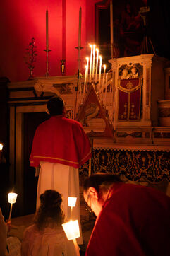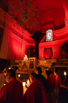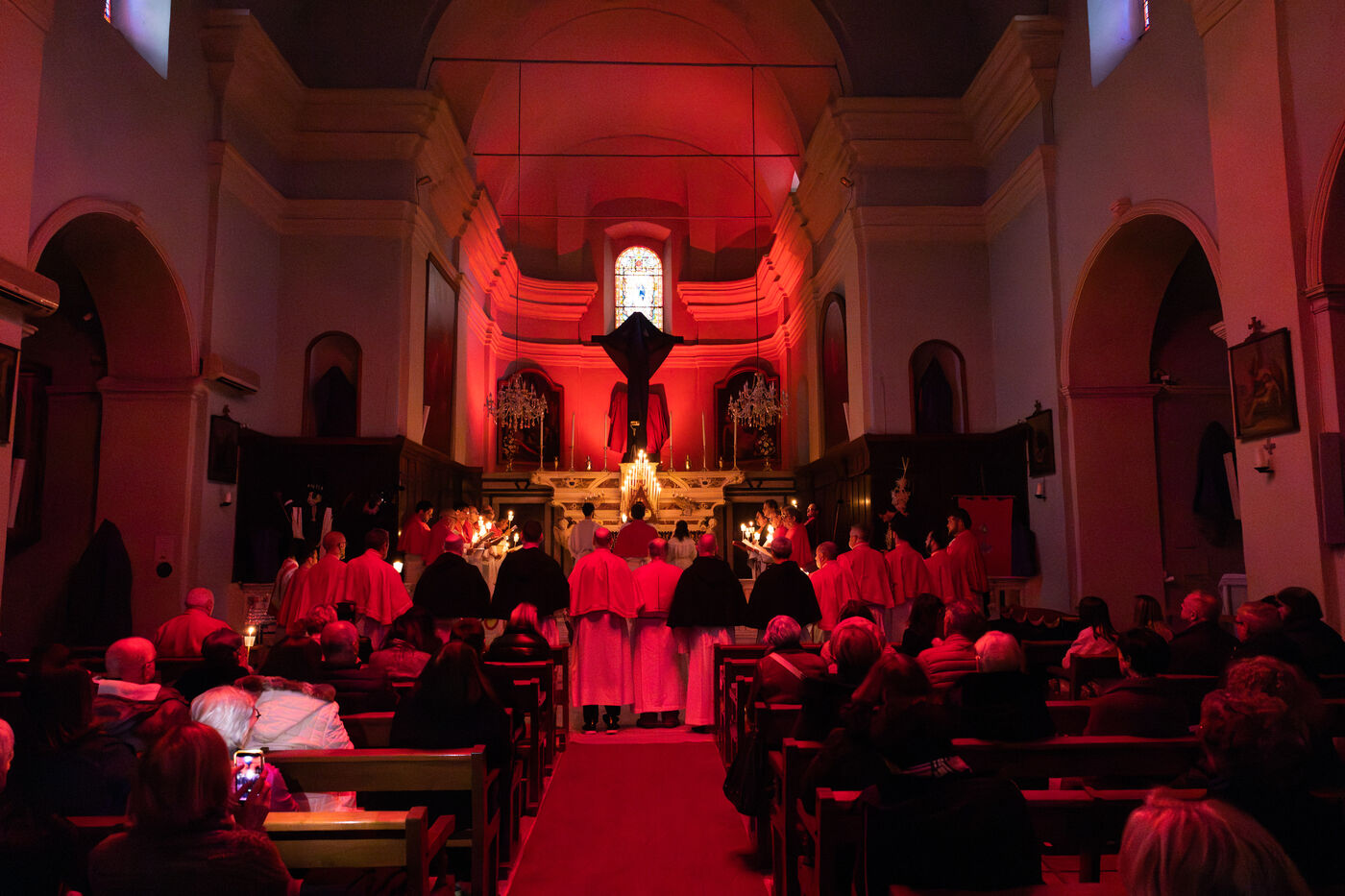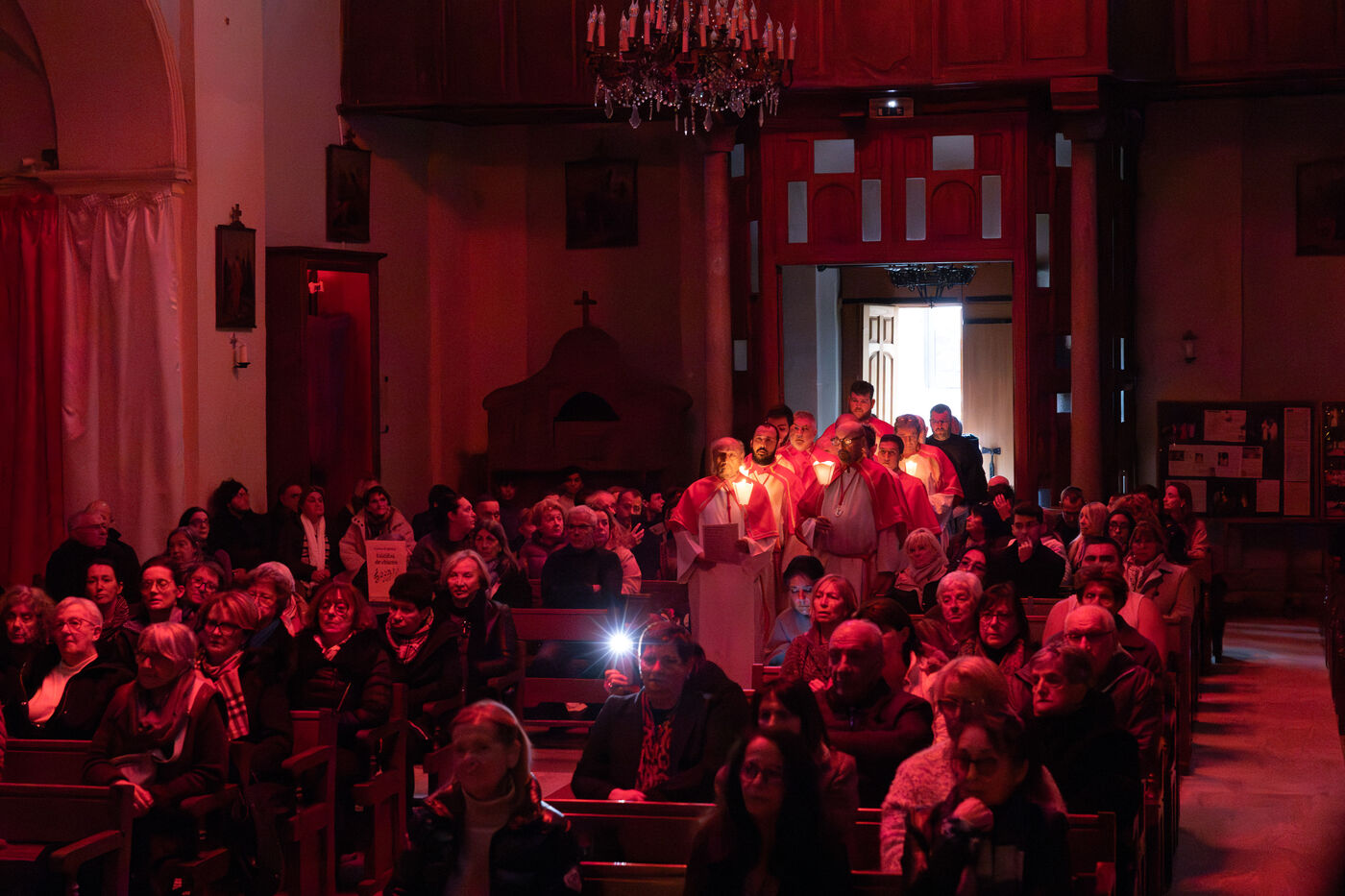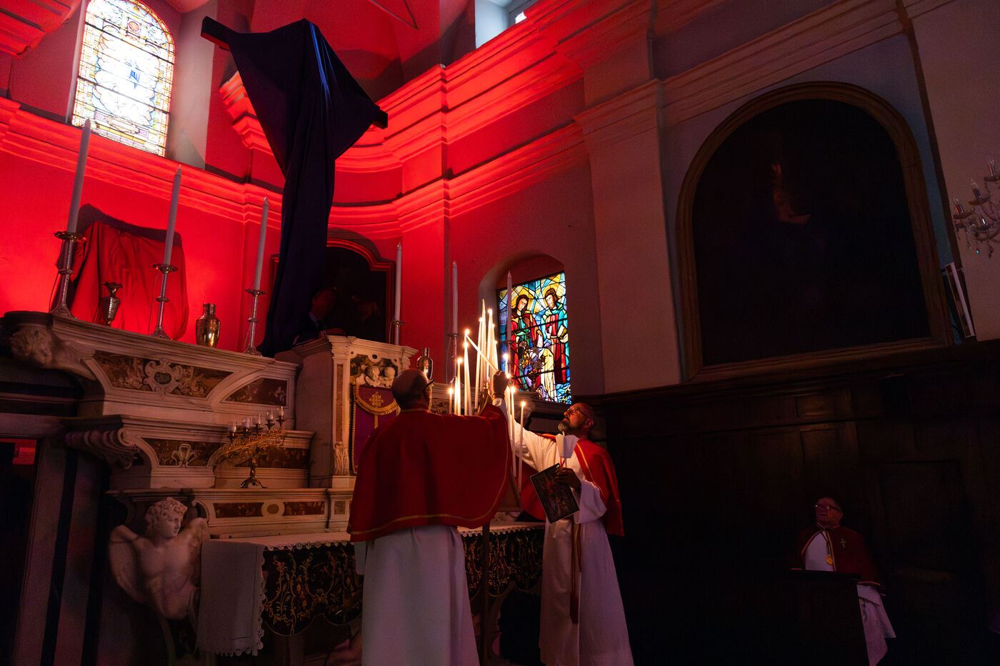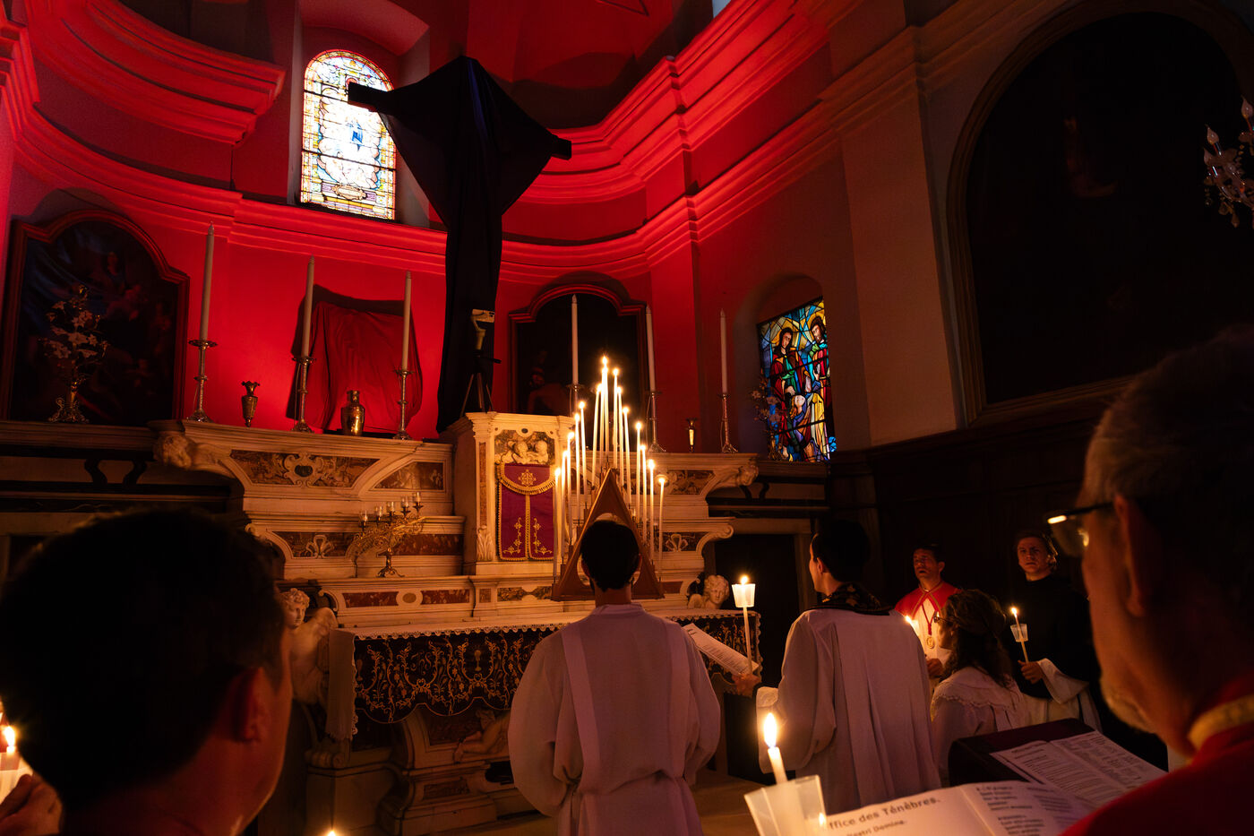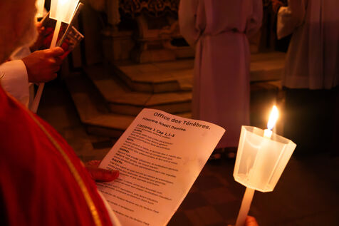 Au fil de l’office, les cierges sont éteints un à un, plongeant peu à peu l’église dans l’obscurité. Ce rituel, issu d’une tradition catholique ancienne, symbolise l’abandon, le deuil et l’attente de la crucifixion. Le silence est seulement rythmé par les prières, les chants et les déplacements des fidèles réunis dans le recueillement.