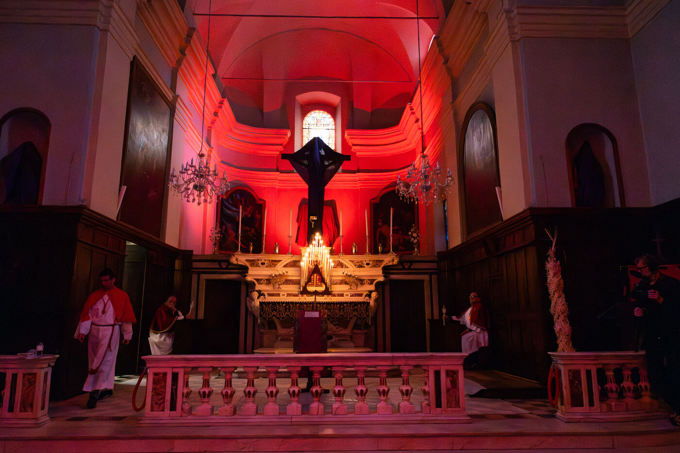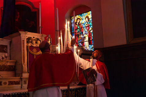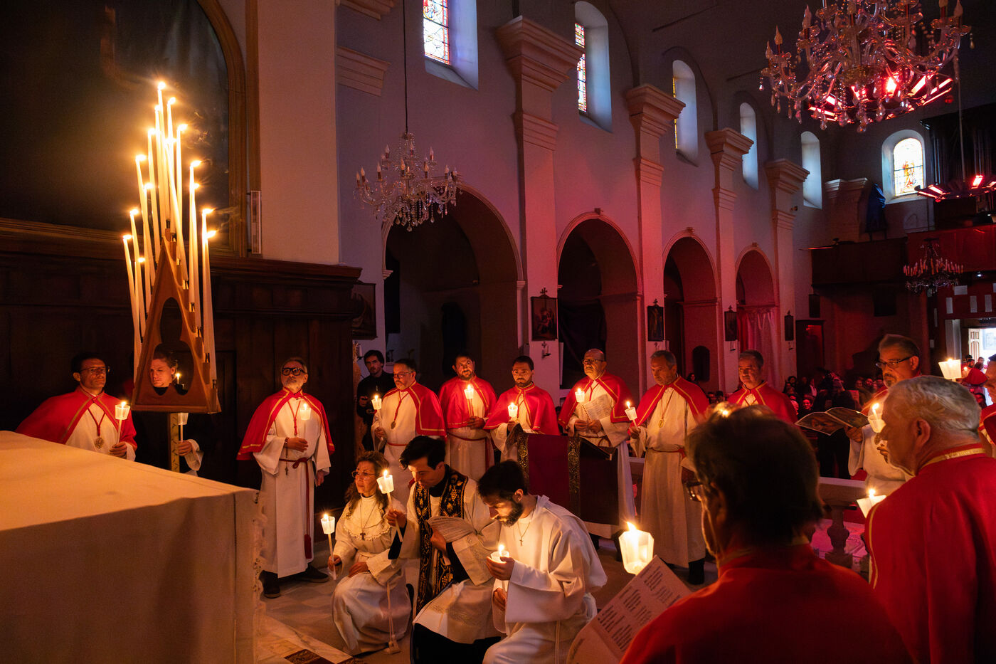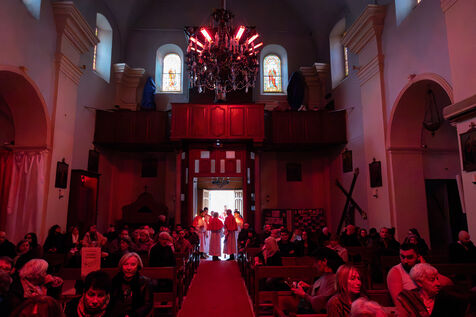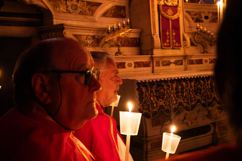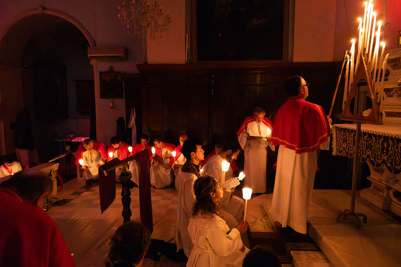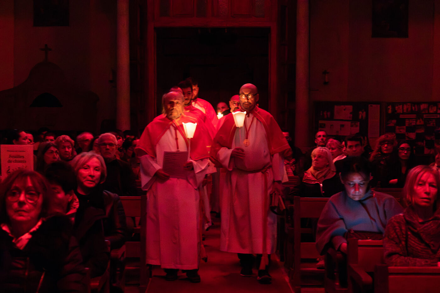 Au fil de l’office, les cierges sont éteints un à un, plongeant peu à peu l’église dans l’obscurité. Ce rituel, issu d’une tradition catholique ancienne, symbolise l’abandon, le deuil et l’attente de la crucifixion. Le silence est seulement rythmé par les prières, les chants et les déplacements des fidèles réunis dans le recueillement.
