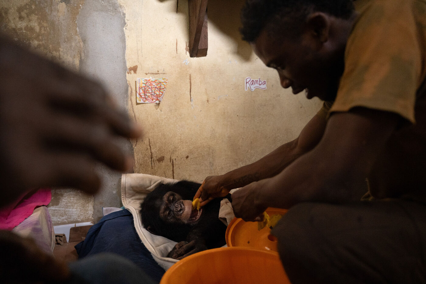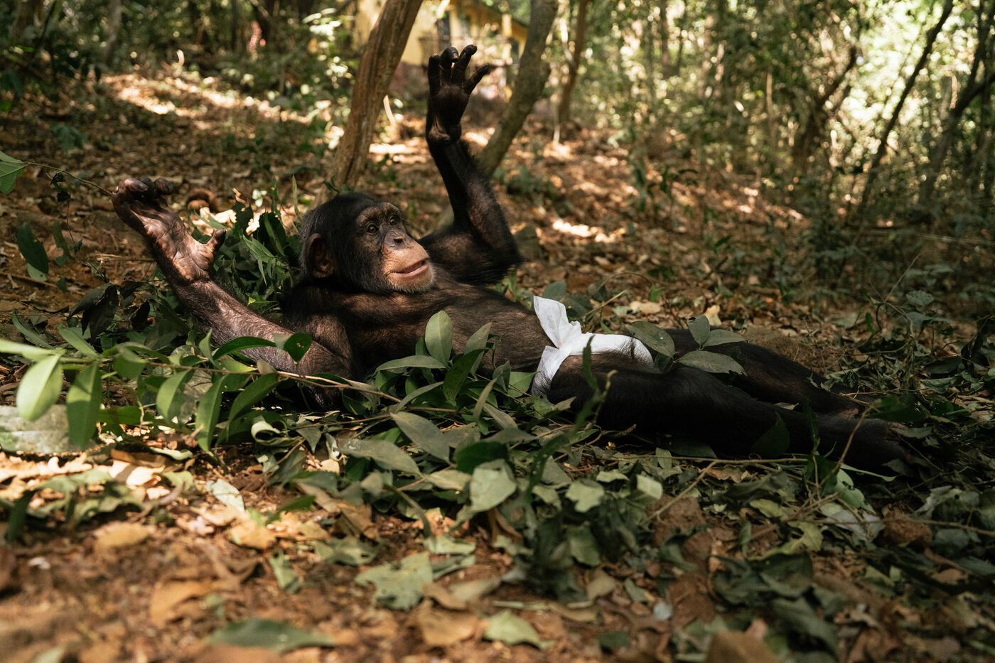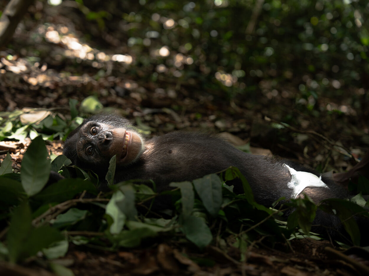The series also features Ramba, a seven-year-old female whose story embodies both vulnerability and resilience. In 2024, she suffered from acute encephalitis, a life-threatening inflammation of the brain, which left her partially paralyzed. Through continuous veterinary care and the unwavering support of her caregiver Daniel Kamara, Ramba slowly began to regain movement, strength, and confidence. Today, she continues her rehabilitation—gripping branches, rediscovering play, and rebuilding trust.