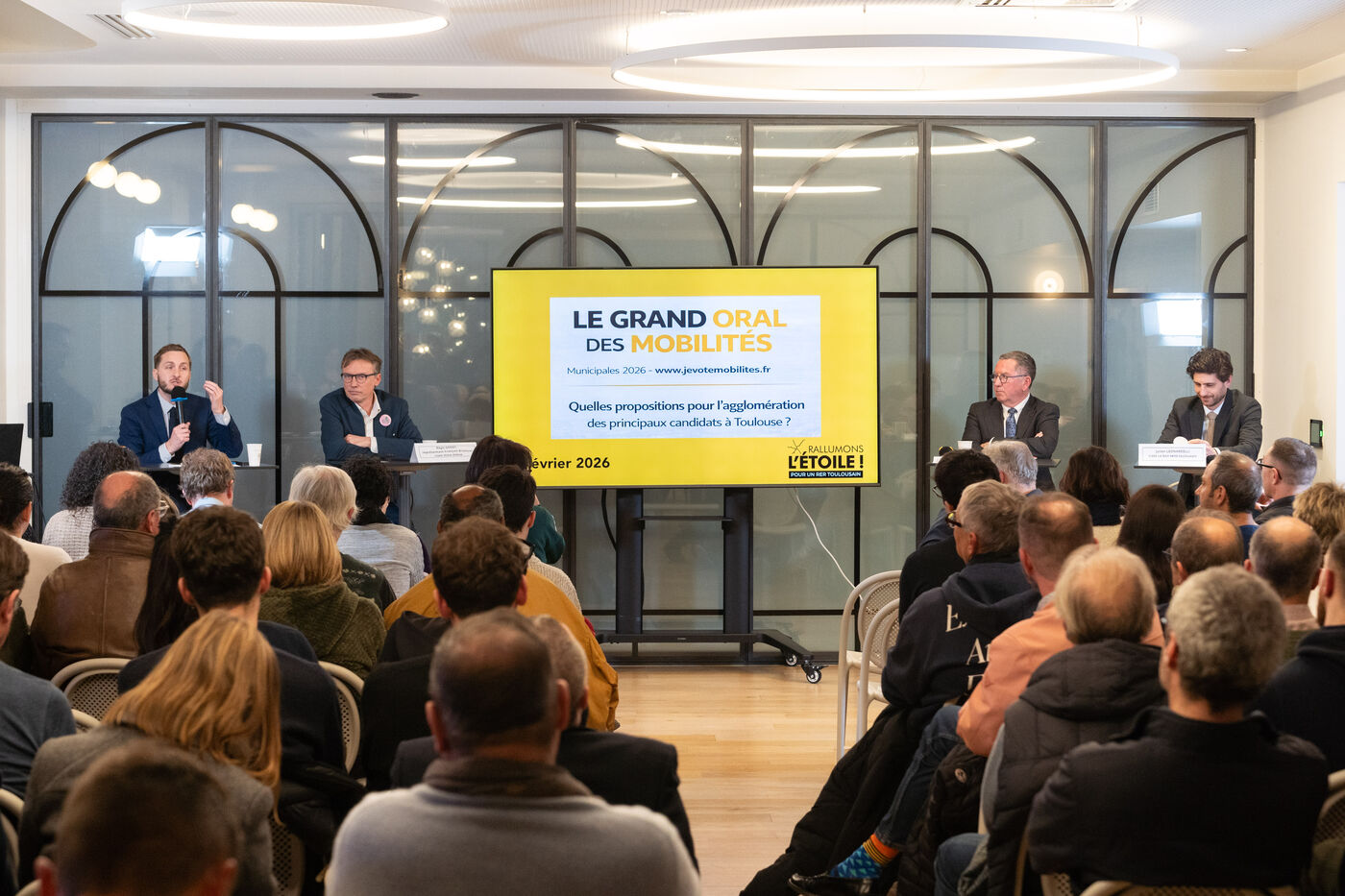 Organisé par l'association « Rallumons l'Étoile » et animé par son président Benoît Lanusse, le « Grand Oral des Mobilités » s'est tenu lundi à la gare Matabiau. Quatre représentants majeurs des listes candidates aux municipales 2026 — François Piquemal (Demain Toulouse), Julien Leonardelli (RN), Jean-Michel Lattes (représentant Jean-Luc Moudenc) et Régis Godec (représentant François Briançon) — ont confronté leurs visions des transports. Jean-Michel Lattes a défendu la priorité à la 3e ligne de métro tout en se disant ouvert au RER sous condition de financements d'État. Régis Godec et François Piquemal ont tous deux plaidé pour un RER métropolitain massif et la fin du « tout-métro », Piquemal insistant sur la gratuité sociale. Julien Leonardelli a soutenu les projets de métro et de RER à condition qu'ils ne pénalisent pas les automobilistes et soient économiquement soutenables.