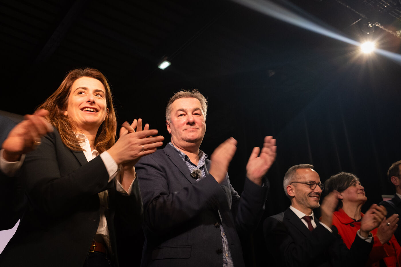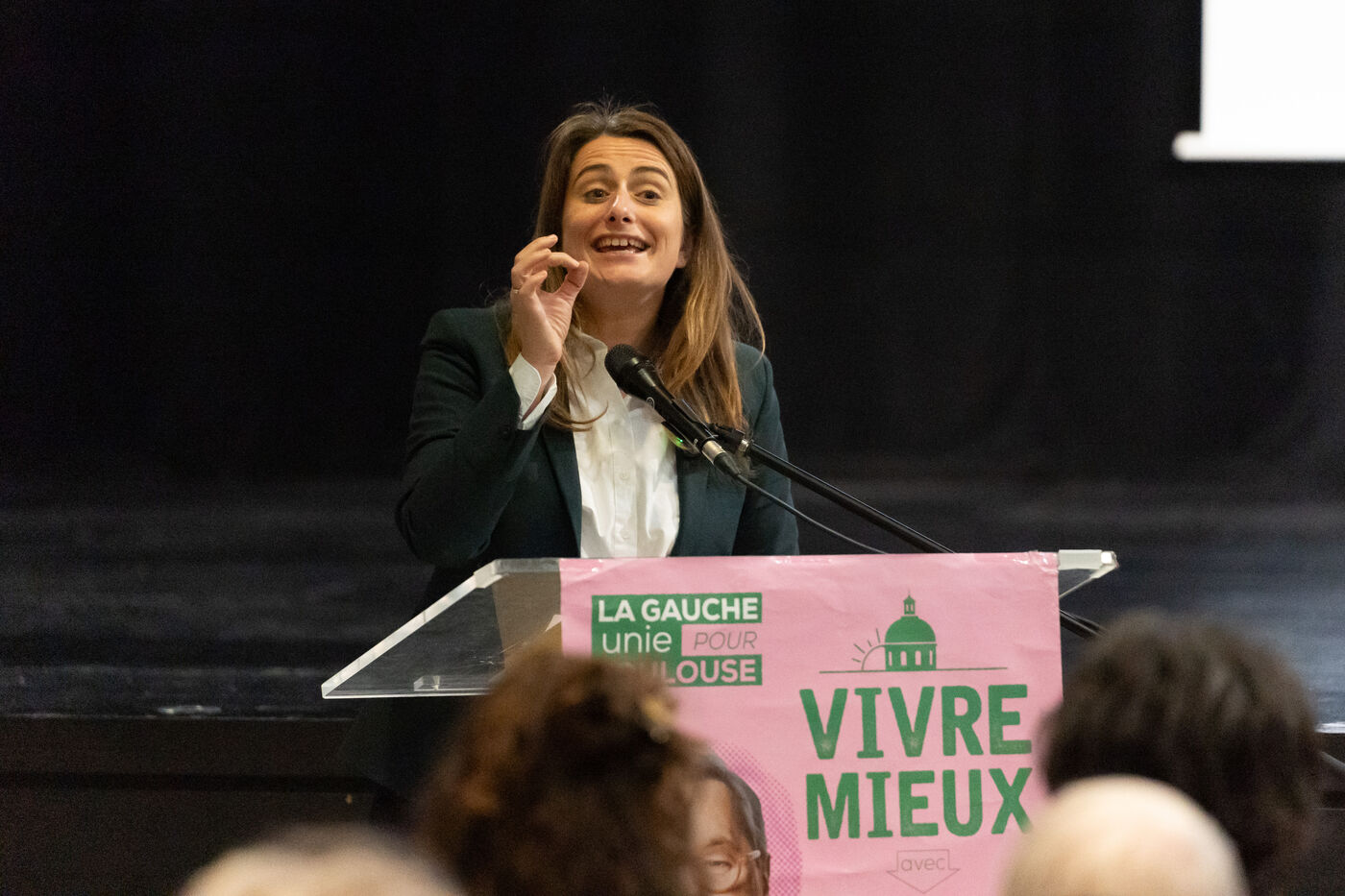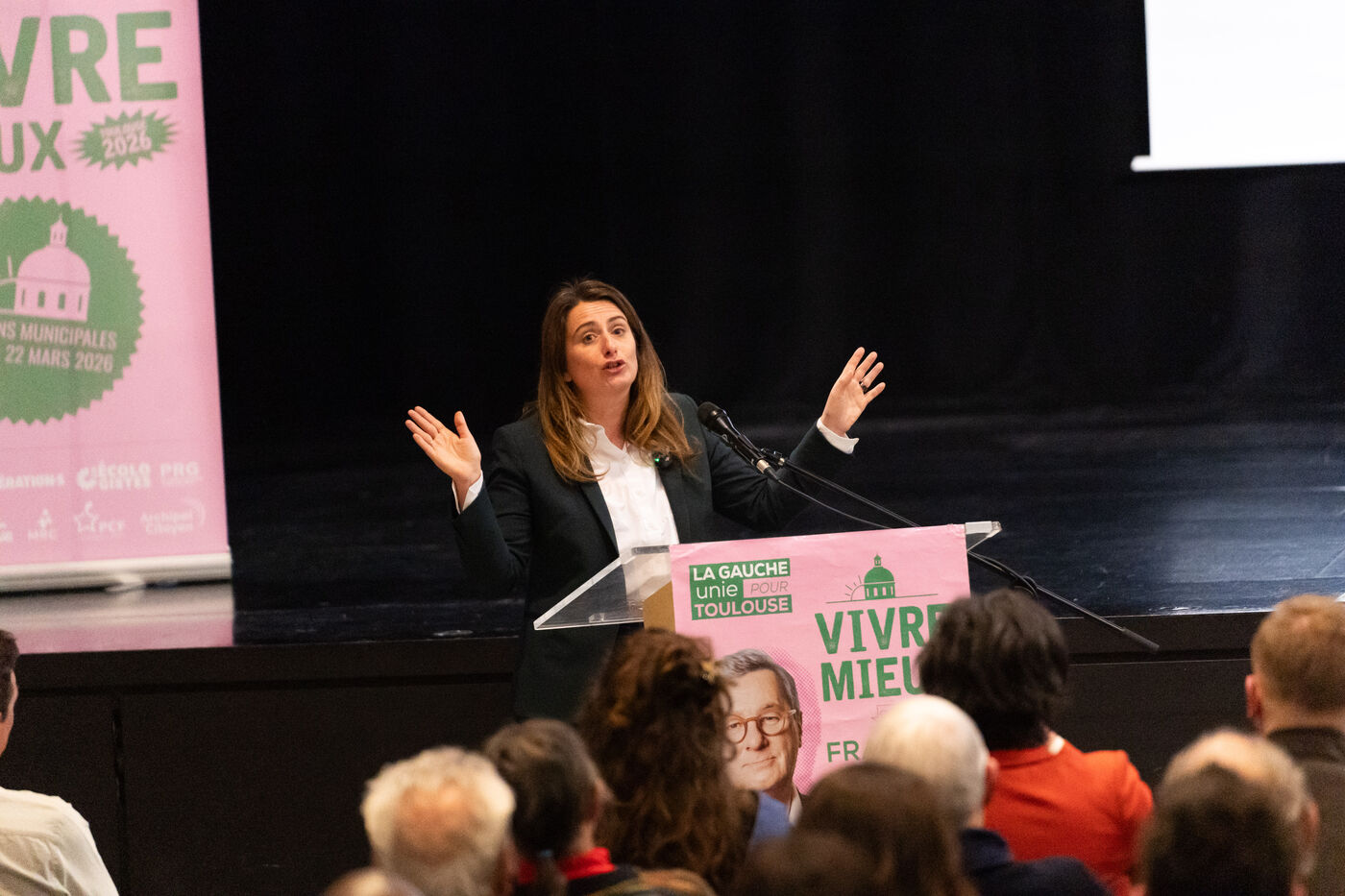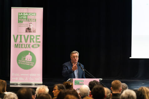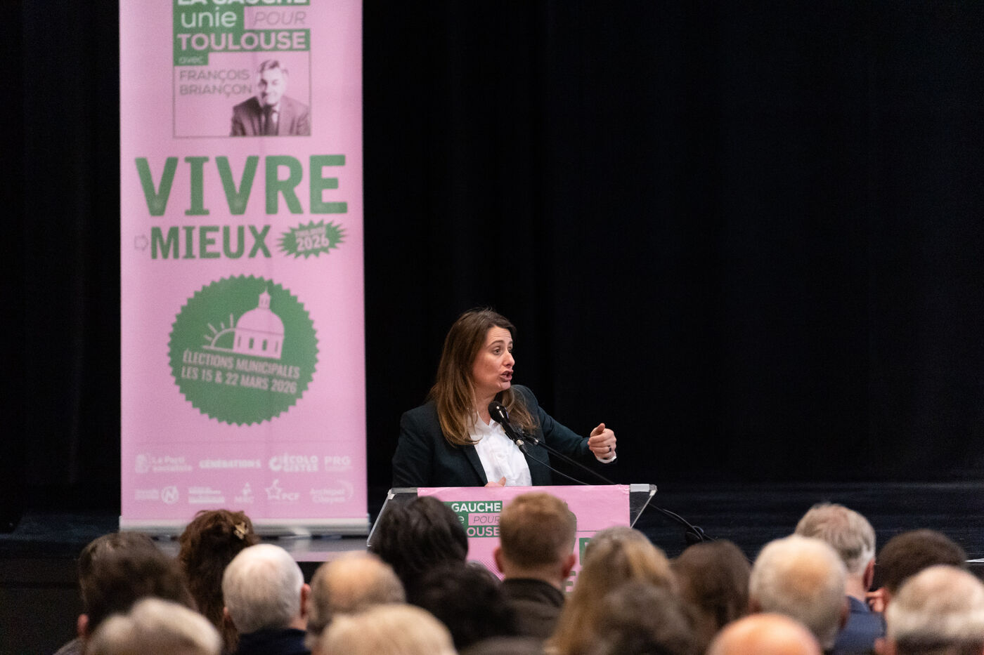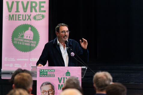 Meeting de campagne pour les élections municipales de 2026 à la salle des fêtes de Lafourguette à Toulouse, le 18 février 2026. François Briançon (PS), tête de la liste « Vivre Mieux - La Gauche Unie pour Toulouse », était accompagné de Marine Tondelier, secrétaire nationale des Écologistes (LE), aux côtés de Régis Godec (LE), candidat à la présidence de Toulouse Métropole, et Sébastien Vincini (PS), président du conseil départemental de la Haute-Garonne. Le panel comprenait Anne Aguilera (DVG), porte-parole de la liste, Pierre Lacaze (PCF), conseiller régional, et le rassemblement de neuf formations politiques et citoyennes visant à proposer une alternative à la majorité sortante.
