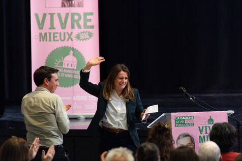 Campaign meeting for the 2026 municipal elections at the Lafourguette community hall in Toulouse on February 18, 2026. Francois Briancon (PS), head of the "Vivre Mieux - La Gauche Unie pour Toulouse" list, was joined by Marine Tondelier, National Secretary of Les Ecologistes (LE), alongside Regis Godec (LE), candidate for the Presidency of Toulouse Metropole, and Sebastien Vincini (PS), President of the Haute-Garonne Departmental Council. The panel included Anne Aguilera (DVG), spokesperson for the list, Pierre Lacaze (PCF), regional councillor, and the coalition of nine political parties and citizen movements aiming to challenge the outgoing administration.