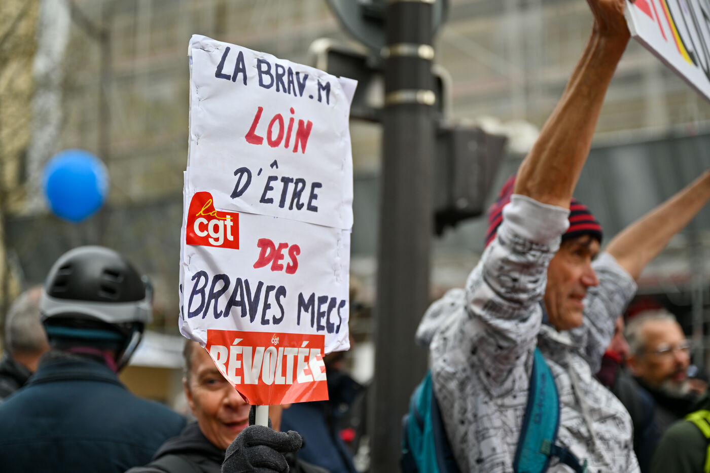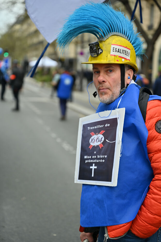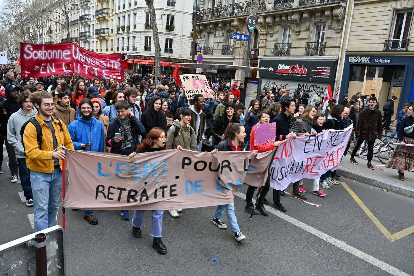 Paris, mardi 28 mars 2023, nouvelle journée de mobilisation contre la réforme des retraites repoussant l age légal de depart à 64 ans sous condition de 43 annuitées et supprimant les régimes spéciaux. Huit syndicats (CGT, SUD, CFDT, FSU, UNSA) ont appelé à la grève contre le projet de reforme des retraites du gouvernement Borne. La reforme a ete definitivement vote après le rejet de la motion de censure qui visait le gouvernement.
