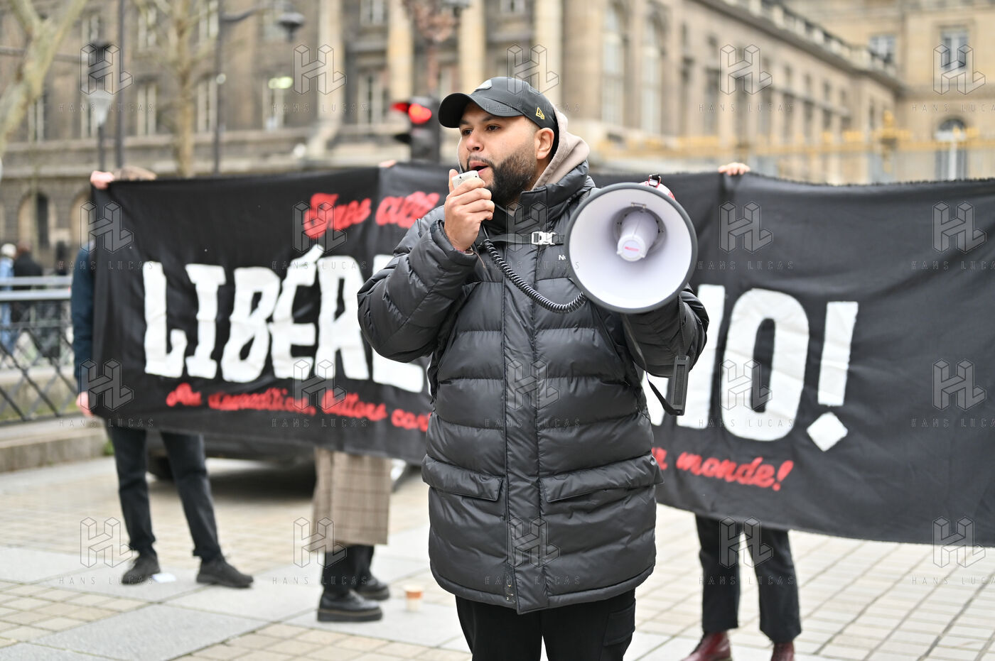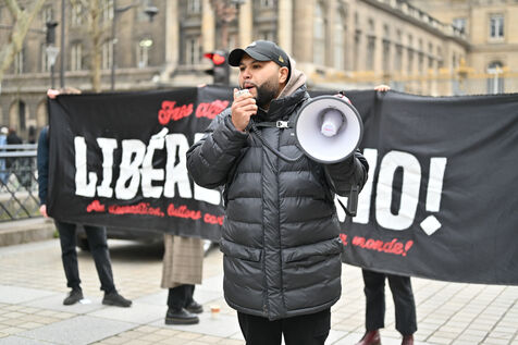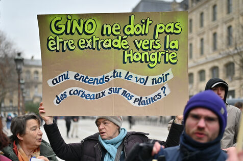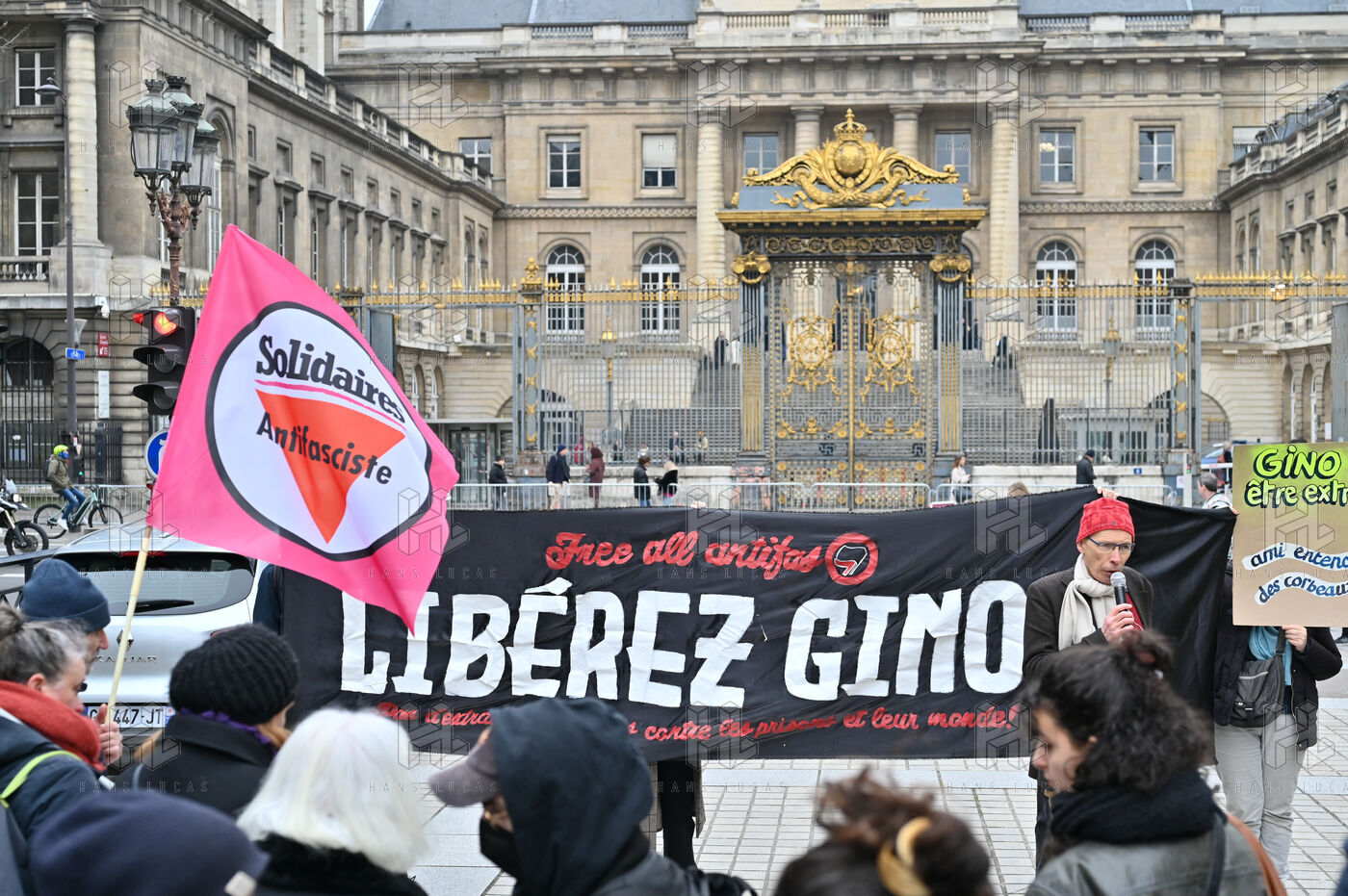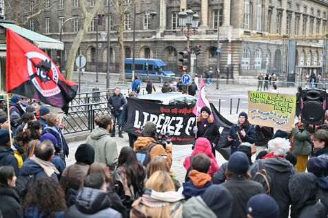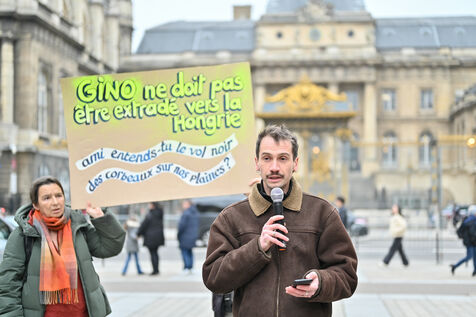 Rassemblement place Place Louis Lepine pour la liberation de Rexhino Abazaj, surnommé Gino, militant antifaciste, vise par un mandat d arrêt européen émis par le gouvernement de Viktor Orban.
