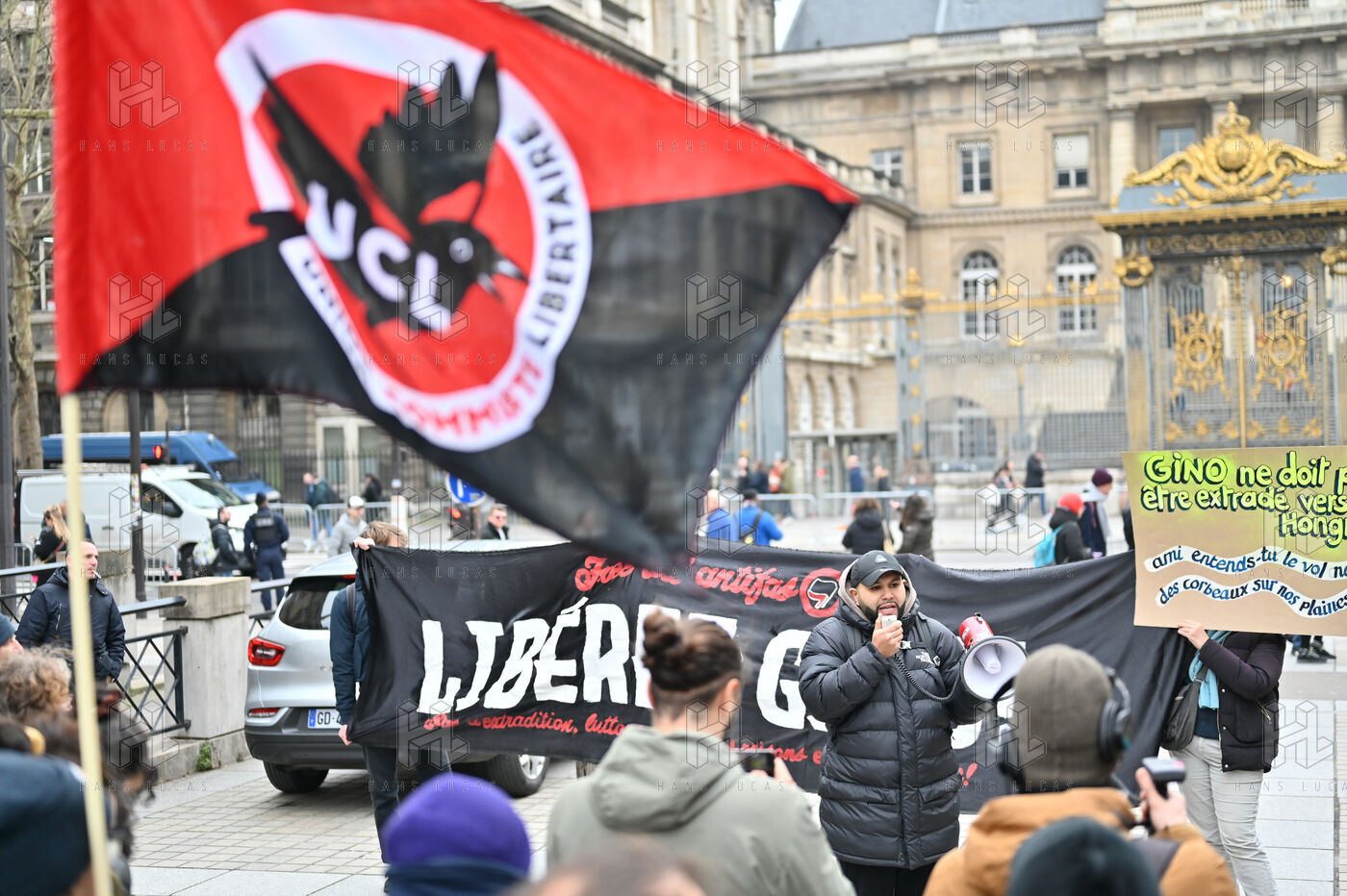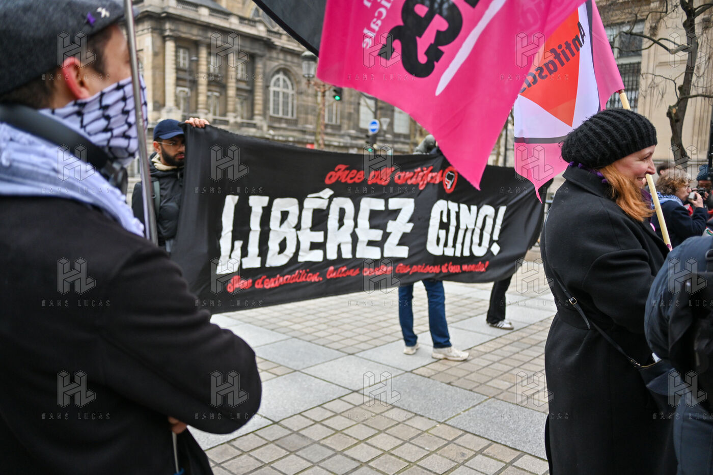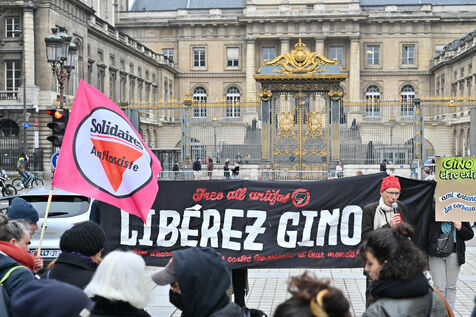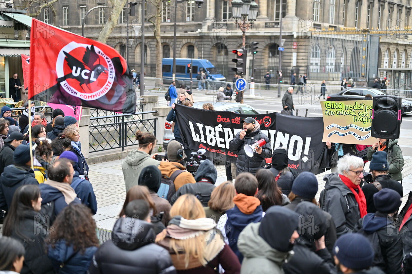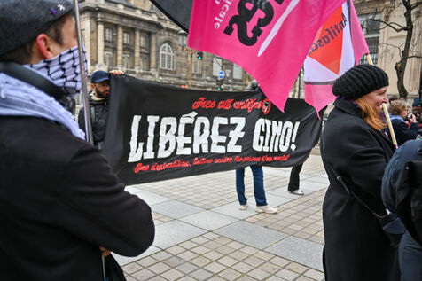 Gathering at Place Louis Lepine for the release of Rexhino Abazaj, known as Gino, an antifascist activist targeted by a European arrest warrant issued by Viktor Orban's government.