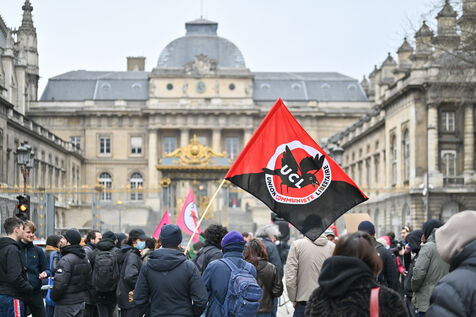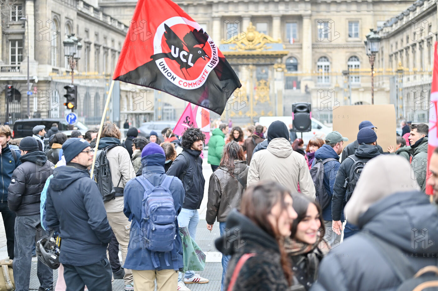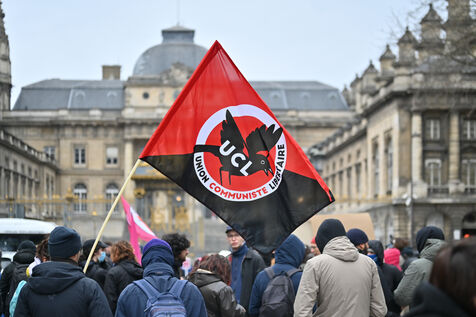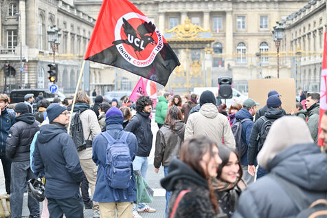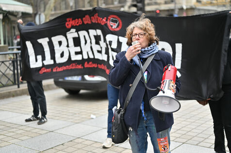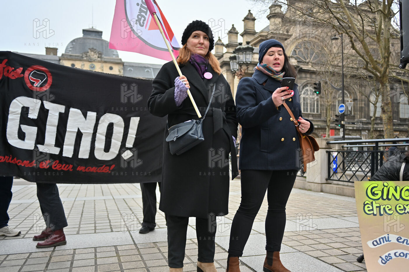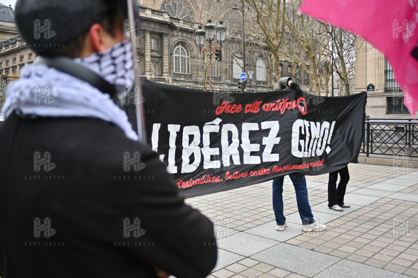 Gathering at Place Louis Lepine for the release of Rexhino Abazaj, known as Gino, an antifascist activist targeted by a European arrest warrant issued by Viktor Orban's government.