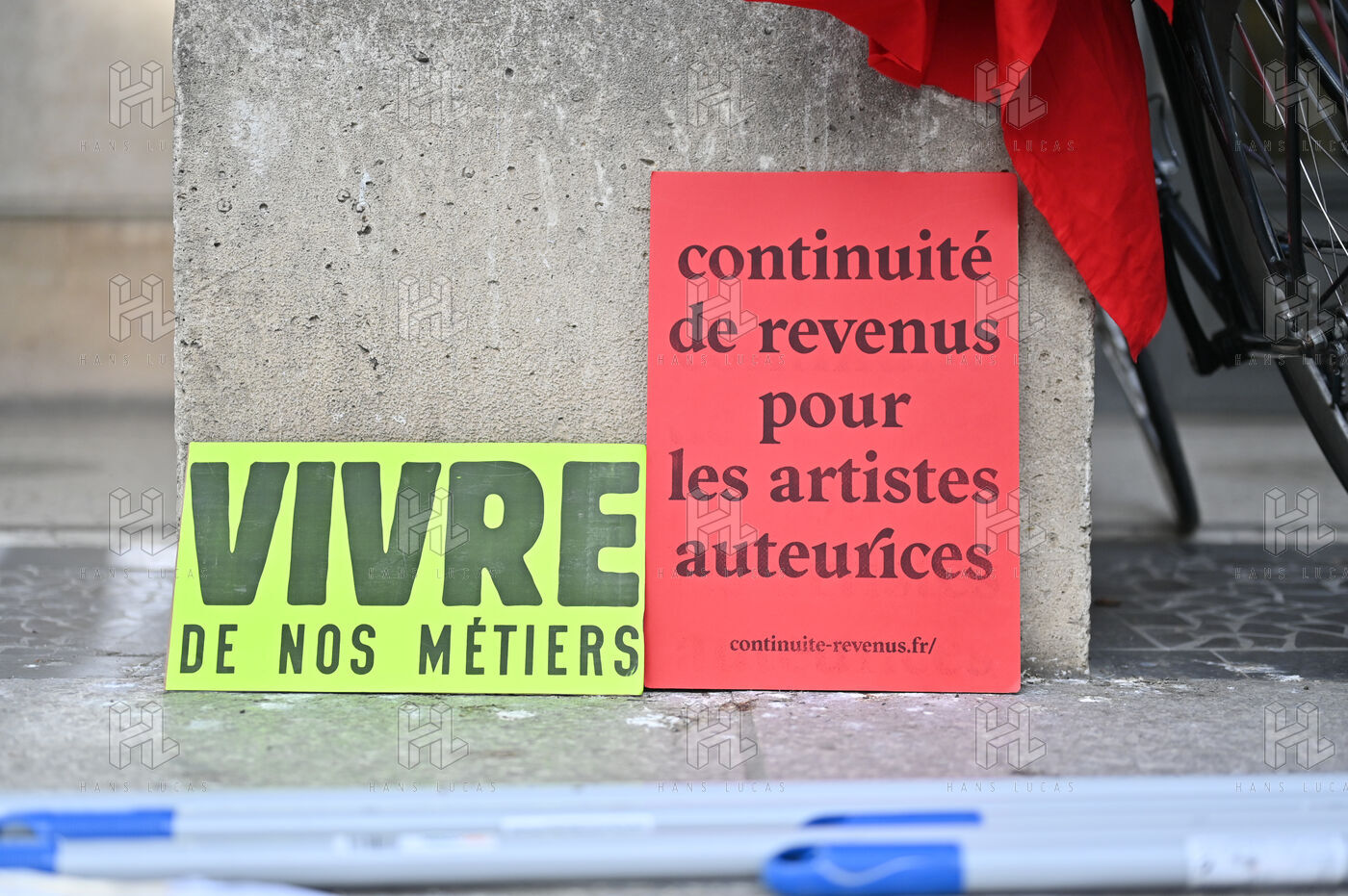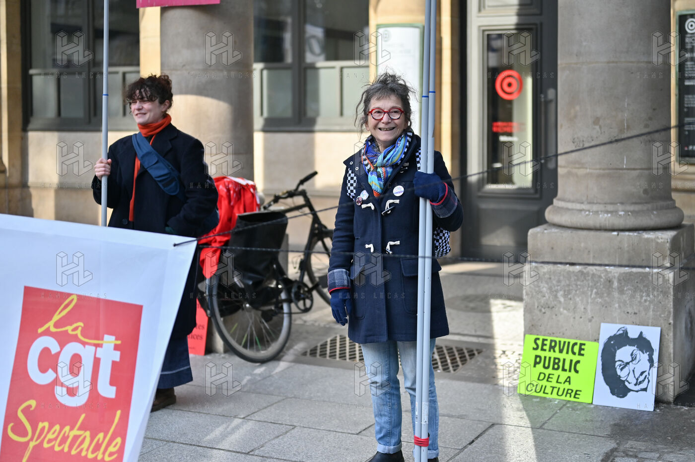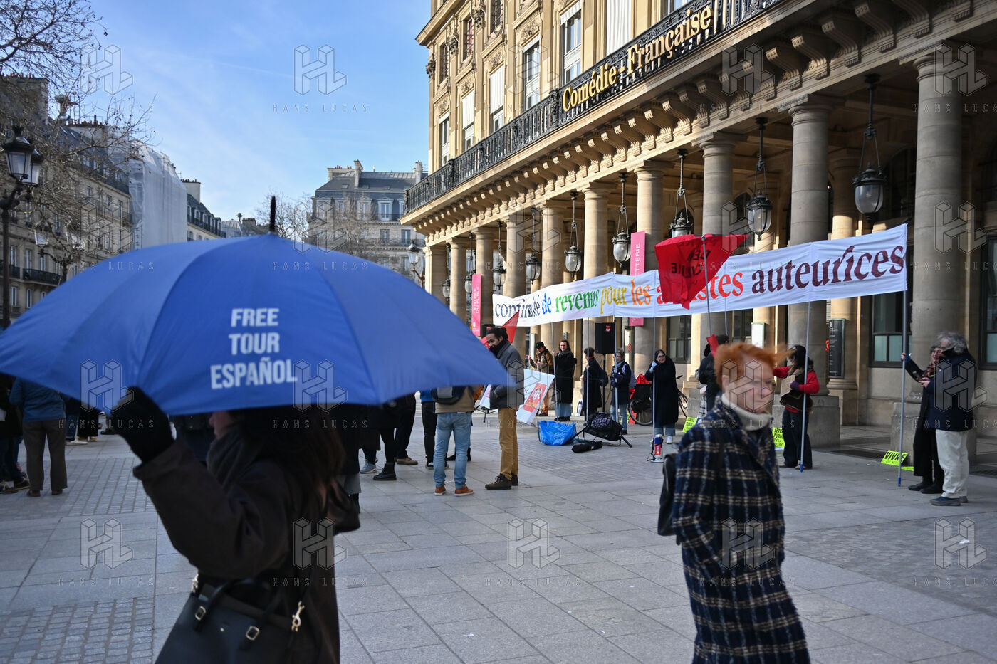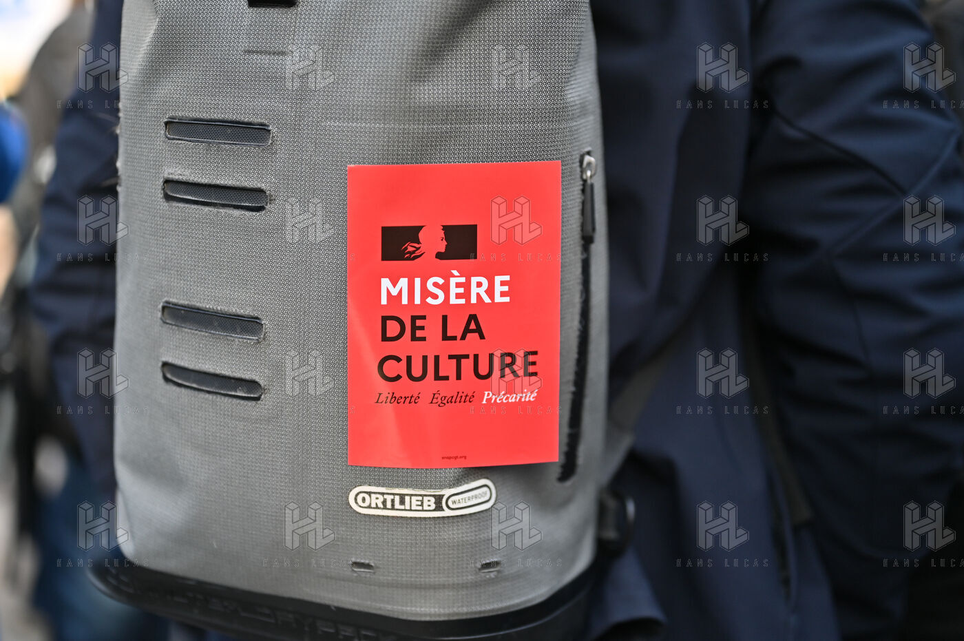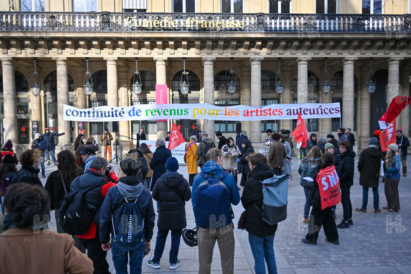 Face aux coupes budgétaires, au désengagement des acteurs publics, a la précarisation des métiers et a l affaiblissement des droits, les travailleur.ses de l art et de la culture se rassemblent place Colette, devant la Comédie Francaise.