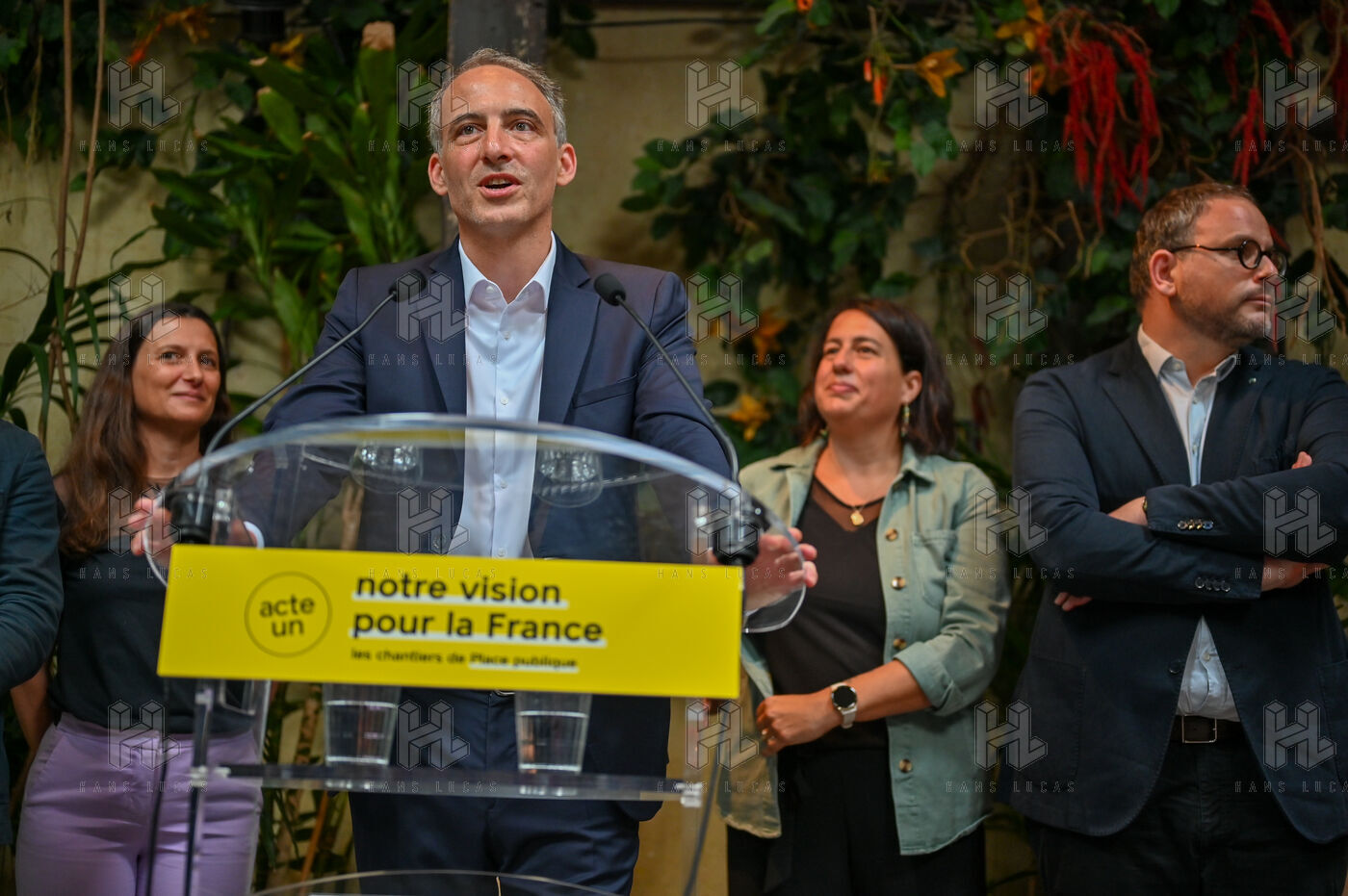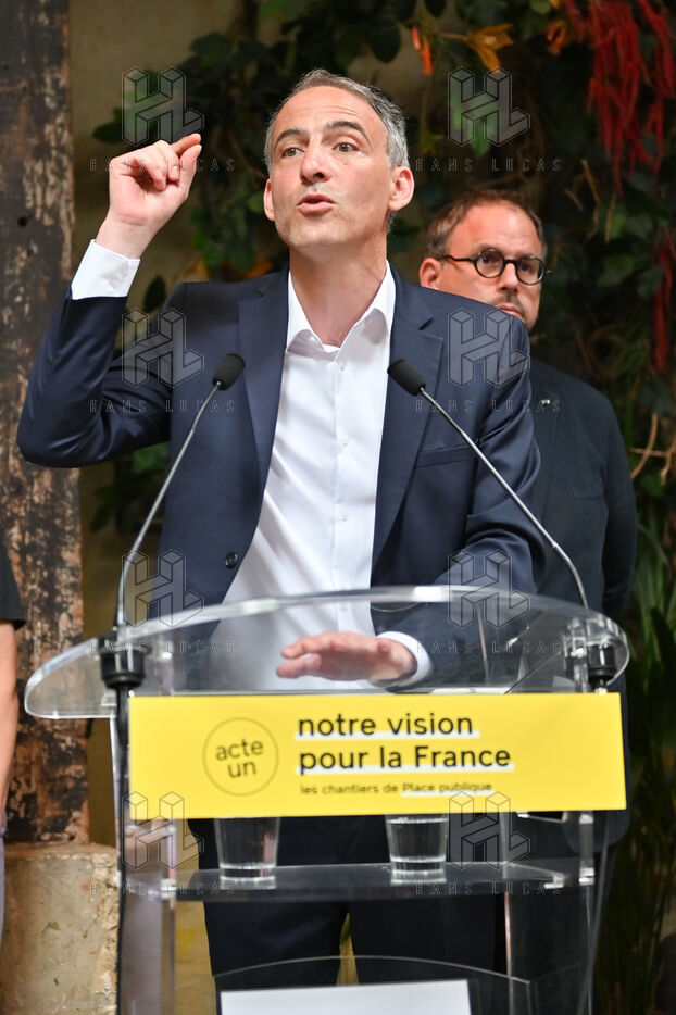 Raphael Glucksmann présente le programme de son parti Place publique lors d'une conférence de presse organisée au Comptoir general.