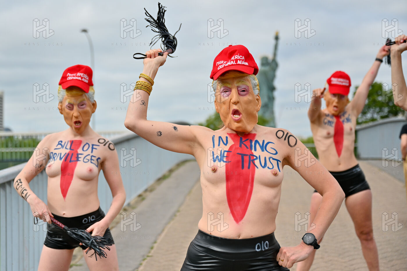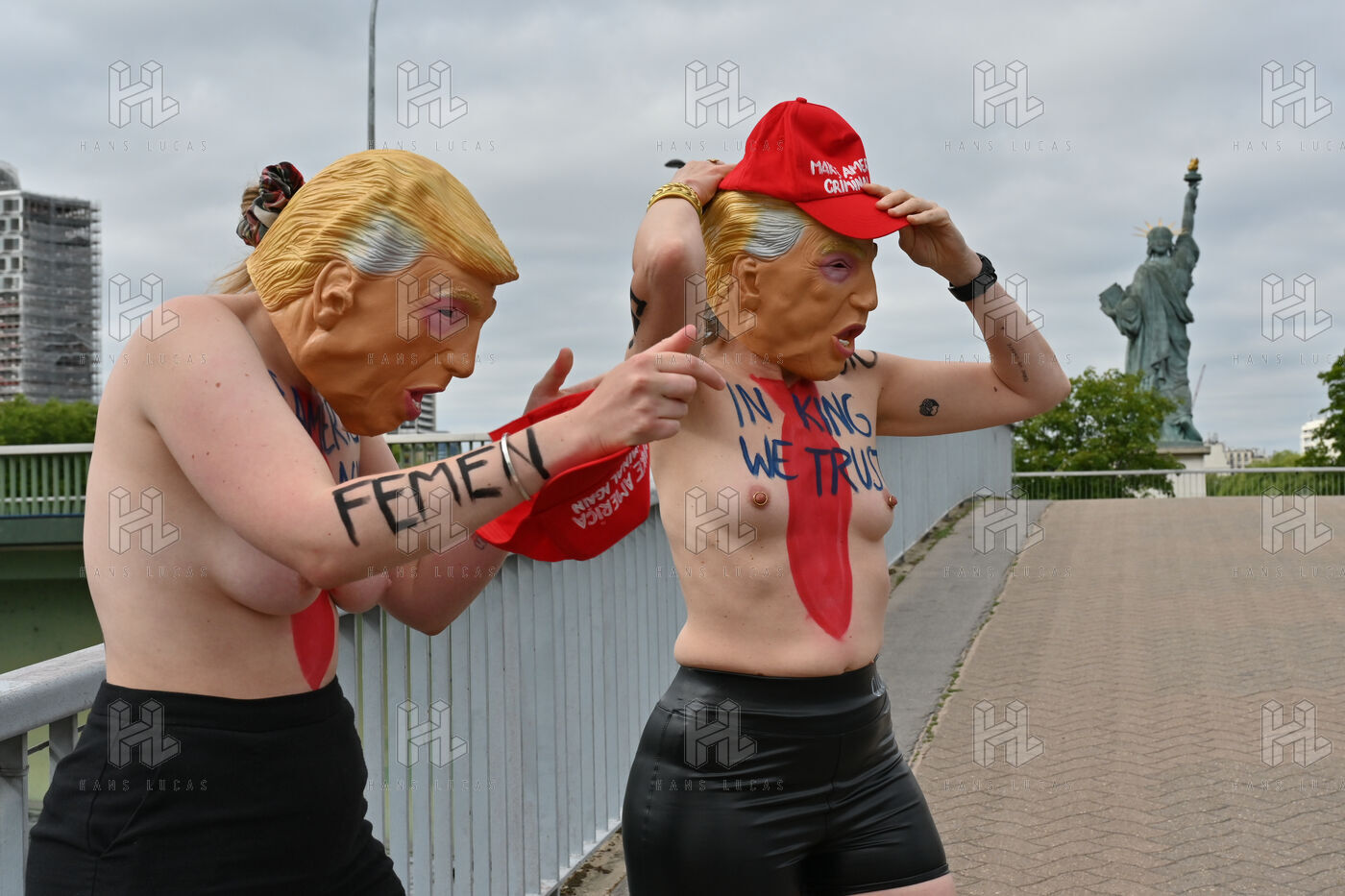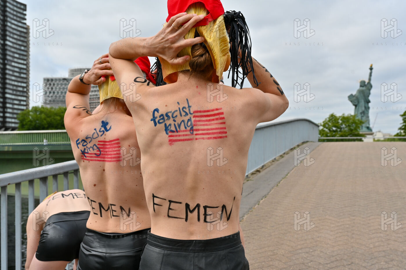 Cinq activistes du mouvement FEMEN ont mené une action militante à Paris, ce 4 juillet 2025, jour de la fête nationale américaine. Déguisées en Donald Trump, elles ont mis en scène une performance contre la politique jugée autocratique du président des États-Unis. Munies de fouets, elles ont pris pour cible la statue de la Liberté, symbole franco-américain. Leur message : « Make America Criminal Again ! »
