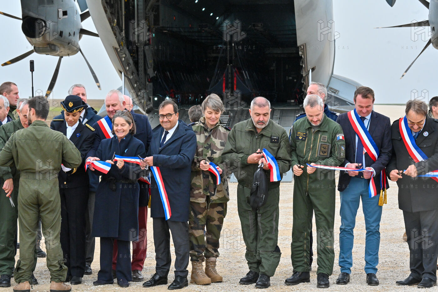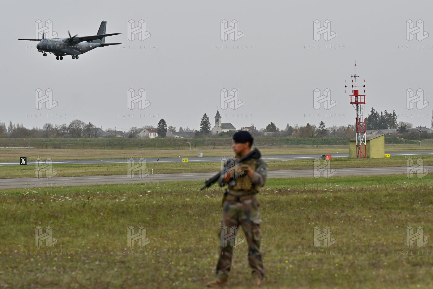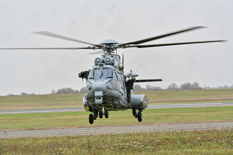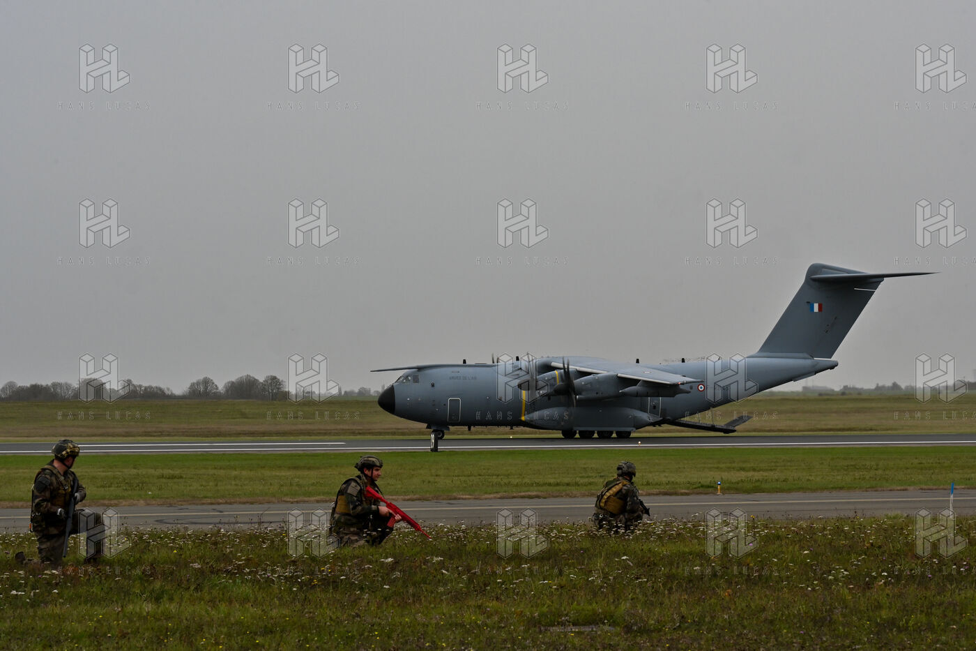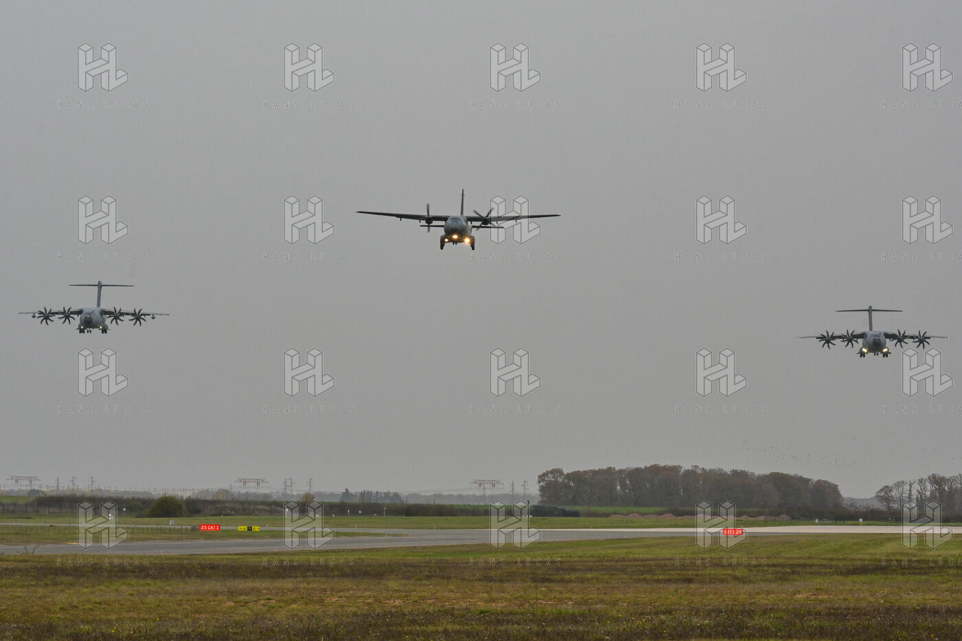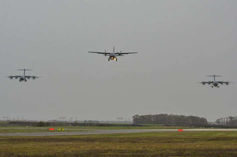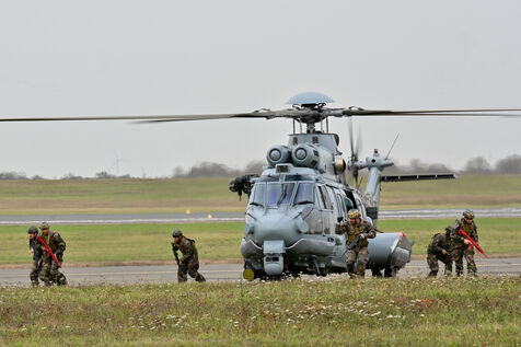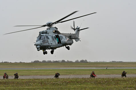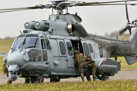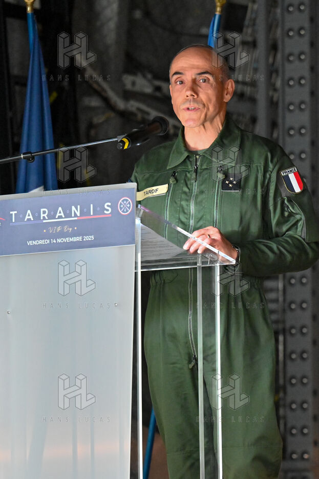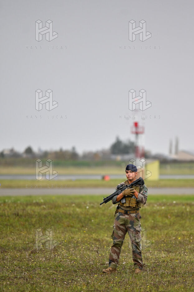 The Taranis exercise takes place at Air Base 123 Orleans Bricy, where transport aircraft and helicopters carry out maneuvers to strengthen crew tactical expertise in an increasingly tense geopolitical context. This full scale training aims to improve the skills of pilots mechanics and ground technicians facing high intensity scenarios and hybrid threats. In the sky A400M large grey military transport aircraft fly over the Orleans Bricy air base France.