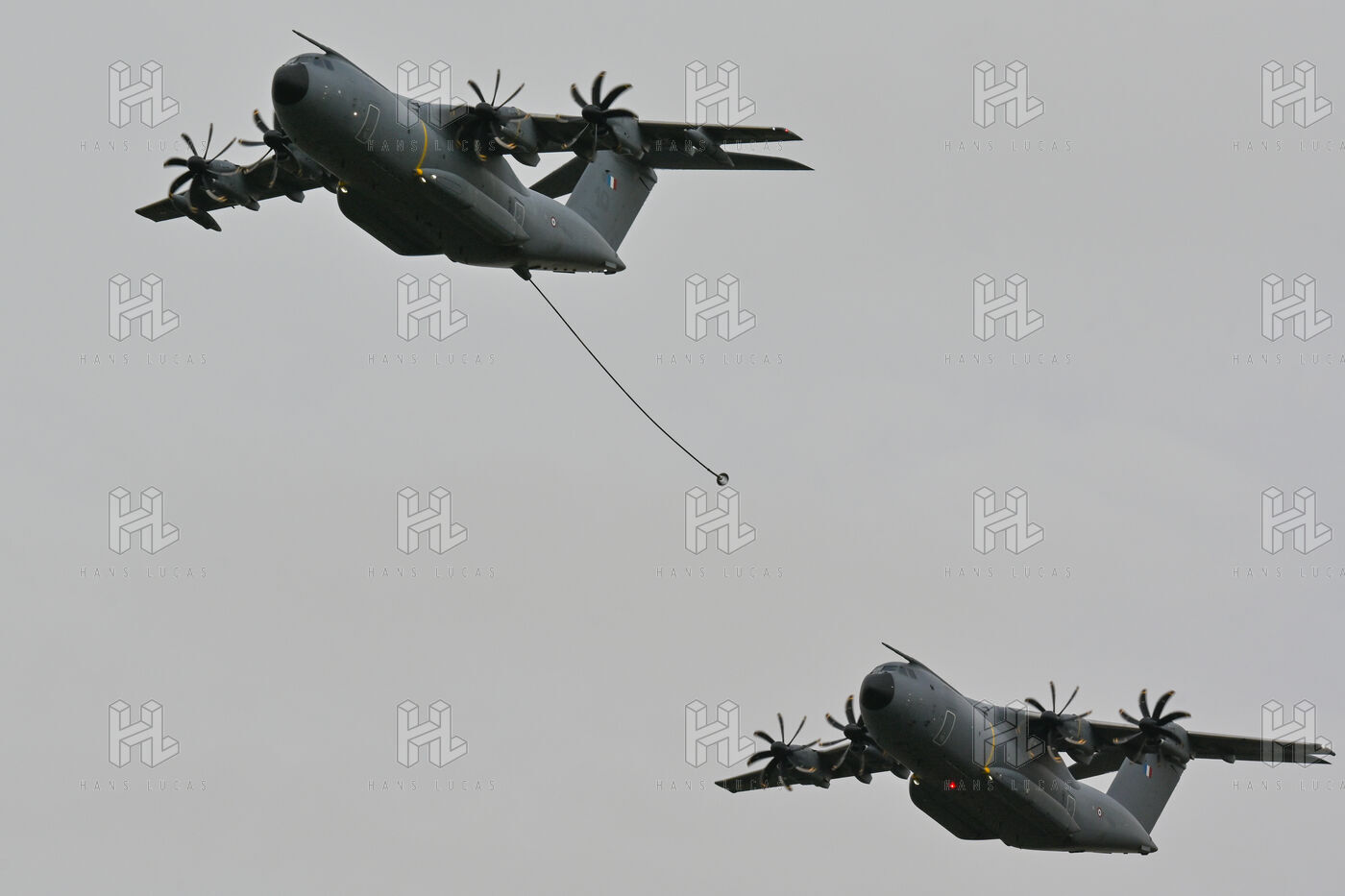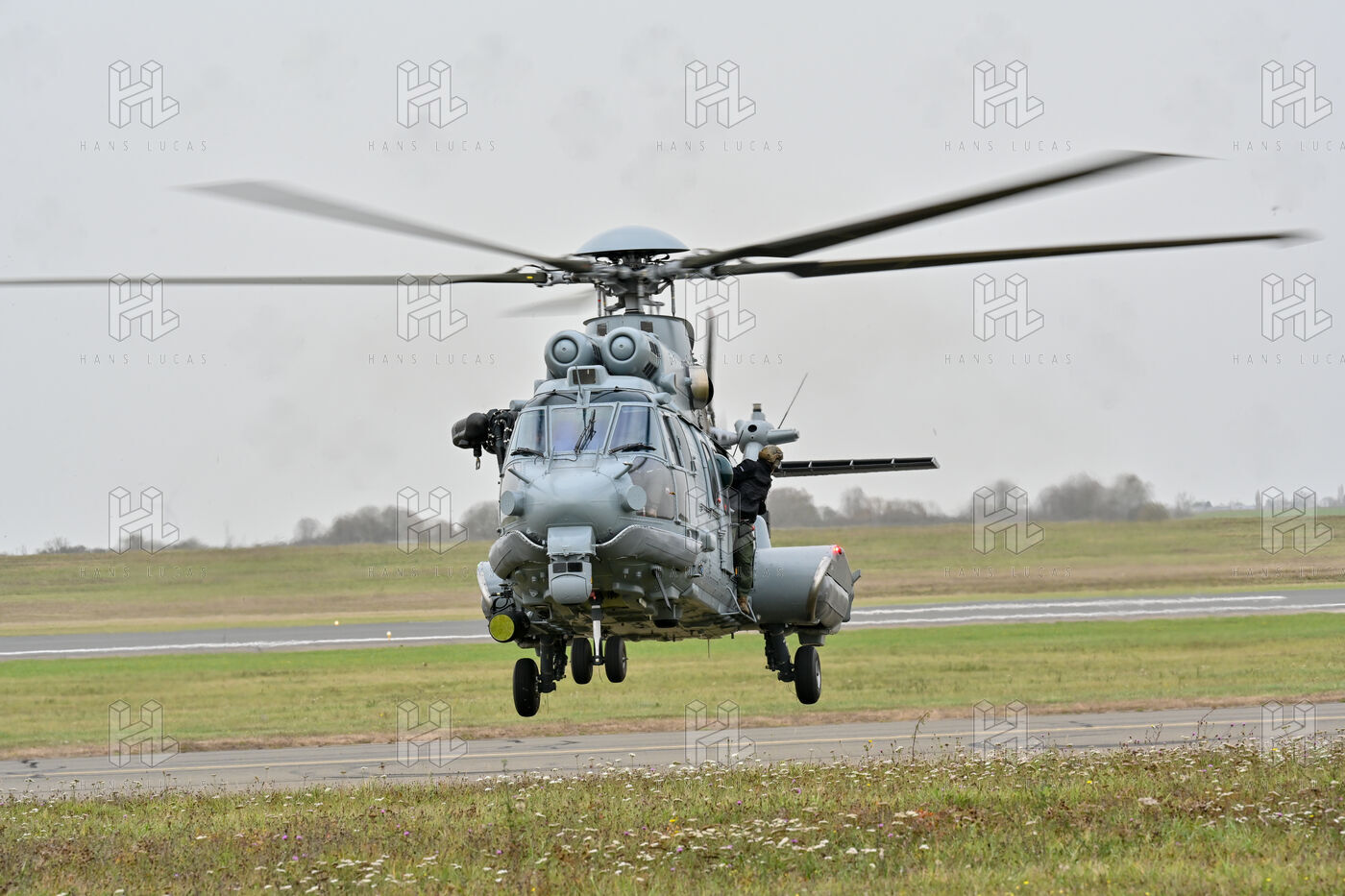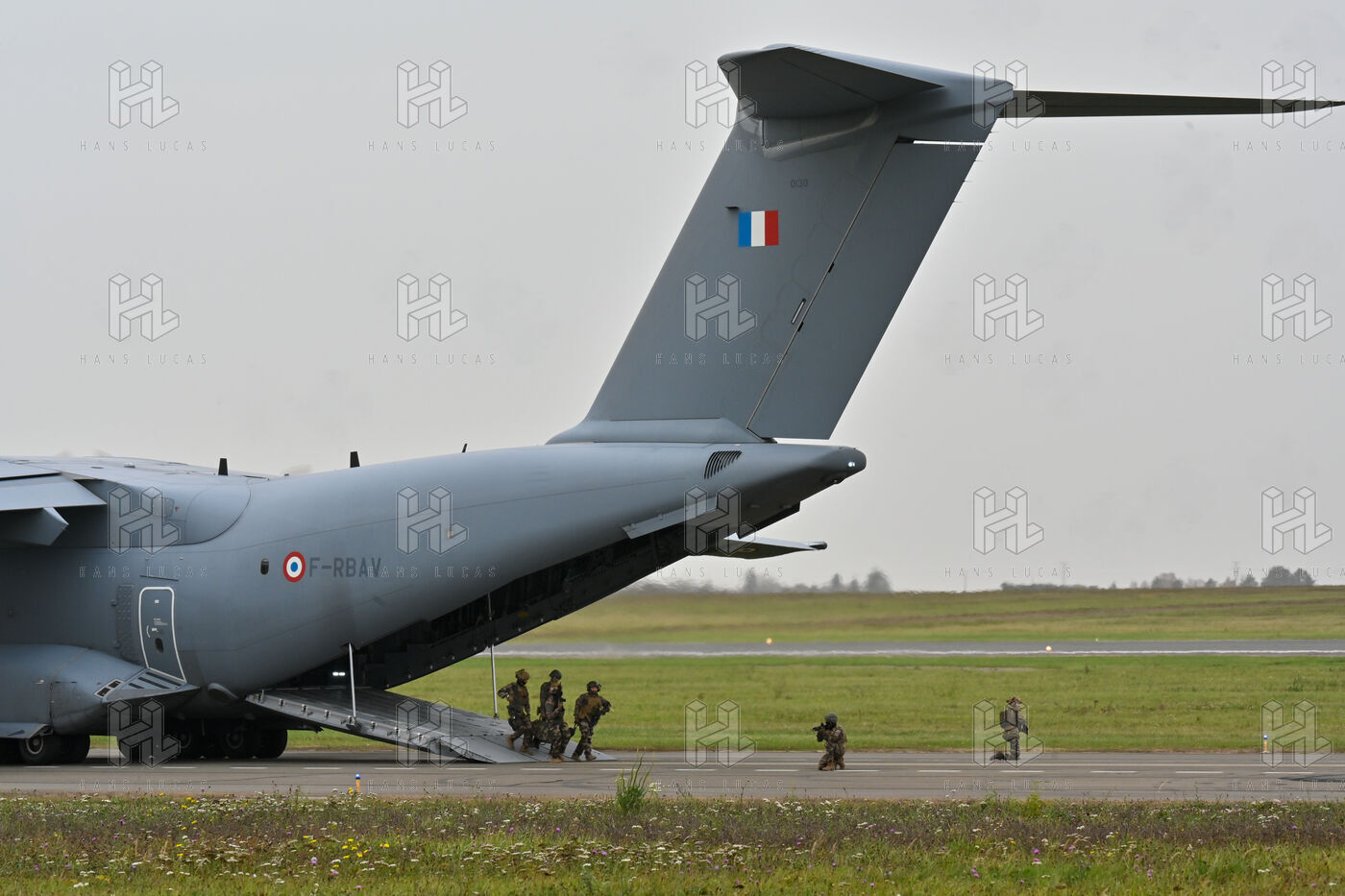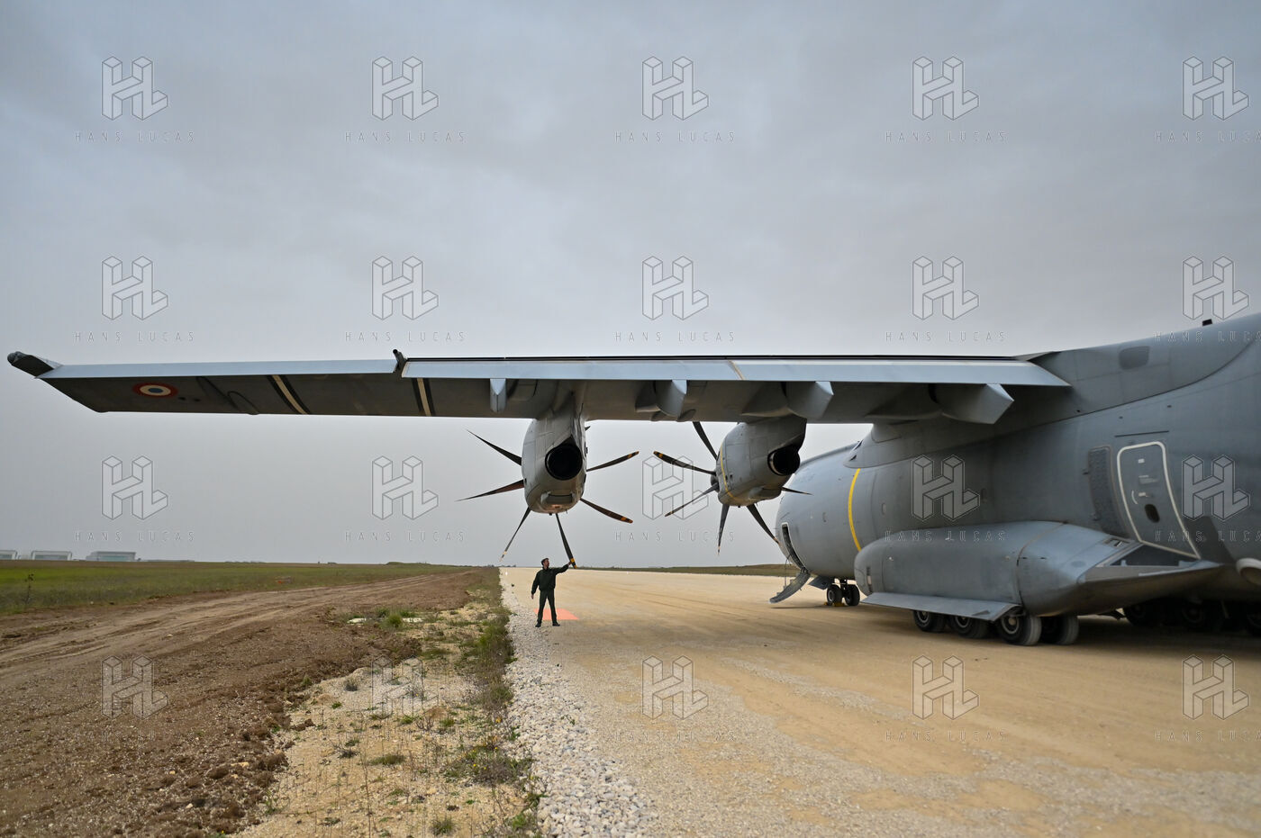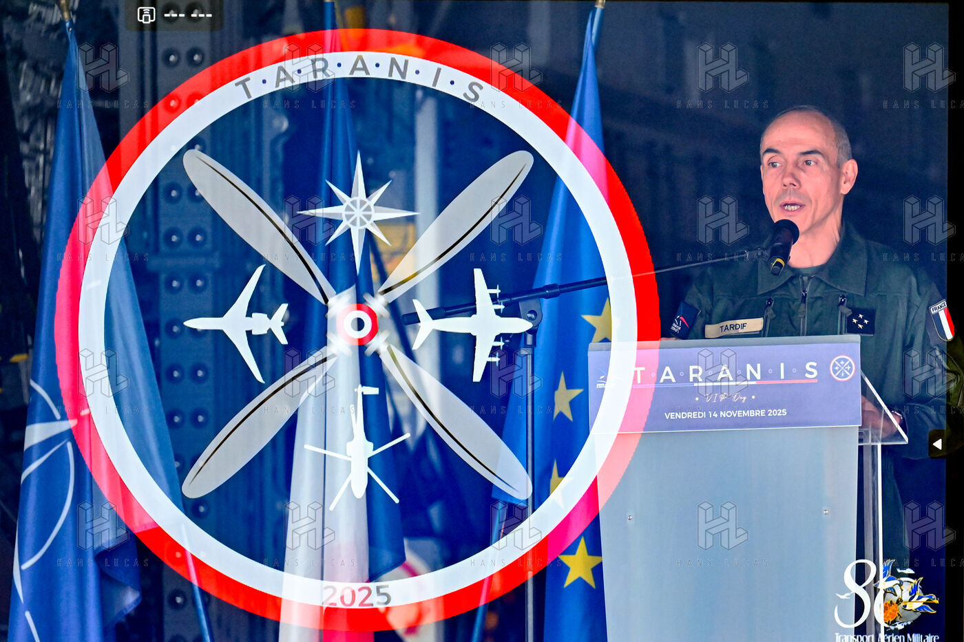 The Taranis exercise takes place at Air Base 123 Orleans Bricy, where transport aircraft and helicopters carry out maneuvers to strengthen crew tactical expertise in an increasingly tense geopolitical context. This full scale training aims to improve the skills of pilots mechanics and ground technicians facing high intensity scenarios and hybrid threats. In the sky A400M large grey military transport aircraft fly over the Orleans Bricy air base France.