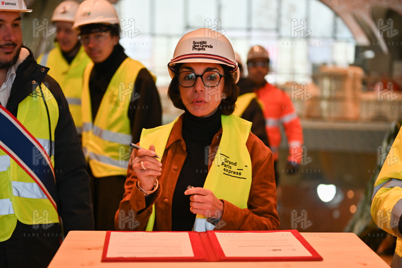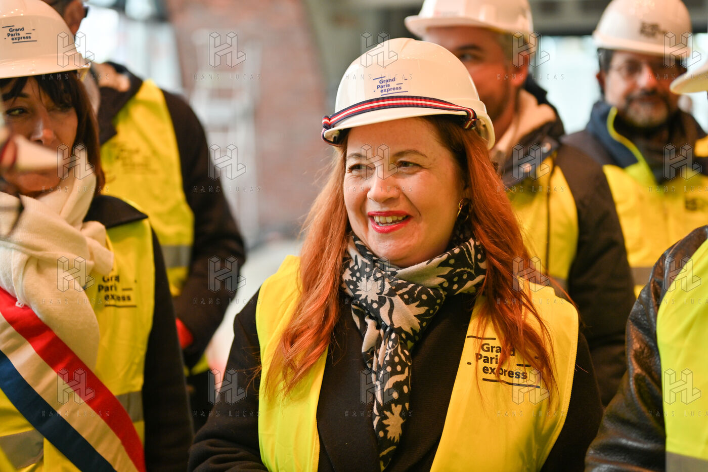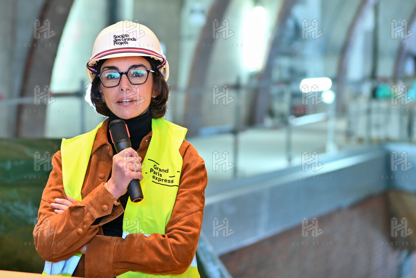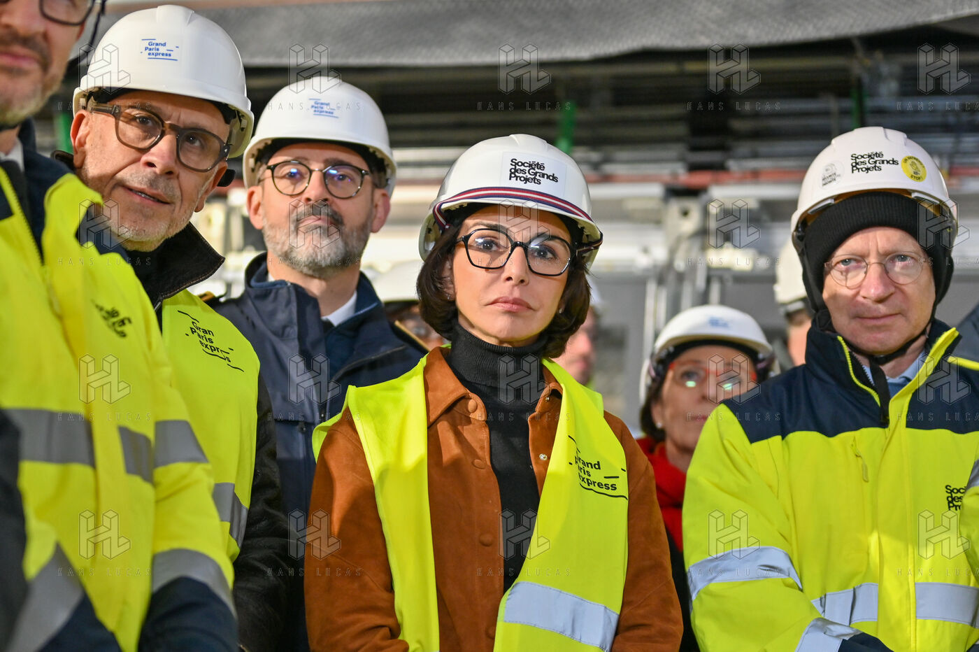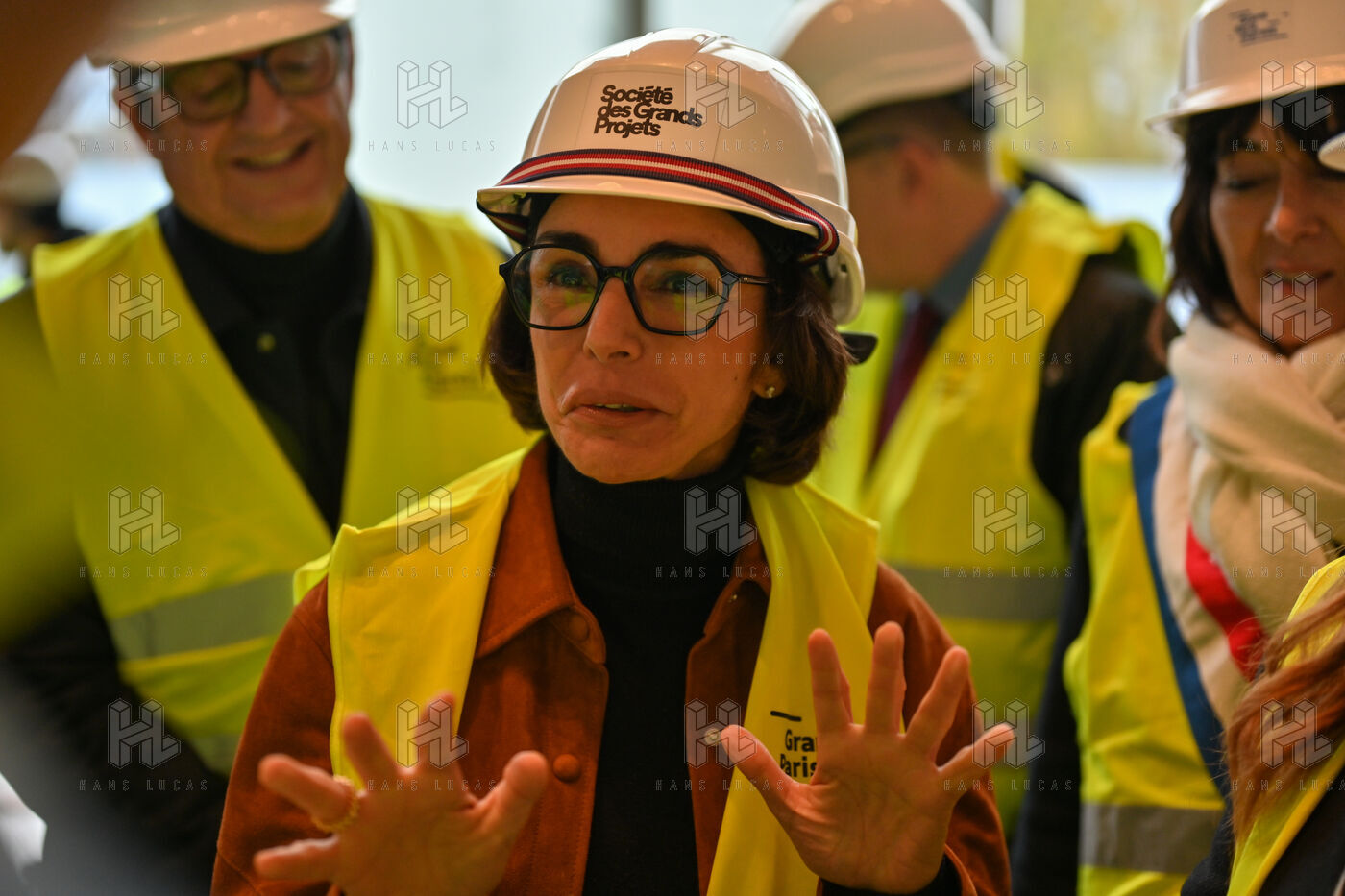 French Culture Minister Rachida Dati visits the construction site of the future La Courneuve station, a key project of the Grand Paris Express, in La Courneuve.