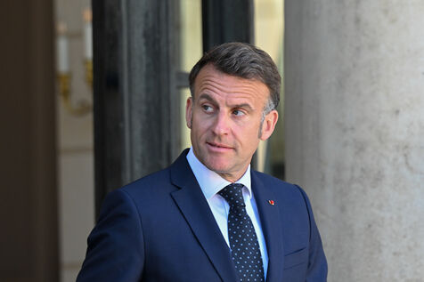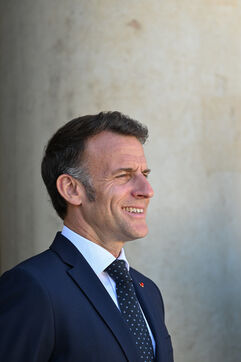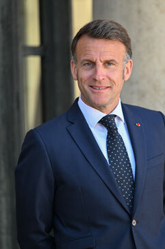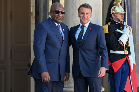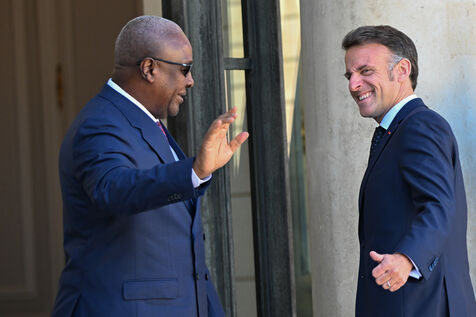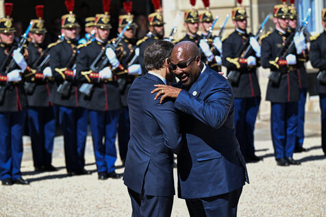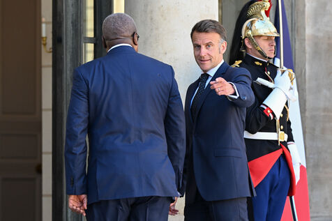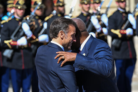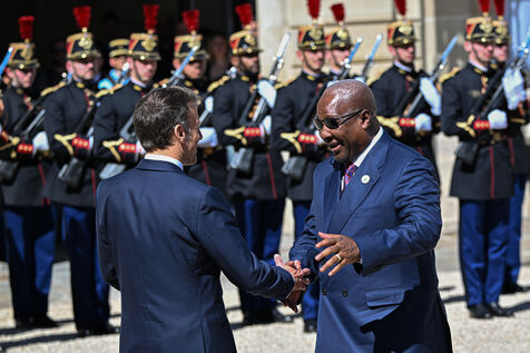 Emmanuel Macron, President of the French Republic, poses with John Dramani Mahama, President of the Republic of Ghana, for photographers at the Elysee Palace, in Paris.
