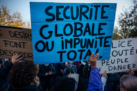 Paris, November 28, 2020. The March of Liberties against the "global security" law is organized between Place de République and Place de la Bastille to denounce the proposed "global security" law, especially article 24 prohibiting any person from disseminating "the image of the face or any other element of identification of a police officer" and to denounce police violence.