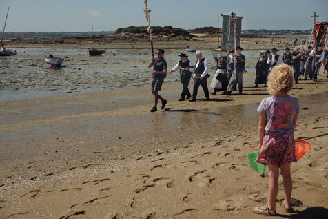 Le dimanche 10 aout 2025, Pardon de l'ile Callot. Le Pardon de Notre-Dame de l ile Callot est un pèlerinage catholique annuel. Il réunit des centaines de fidèles, souvent en costumes bretons, dans une procession depuis le port de Carantec jusqu'à la petite chapelle dressée au point culminant de l'ile . 2025 08 10, CARANTEC, France.