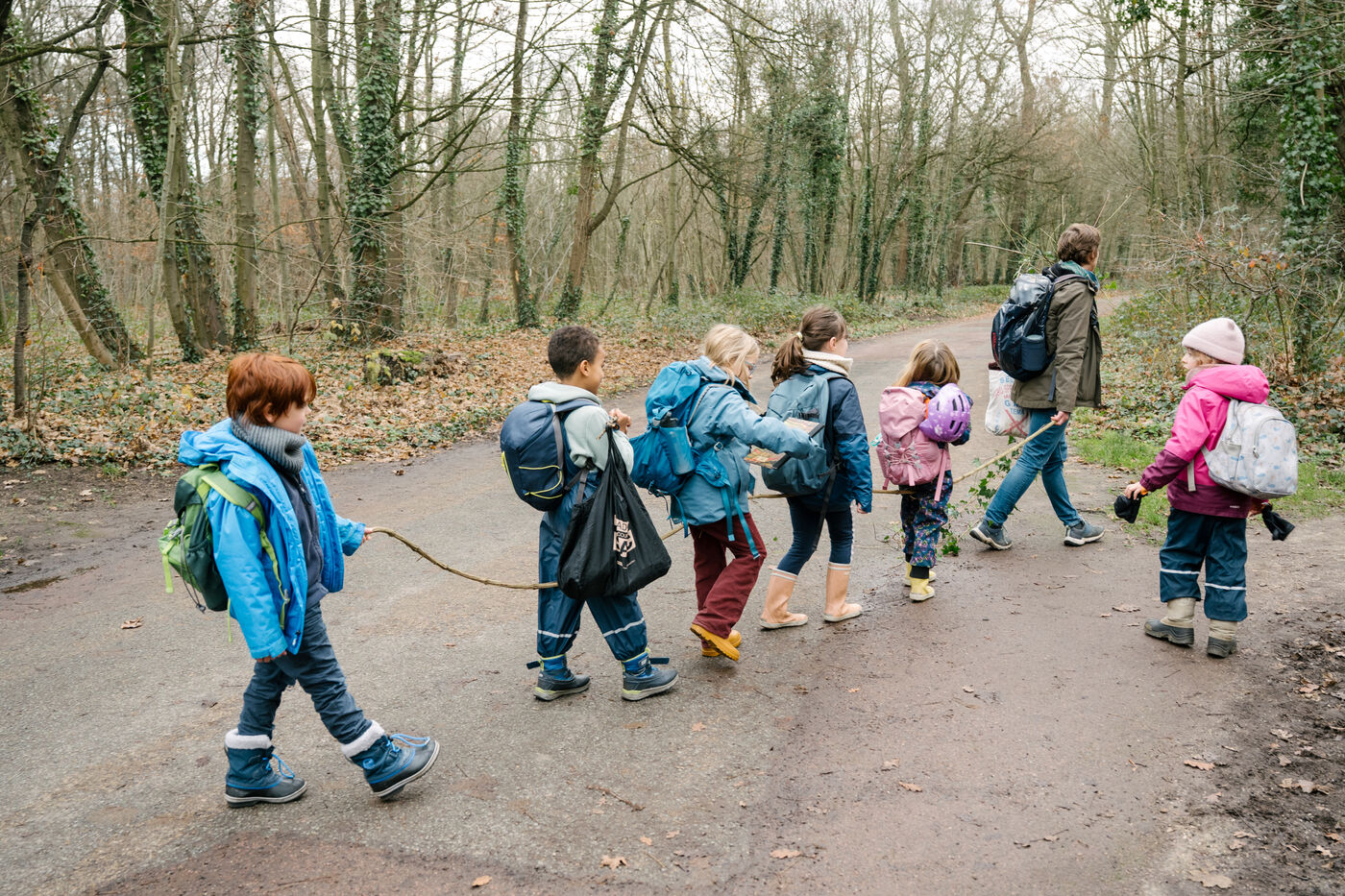Les Mercredis Buissonniers in the Bois de Vincennes near Paris. The initiative offers urban children time in nature to explore, play and learn about forest biodiversity. VINCENNES, France, Dec 17, 2025.