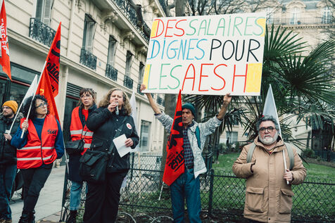 Gathering in front of the Ministry of National Education, Rue de Grenelle, Paris, during a national strike day in education called by a coalition of unions representing teachers, AESH (accompanying staff for students with disabilities), and educational personnel. The protesters are demanding more resources and better pay for the entire education community. Paris, France, January 15, 2026.