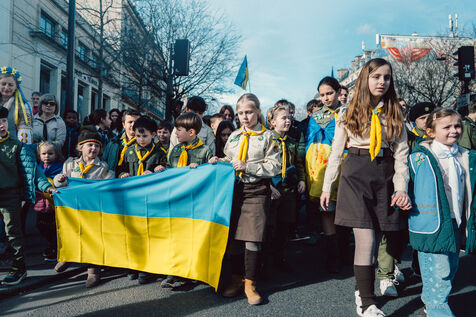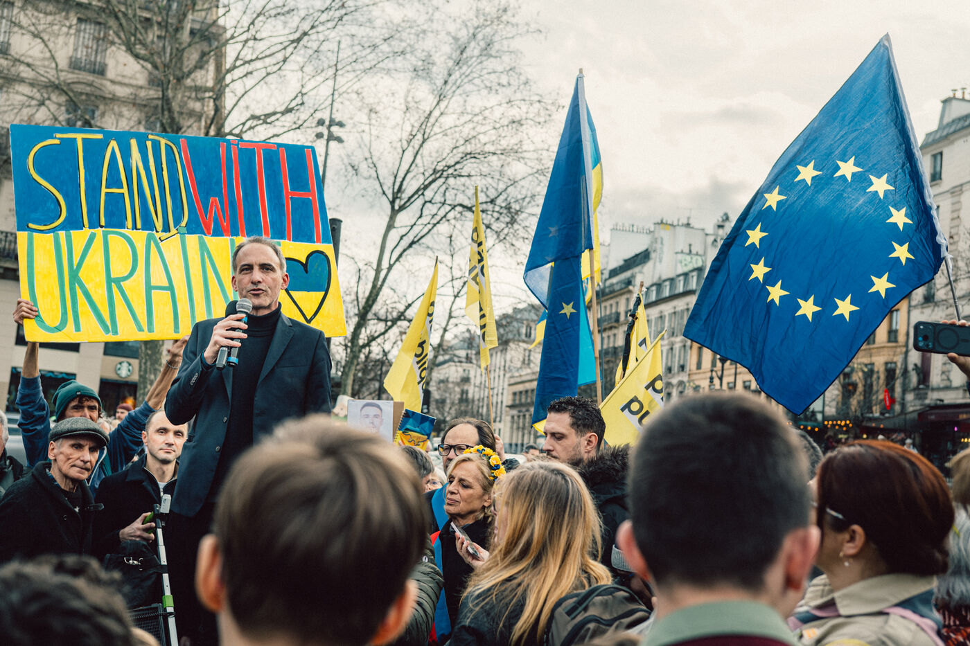 Large gathering and demonstration of solidarity with Ukraine, ahead of February 24, the anniversary of Russia s military attack on several fronts in 2022, in Paris, Ile-de-France (France), on February 21, 2026.