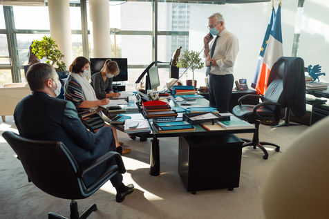 Pour faire face à l'épidémie de Covid-19 et relancer l'économie , le gouvernement a annoncé qu'il mobiliserait 100 milliards d'Euros en deux ans. Un plan de relance basé sur la cohésion (35,4 milliards d'euros), la compétitivité (34,8 milliards) et l'écologie (30,2 milliards). Immersion le temps d'une journée, à Bercy, dans les pas de Bruno Le Maire, le ministre de l'Economie et des Finances et de ses collaborateurs. Un reportage issu d'une commande pour le magazine Capital, publié en octobre 2020.