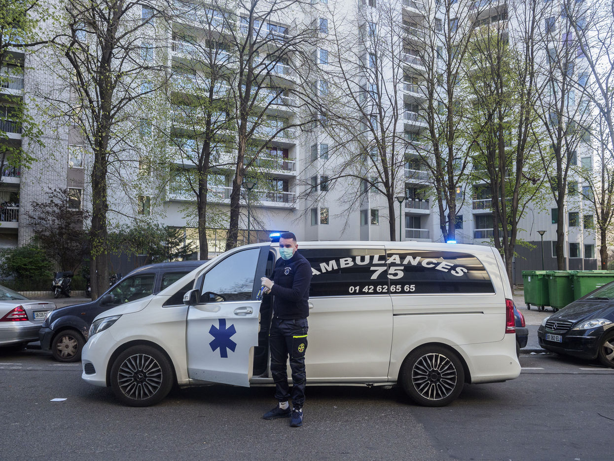 Paris 1 April 2020. Ambulances75 will search for inhabitants some of whom are suspected of being infected by Covid-19. Jawad and Othmane, paramedics, do not stop receiving texts from the SAMU to fetch inhabitants whose state of health worries. They lack the means of protection (not enough mask, no gown) and make about 15 interventions a day. They moved away from their wives to protect them.